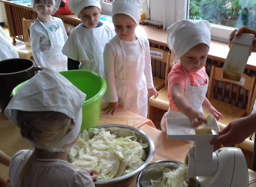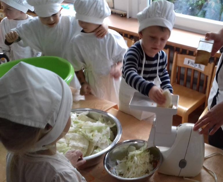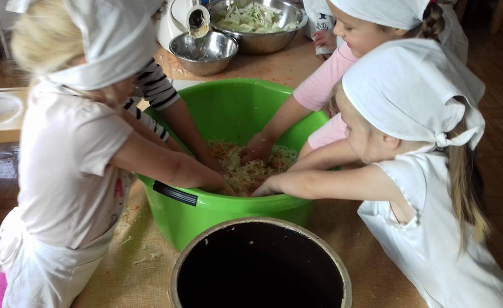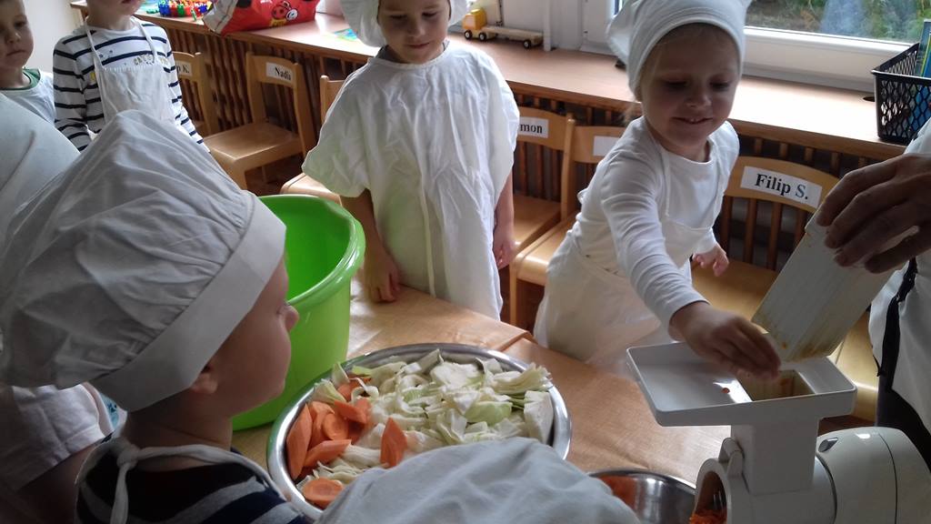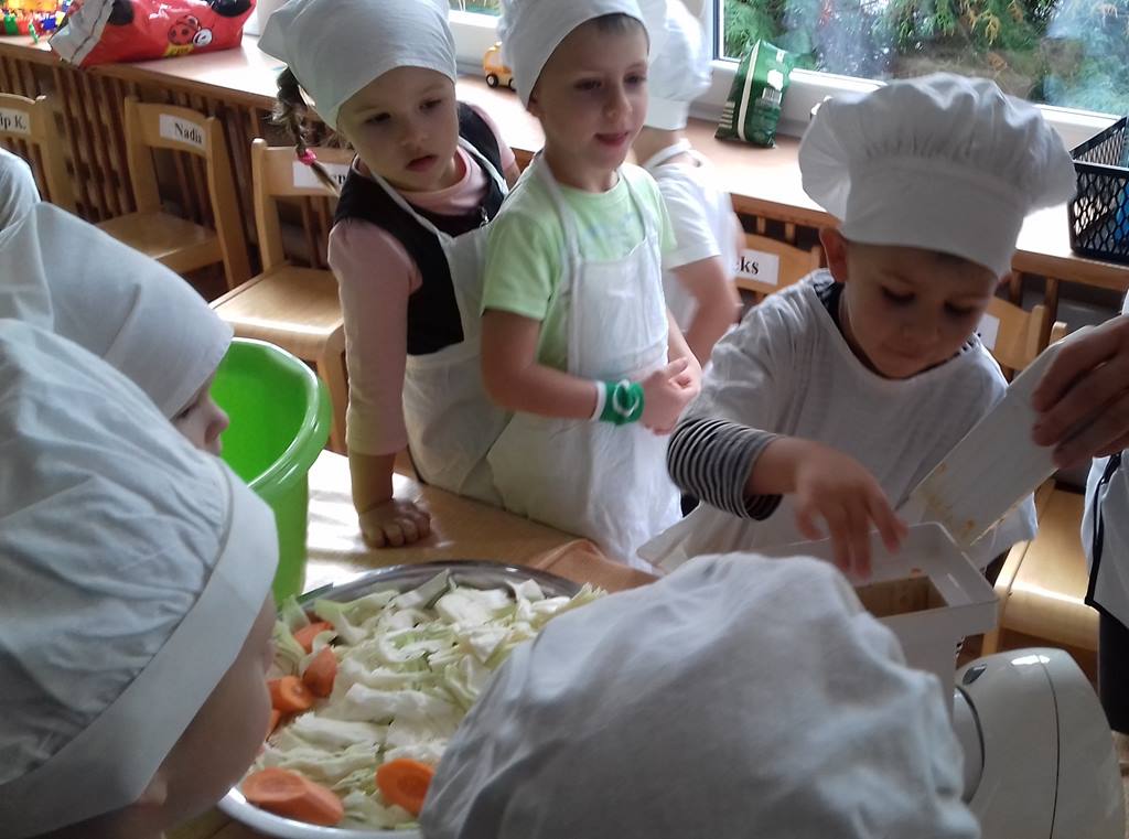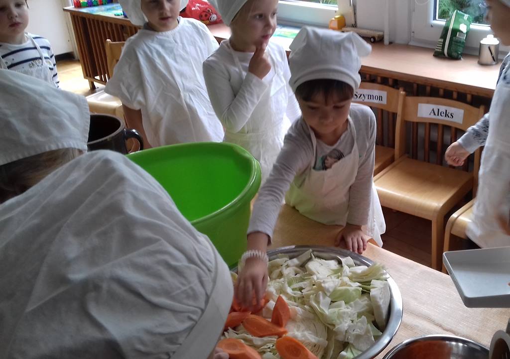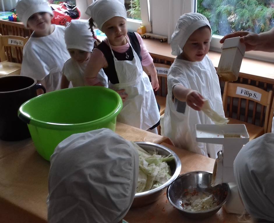 4 latki wykorzystały dary jesienne z ogrodu. Na zajęciach królowały warzywa – kapusta i marchewka. Dzieci poznały sposób kiszenia kapusty, kroiły, obierały ale niestety paluszki bolały, więc z pomocą przyszedł robot. Przygotowane warzywa spranie wymieszały i do garnka schowały. Teraz cierpliwie czekają, aż kapustę kiszoną skosztują!