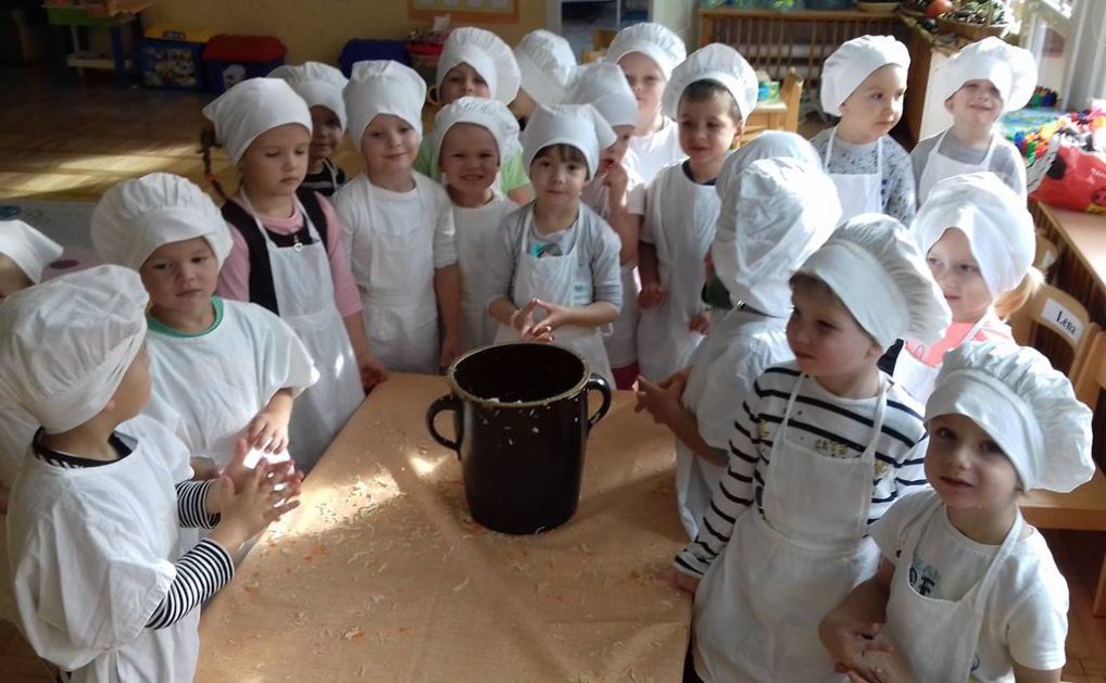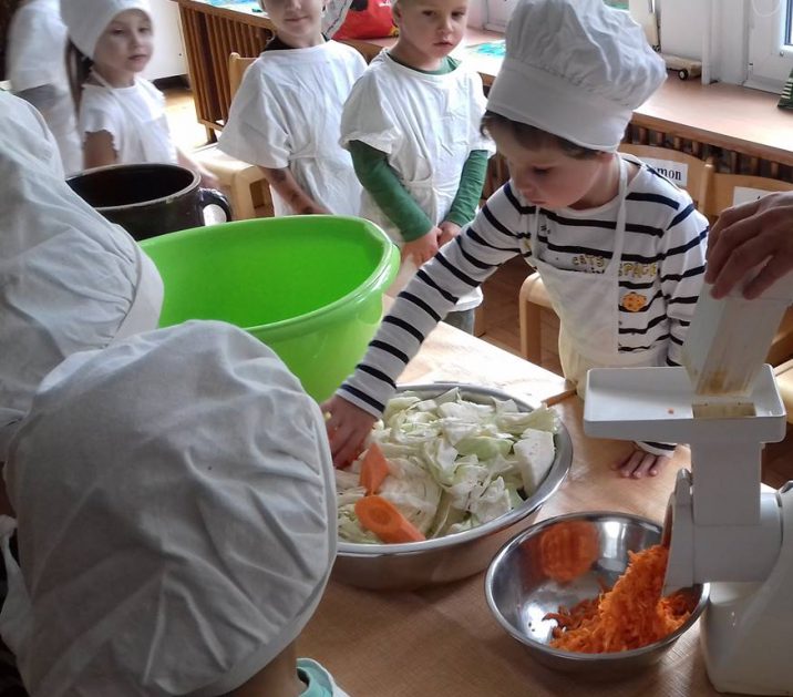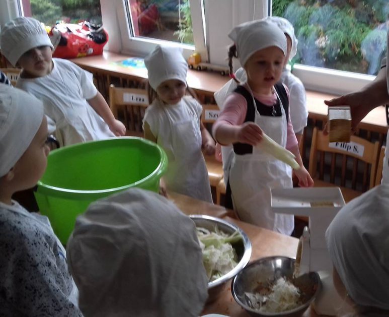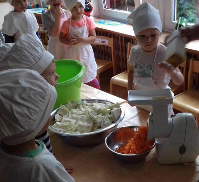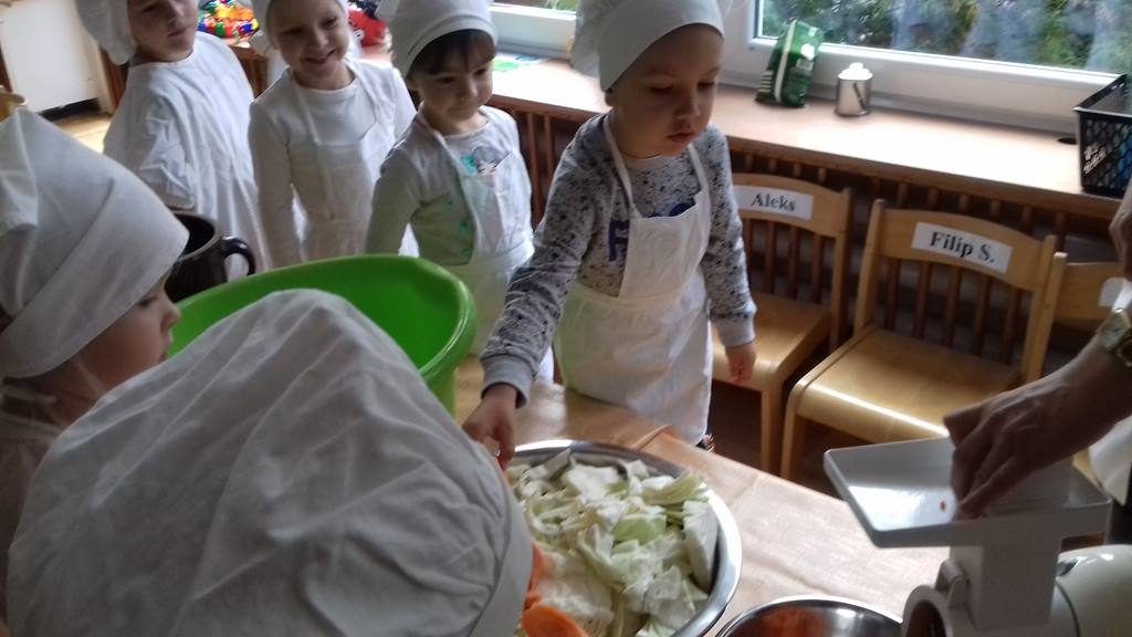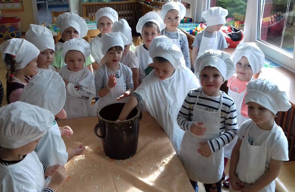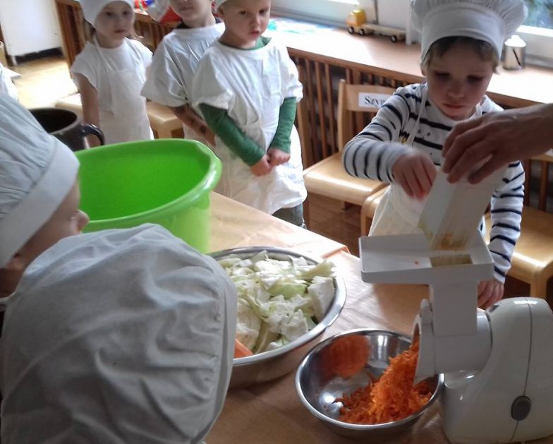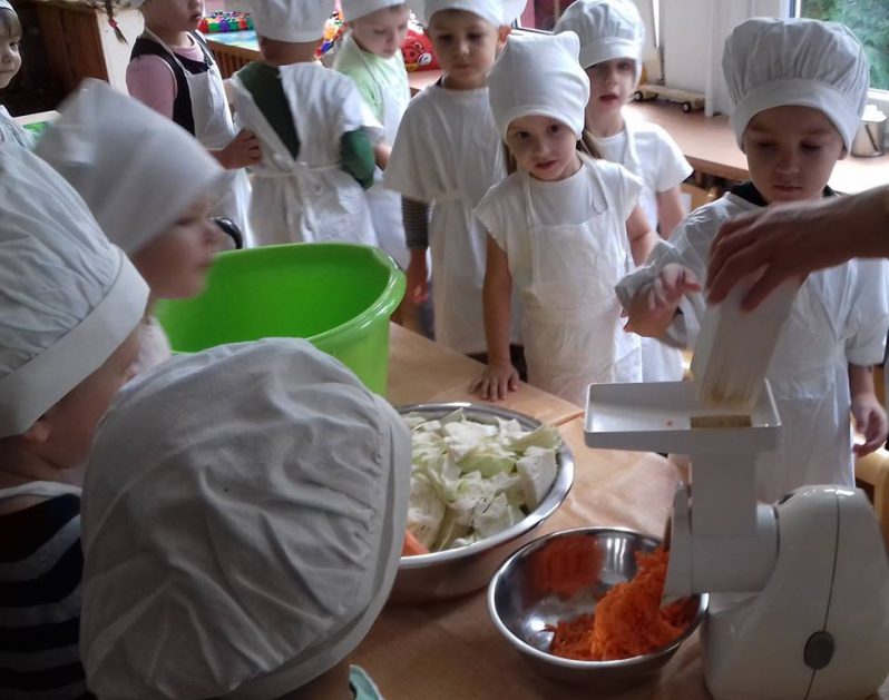 4 latki wykorzystały dary jesienne z ogrodu. Na zajęciach królowały warzywa – kapusta i marchewka. Dzieci poznały sposób kiszenia kapusty, kroiły, obierały ale niestety paluszki bolały, więc z pomocą przyszedł robot. Przygotowane warzywa spranie wymieszały i do garnka schowały. Teraz cierpliwie czekają, aż kapustę kiszoną skosztują!