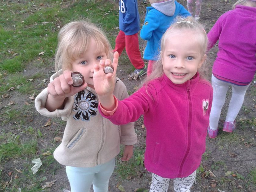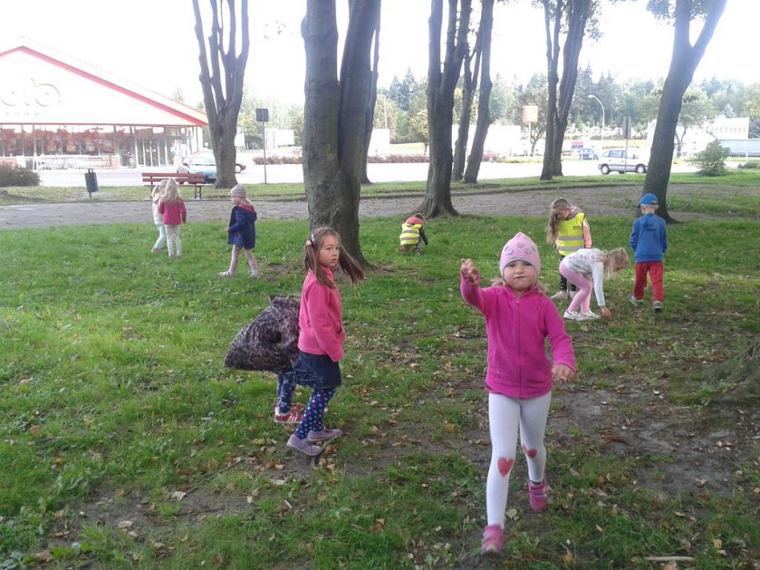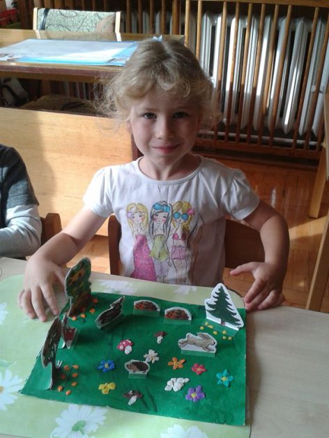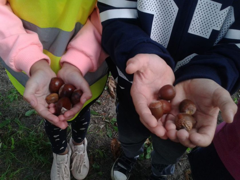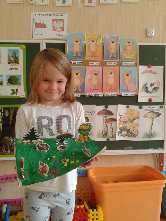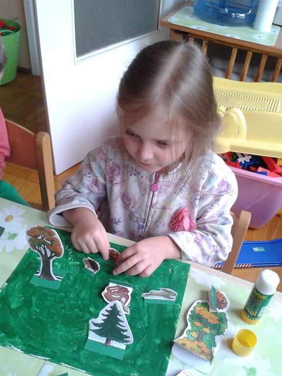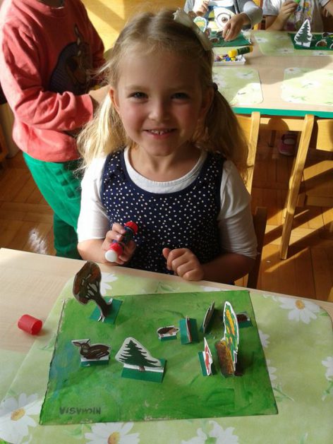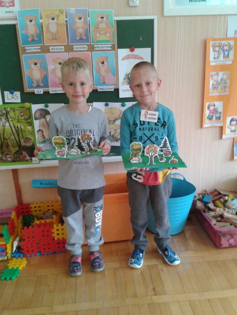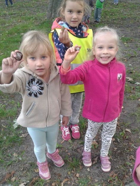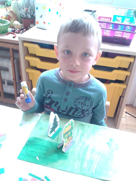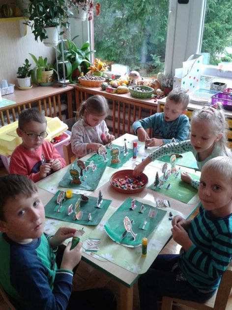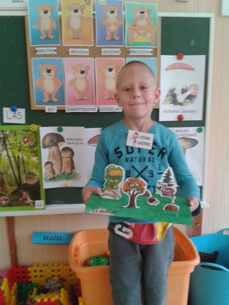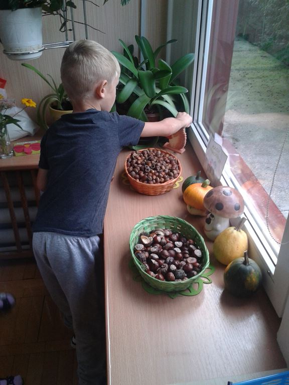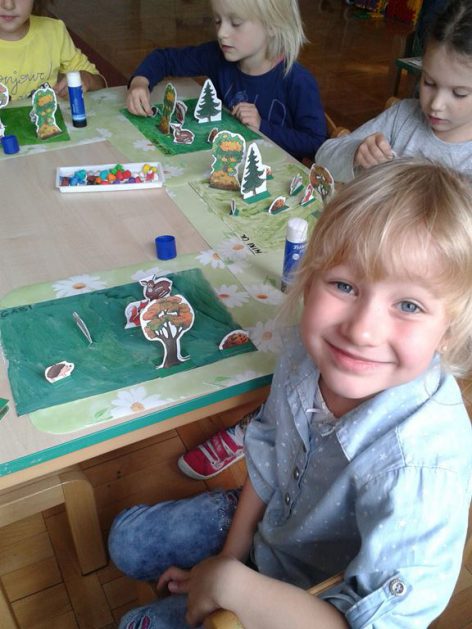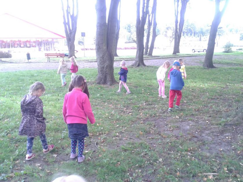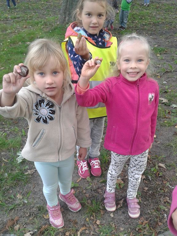 5-latki wraz z p. Kasią udały się na spacer w poszukiwaniu pierwszych oznak jesieni. Dzieci poznały środowisko przyrodnicze jakim jest park, zebrały jesienne skarby, a w drodze powrotnej świetnie bawiły się na placu zabaw. Przyniesione dary zostały starannie posegregowane i ułożone w kąciku przyrody. Zwieńczeniem zajęć o tematyce jesiennej było stworzenie makiety lasu, co sprawiło dzieciom wiele frajdy.