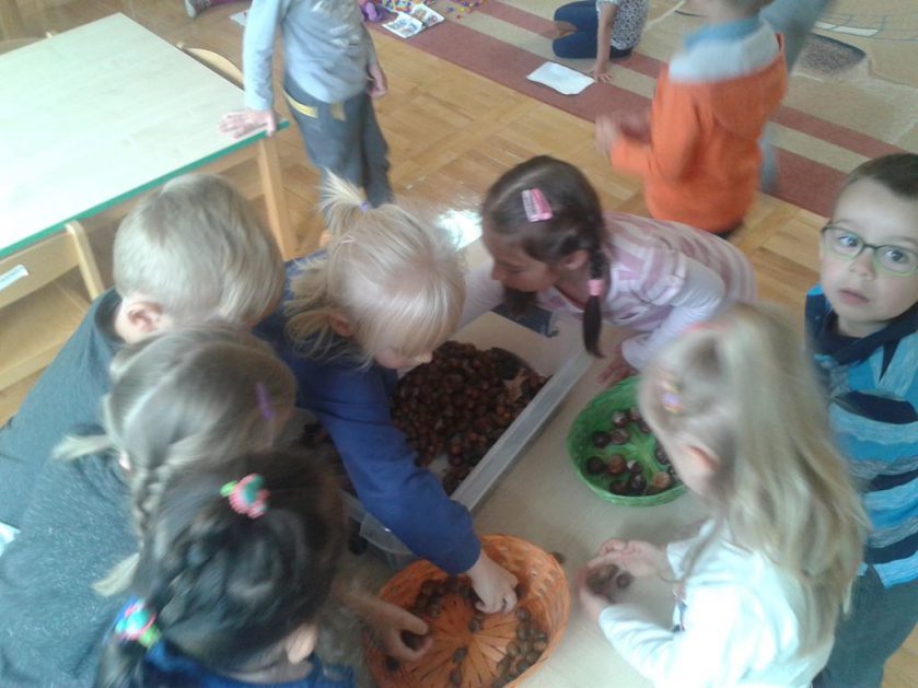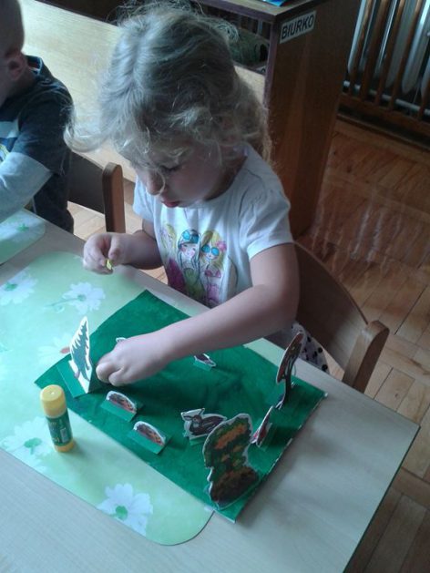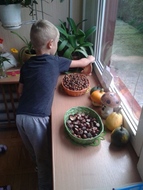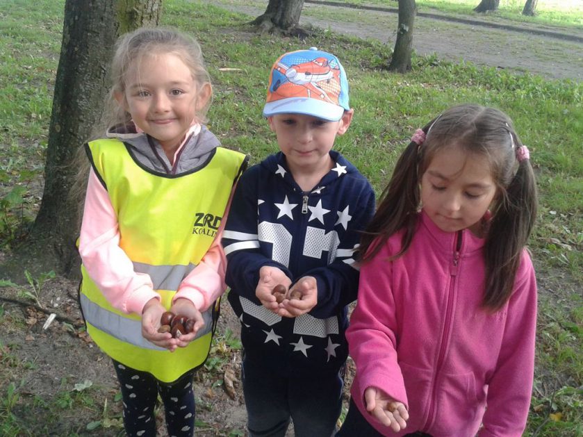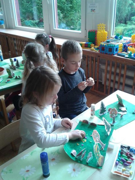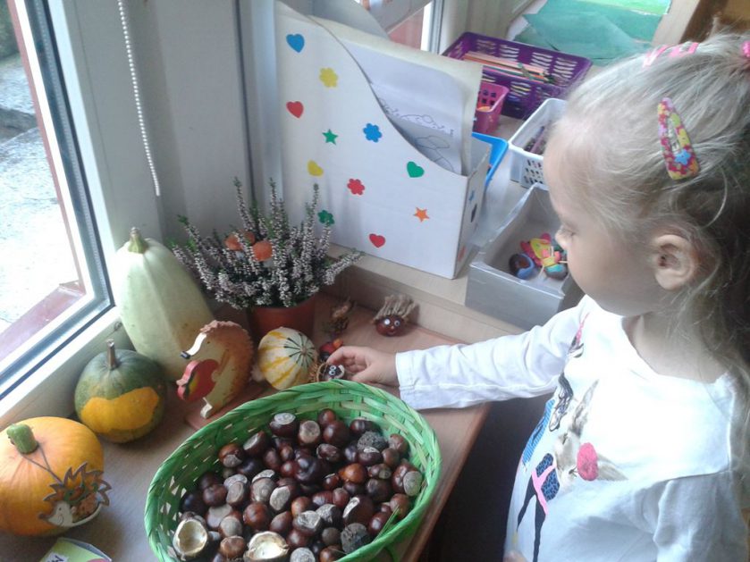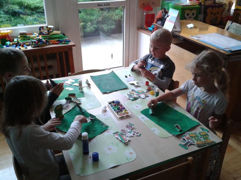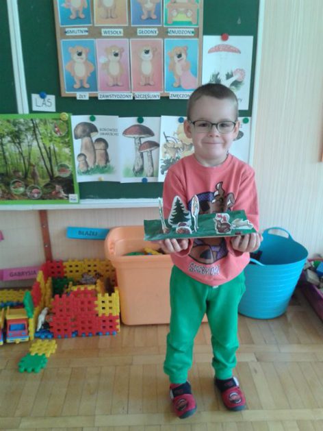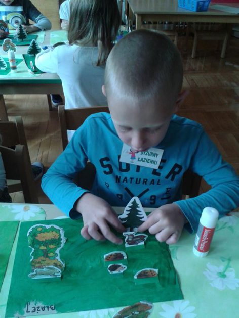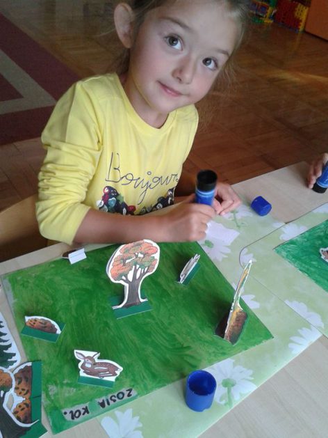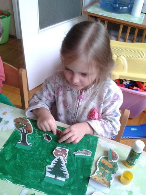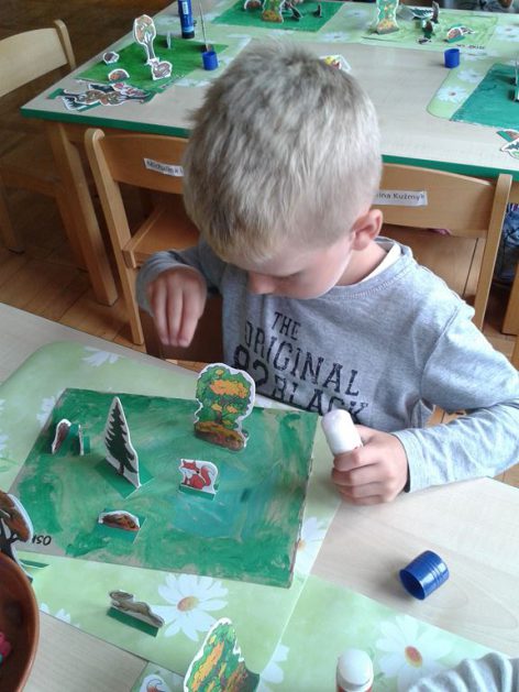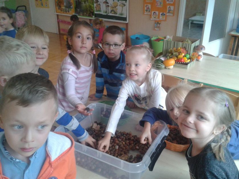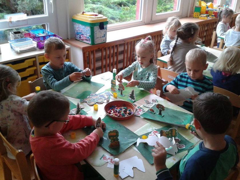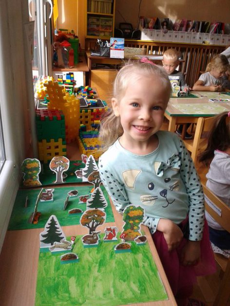 5-latki wraz z p. Kasią udały się na spacer w poszukiwaniu pierwszych oznak jesieni. Dzieci poznały środowisko przyrodnicze jakim jest park, zebrały jesienne skarby, a w drodze powrotnej świetnie bawiły się na placu zabaw. Przyniesione dary zostały starannie posegregowane i ułożone w kąciku przyrody. Zwieńczeniem zajęć o tematyce jesiennej było stworzenie makiety lasu, co sprawiło dzieciom wiele frajdy.