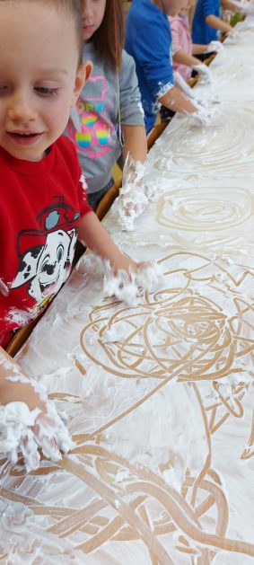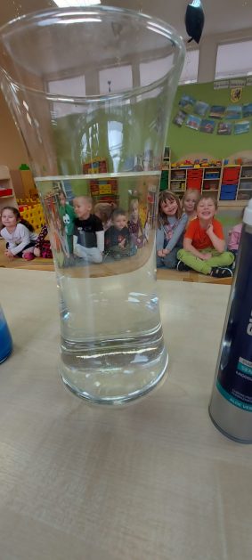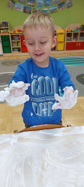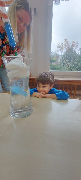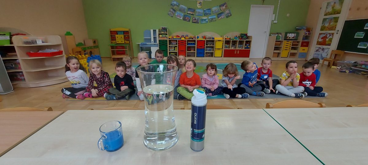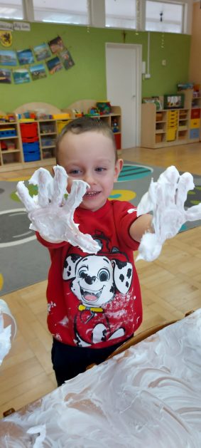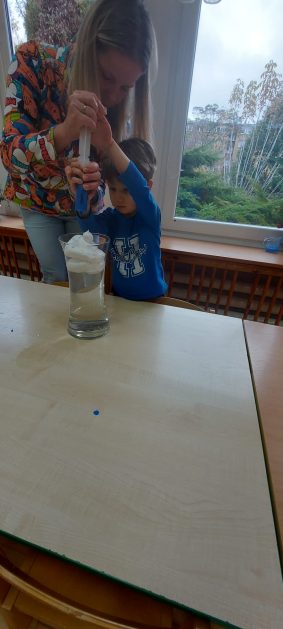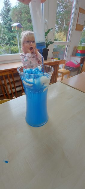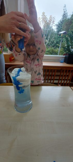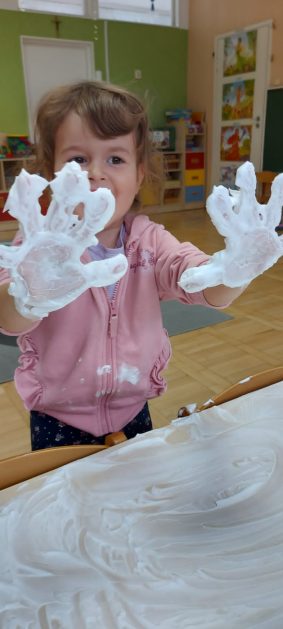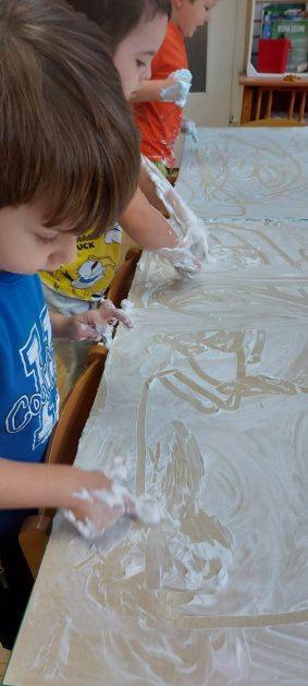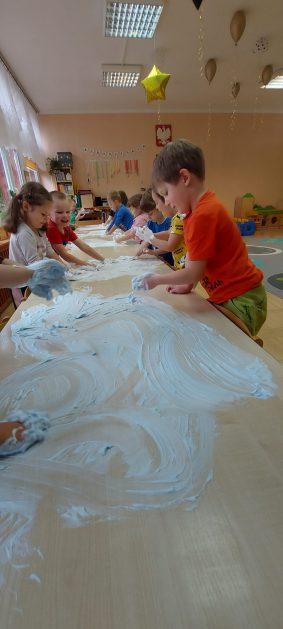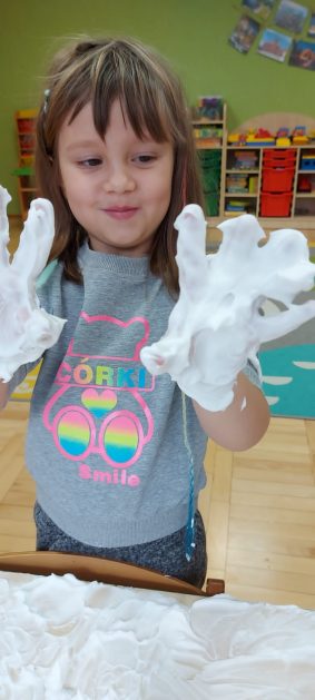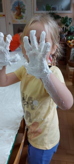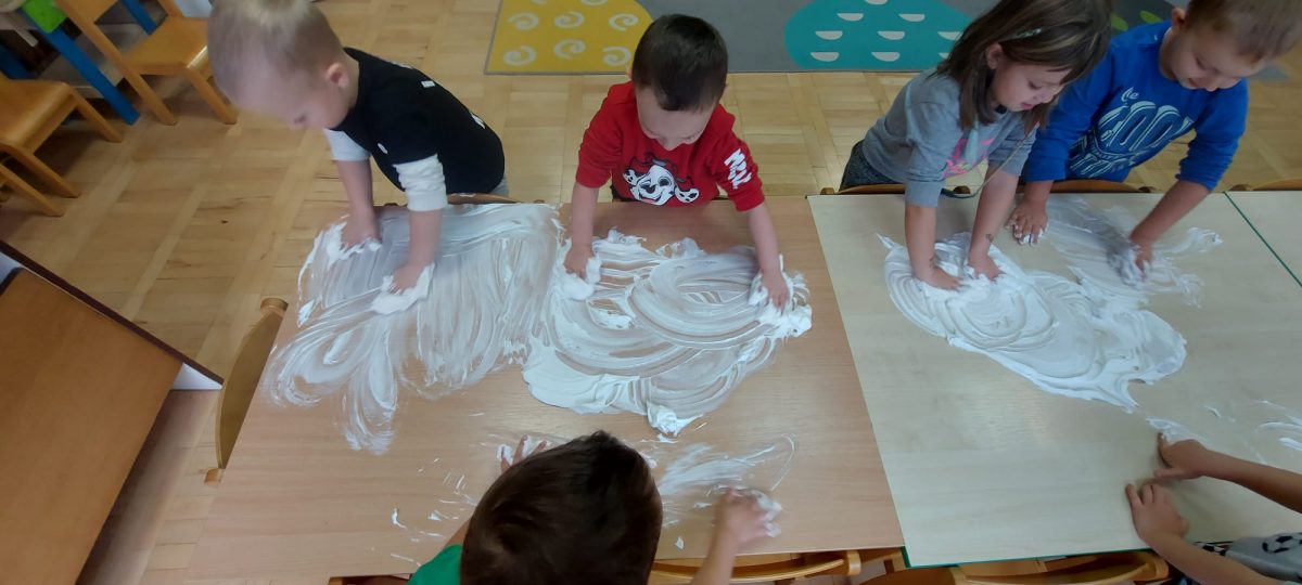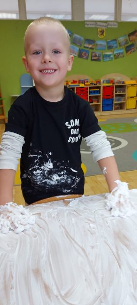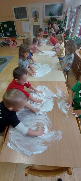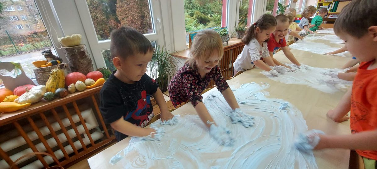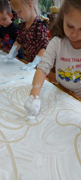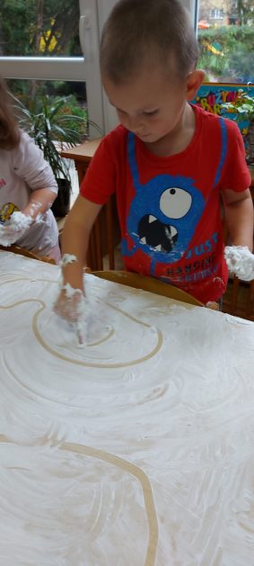 4 latki” „K” rozpoczęły jesienny tydzień od pytania…skąd ten deszcz? Były imienne kałuże- ćwiczenia z elementami czytania globalnego i rozpoznawania zapisu graficznego swojego imienia. Eksperyment- deszcz w słoiku. Na koniec ściągnęliśmy chmury na blaty naszych stolików i to już była terapia ręki na całego.