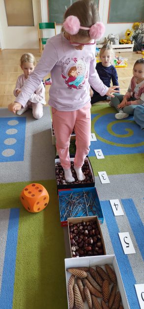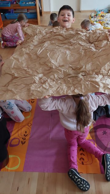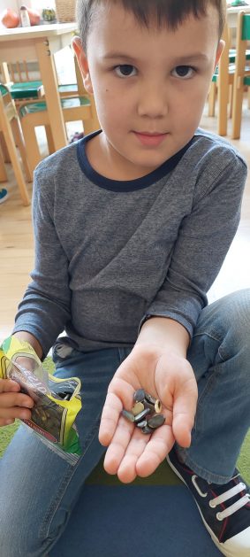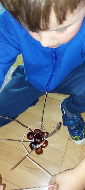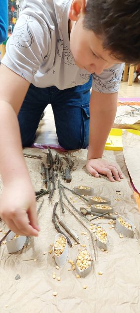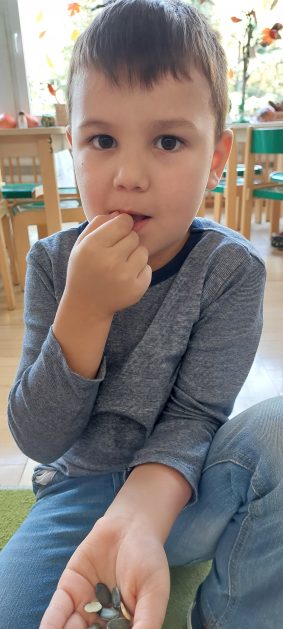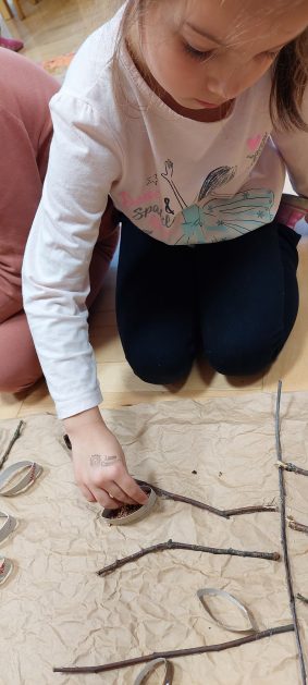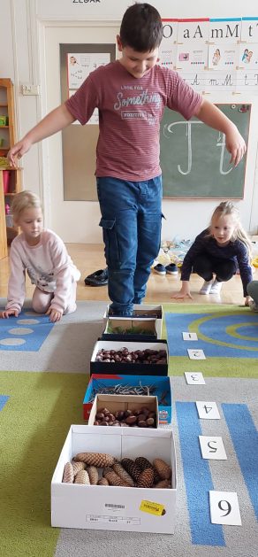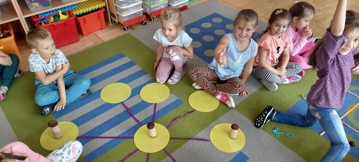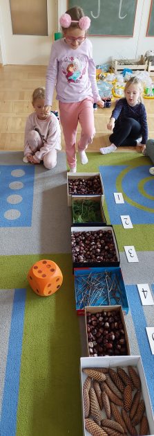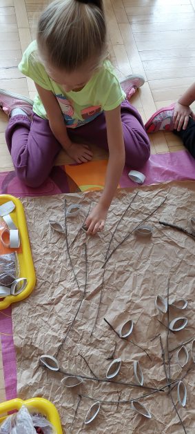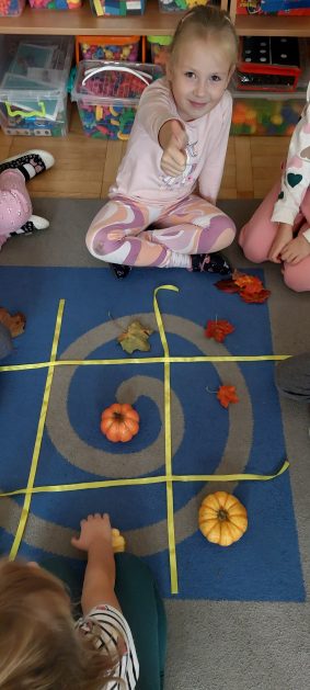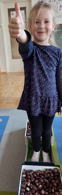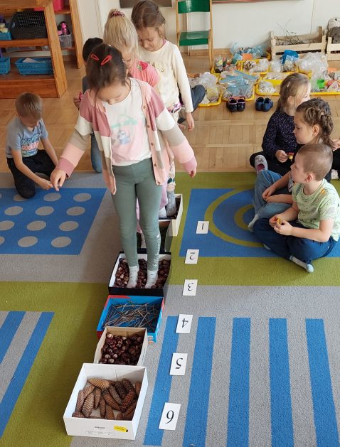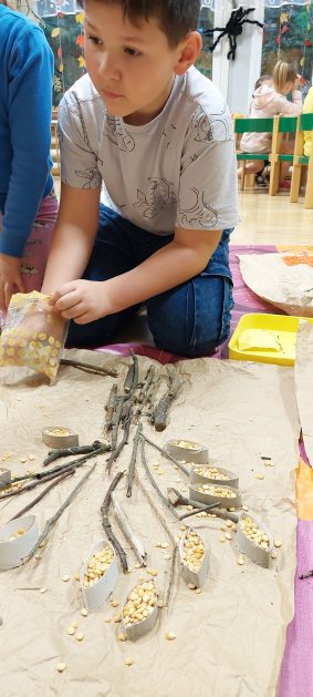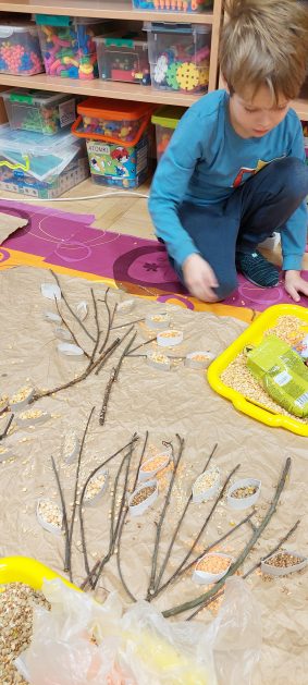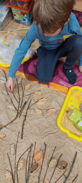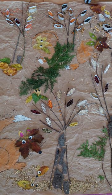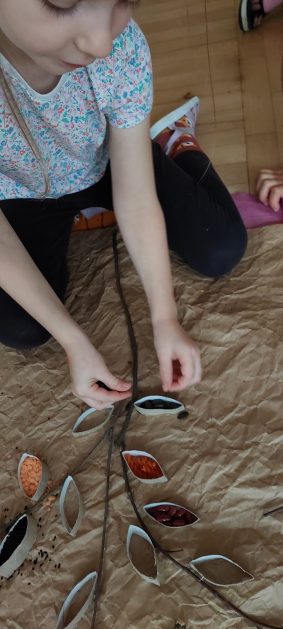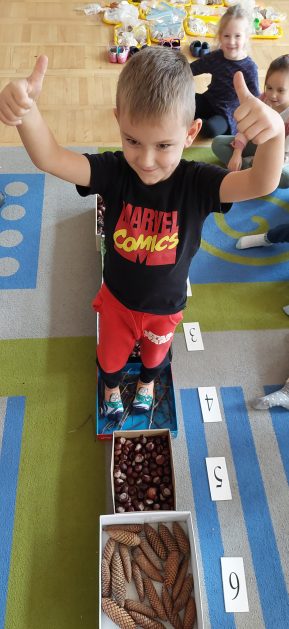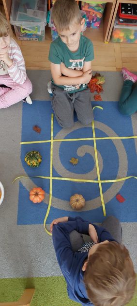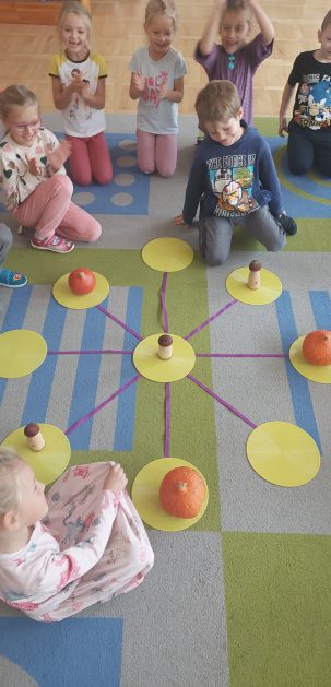Pora jesienna to wcale nie jest nudny czas. Jesień pobudza wyobraźnię dzieci, więc 6 latki rozpoczynają poszukiwania skarbów jesiennych w najbliższym otoczeniu. Nasz ogród jest miejscem gdzie wyobraźnia i ciekawość świata dzieci przeżywa „turbo doładowanie”. Małe rączki chcą wszystkiego dotknąć, a oczy wszystko dojrzeć. Dzieci nie potrzebują mapy, słuchają swoich wewnętrznych głosów i podążają za tym co oferuje im jesienny ogród! Odnalezione tam skarby natury 6 latki chętnie i łatwo zamieniają w twórcze działania zarówno te kreatywne pobudzające wszystkie zmysły, koncentrujące się na mowie, nauce czytania, tworzeniu gier, czy działaniach matematycznych.