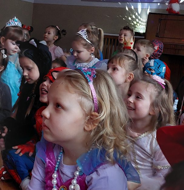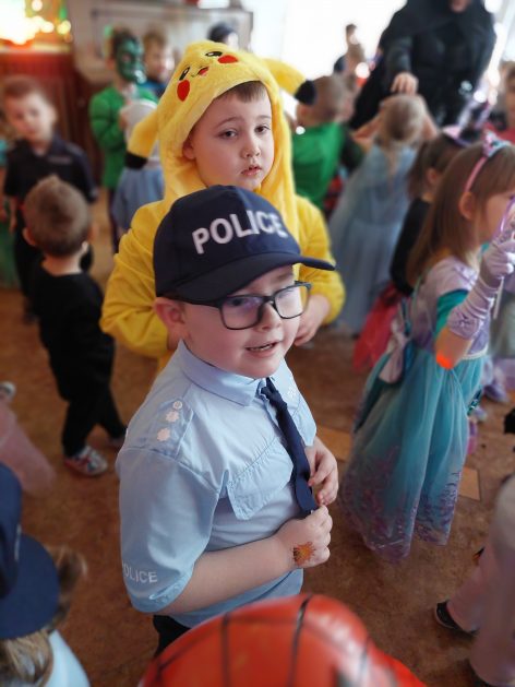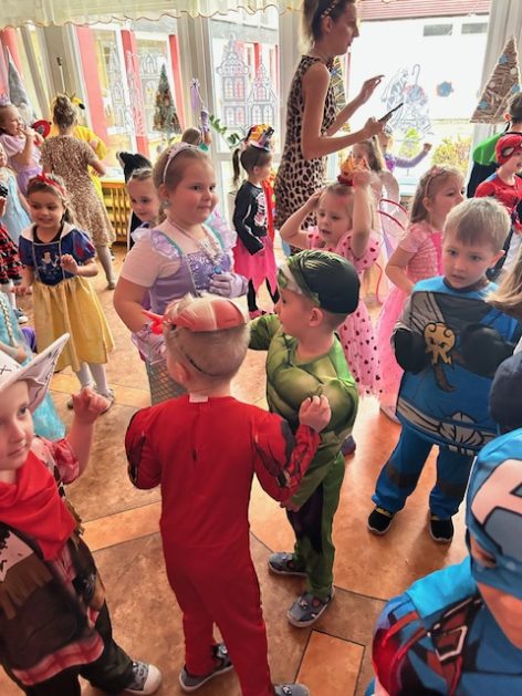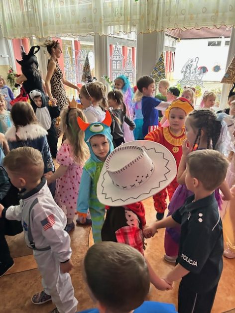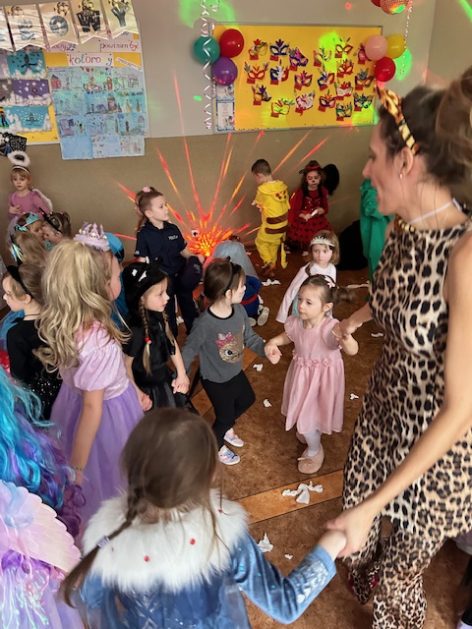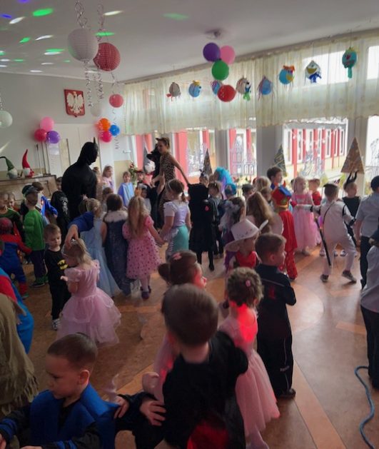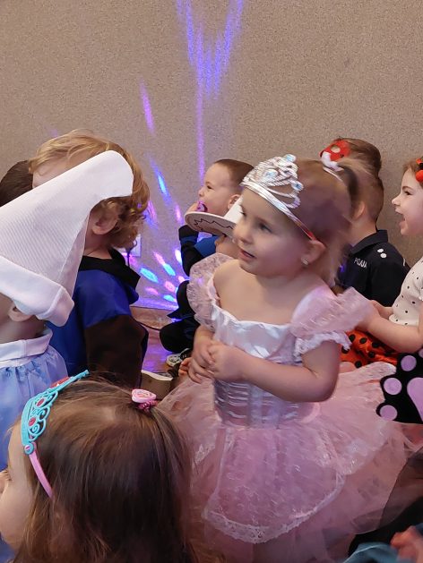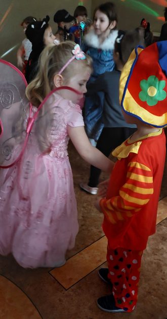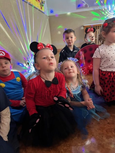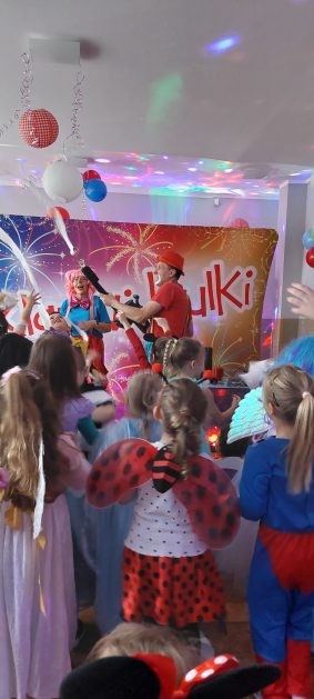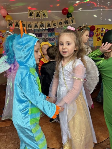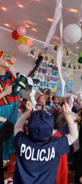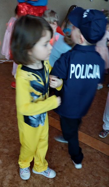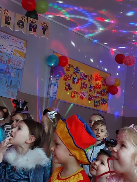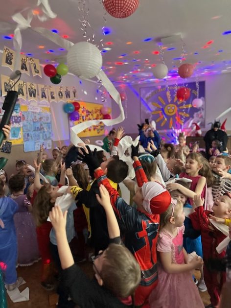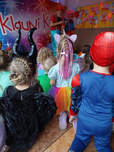 Korzystając z zaproszenia u nas 28 stycznia były tańce i wesołe przebierańce. Księżniczki, misie, policjanci bawili się wspaniale! Czy to mały, czy też duży każdy tańczył tak ja lubi! Buzie wszystkie uśmiechnięte, bo rozśmieszał dzieci Kulek i Kulka clowni z Koszalina. Wszystkim zabawom towarzyszył śmiech, radość i spontaniczna aktywność dzieci. W trakcie karnawałowych szaleństw był czas na słodką przekąskę, jak również na pamiątkowe zdjęcia.