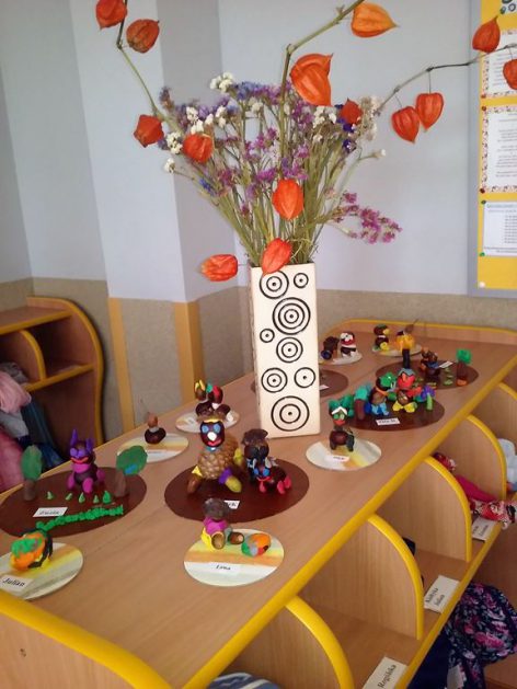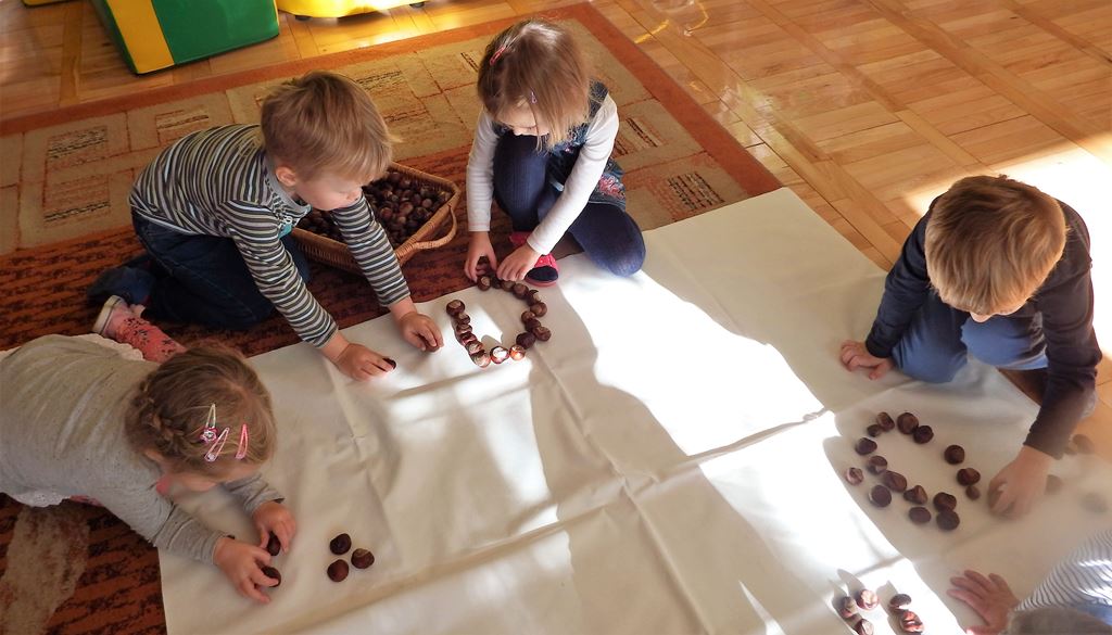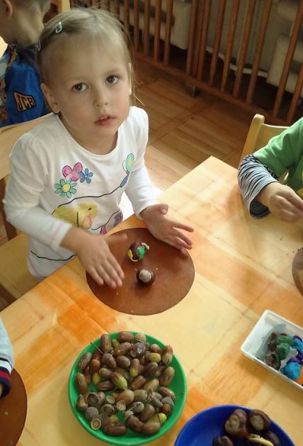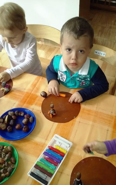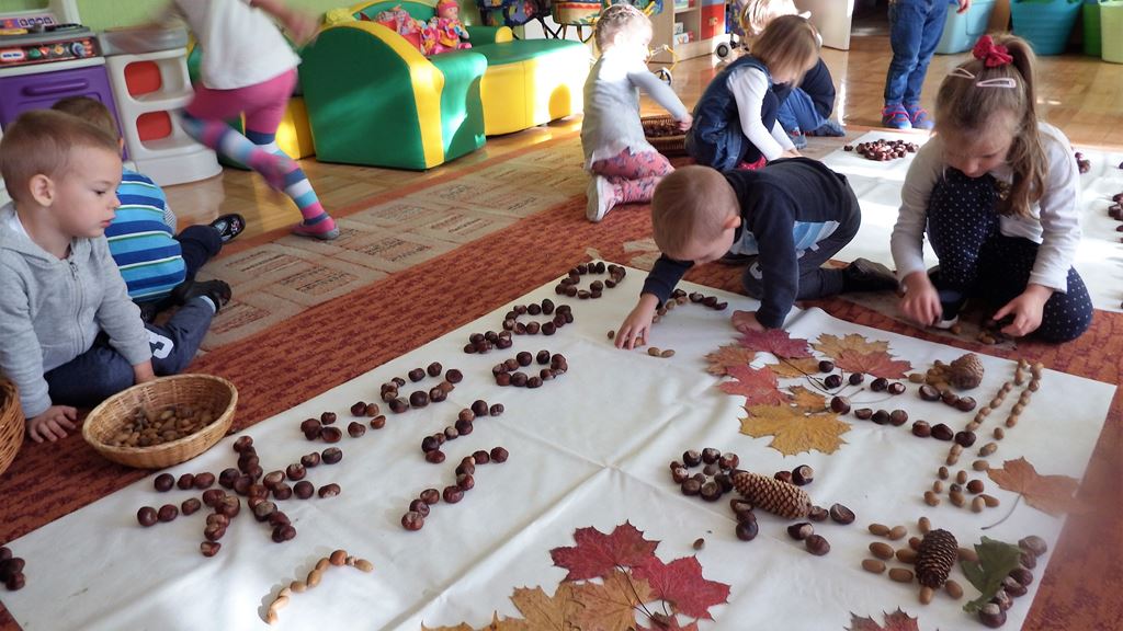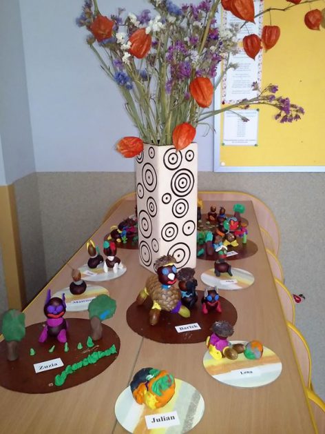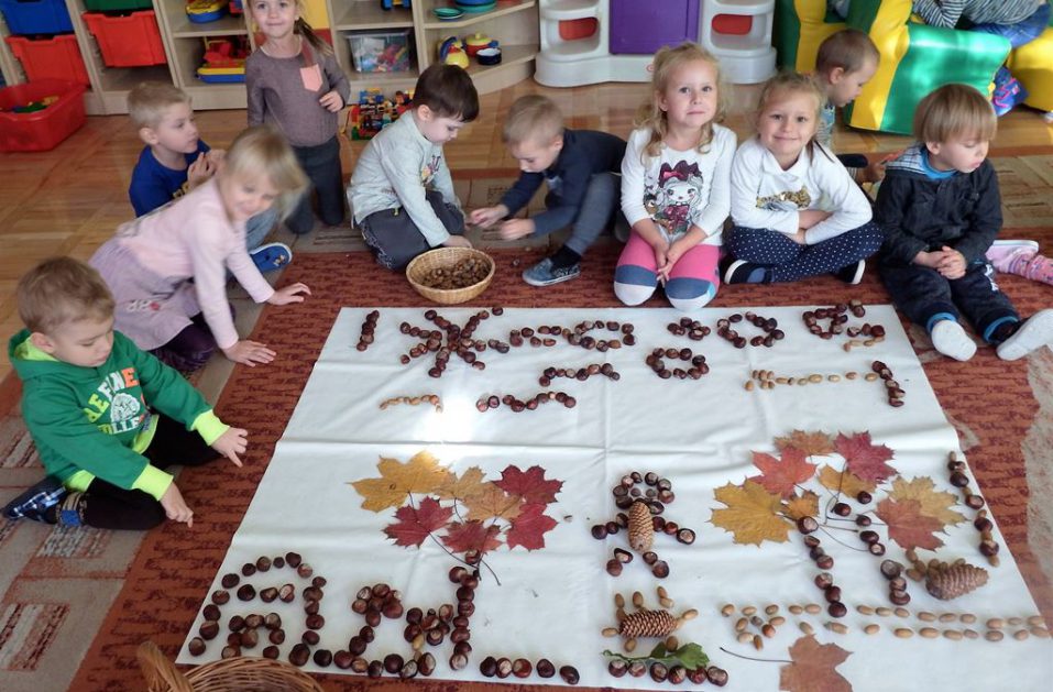 Z drzewa opadają już kasztany, żołędzie i szyszki to znak, że już jesień w pełni. Jesień zawitała również do naszej sali. Mamy w kąciku przyrody kosze pełne darów jesieni. Wykorzystujemy je bawiąc się w różny sposób. Liczymy, klasyfikujemy, rozwijamy wyobraźnię, tworzymy ciekawe prace plastyczne, układamy ruchome, kasztanowe obrazki, nikt się nie zniechęca i nie nudzi.