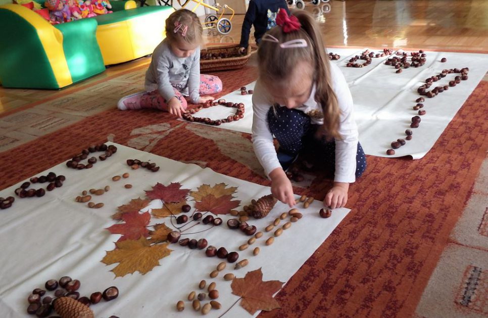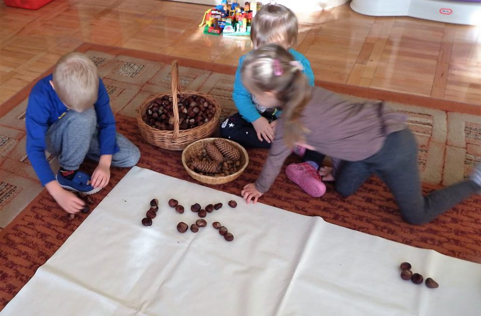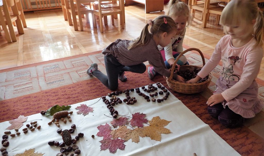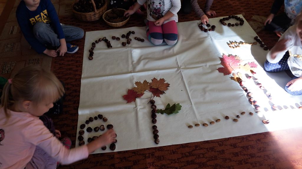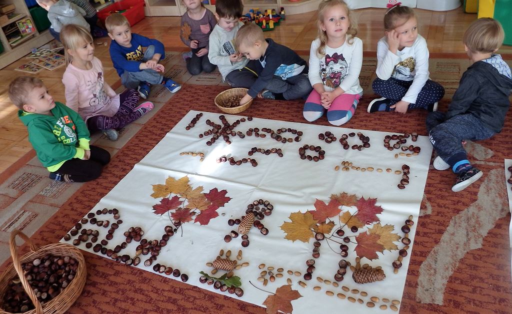 Znamy dary Pani Jesieni i często je wykorzystujemy. W grupie 3- 4 latków P. Hani dzieci uczą się wielozmysłowo poznawać i rozróżniać drzewa liściaste, poznają kształt liści, liczą, grają, powtarzają rytmy wykorzystując do tego kasztany. Rozwijają procesy poznawcze i inwencję twórczą podczas komponowania jesiennych obrazów w małych zespołach.