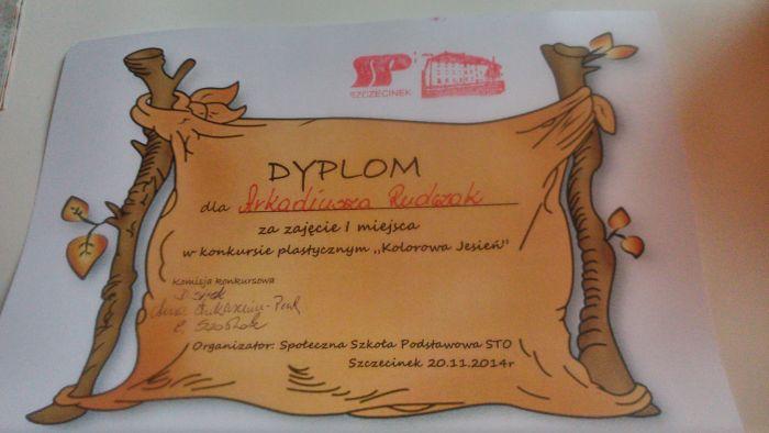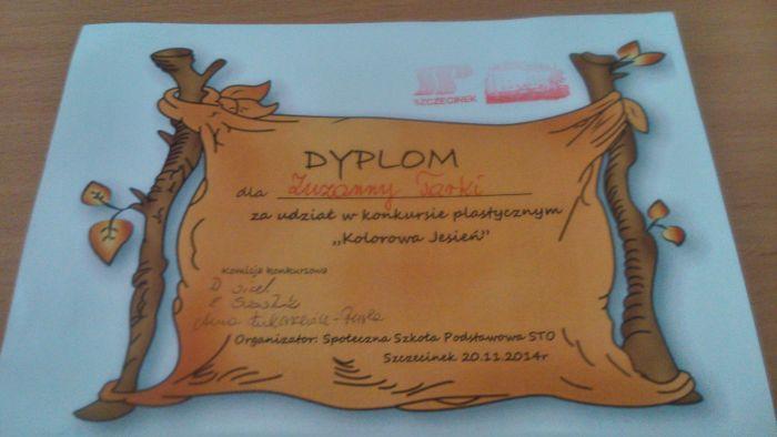 W listopadzie dzieci z grupy 5-latków wzięły udział w konkursie plastycznym organizowanym przez Szkołę Społeczną w Szczecinku. Zadaniem konkursowym było wykonanie pracy na temat ”Kolorowa jesień” techniką origami. I odnieśliśmy sukces. I miejsce w kategorii przedszkola zajął nasz przedszkolak Arek Rudczak, pozostałe osoby: Zuzia Tarka i Patrycja Machajewska w podziękowaniu za udział w konkursie otrzymały dyplom.