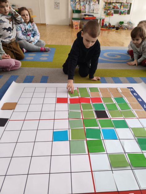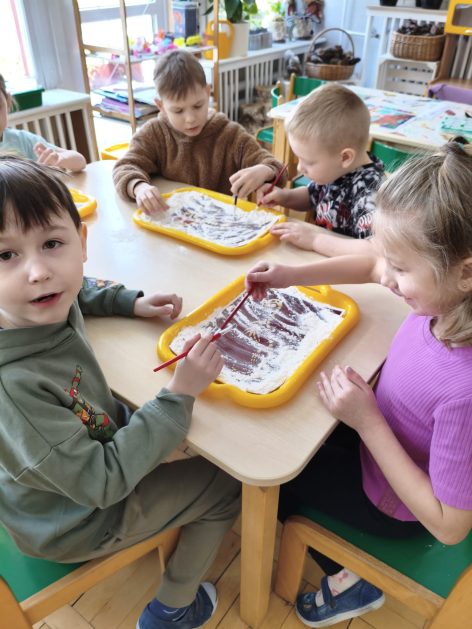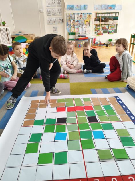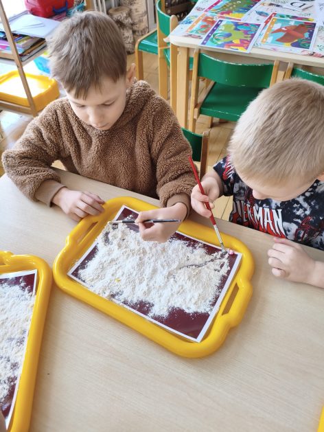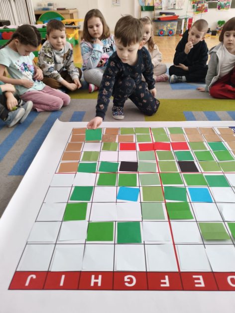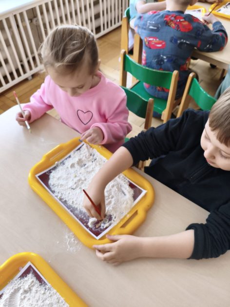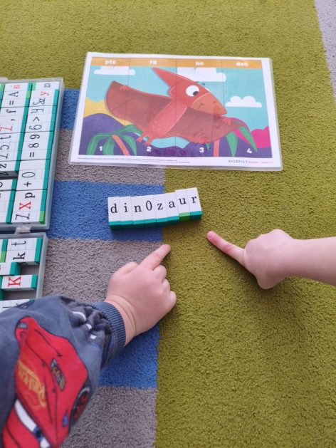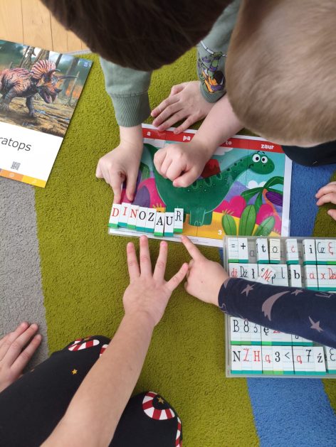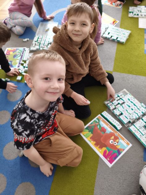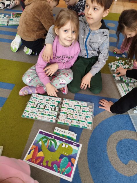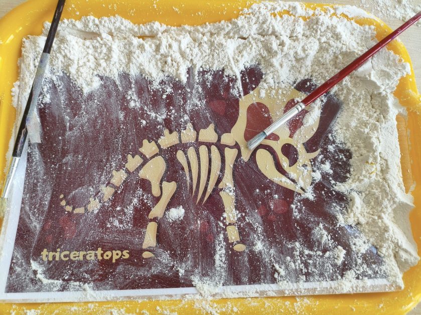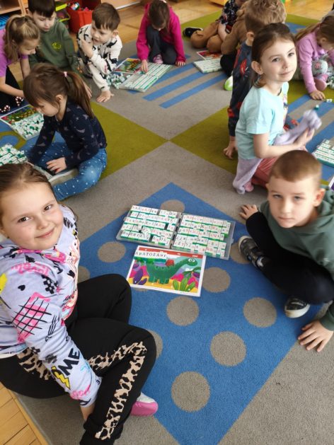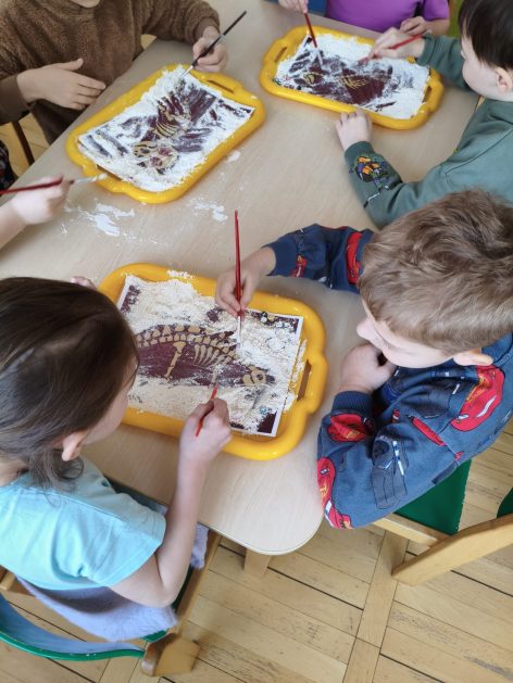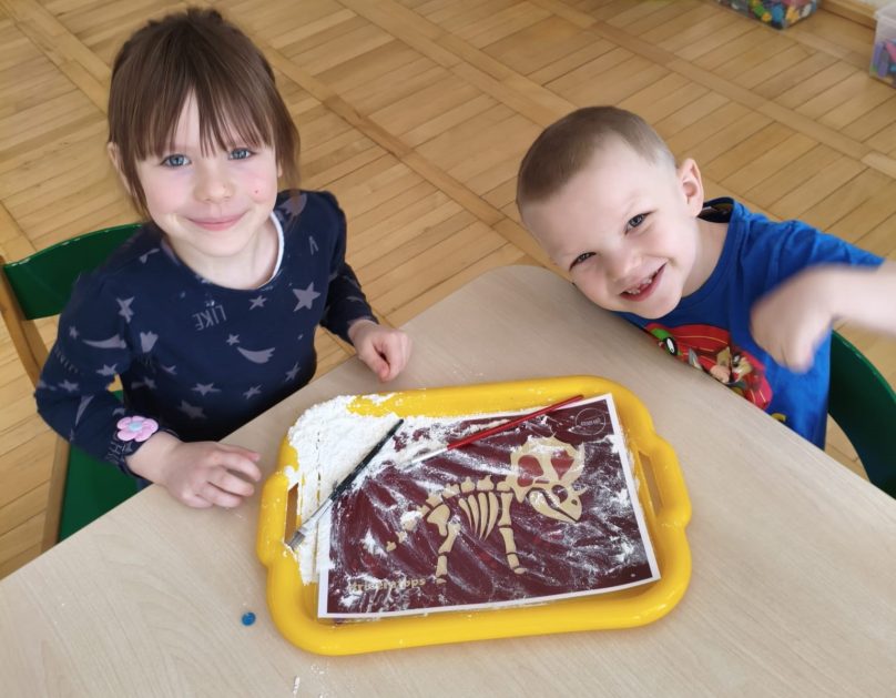 16 stycznia 6 latki „P” szukały odpowiedzi na pytanie: Kto to jest paleontolog? Odpowiedzi znalazły realizując tematykę „W świecie dinozaurów”. Przedszkolaki miały okazję przenieść się w prehistoryczny i tajemniczy świat dinozaurów. Pomimo, iż były to bardzo „straszliwe gady” to zabawa z nimi była wyśmienita. Dzieci poznały wybrane gatunki tych zwierząt, czym się żywiły oraz z jakiego powodu wyginęły, rozmawiały i dzieliły się swoją wiedzą na temat dinozaurów, nie zabrakło również kształtowania umiejętności szkolnych: odczytywania sylaby, odwzorowywania wyrazów z rozsypanki literowej oraz kompetencji matematycznych związanych z kodowaniem. Na zakończenie dzieci wczuły się w pracę archeologa podczas zabawy sensorycznej.