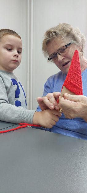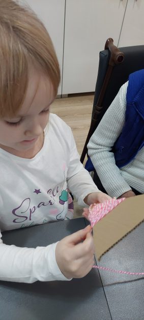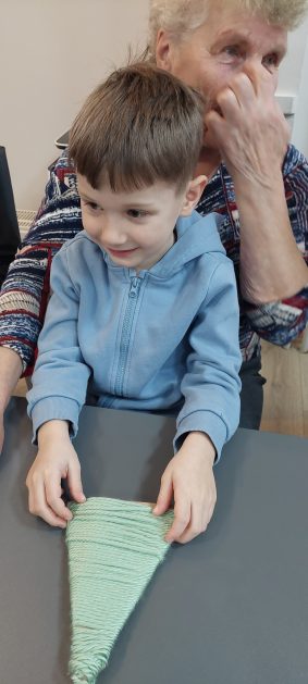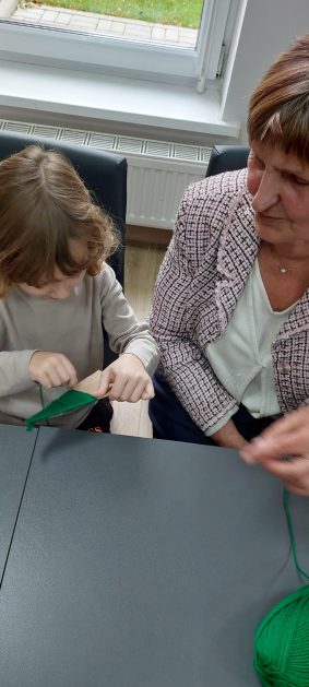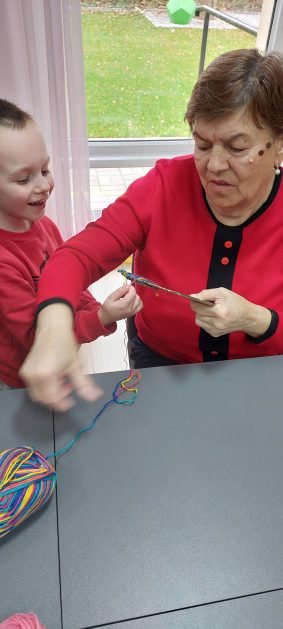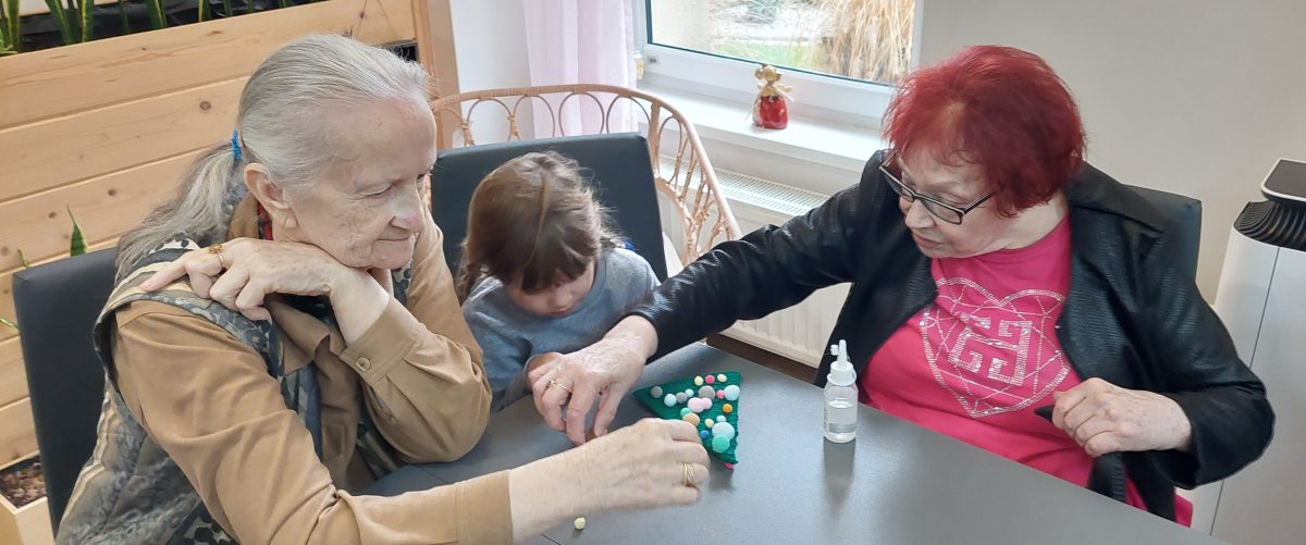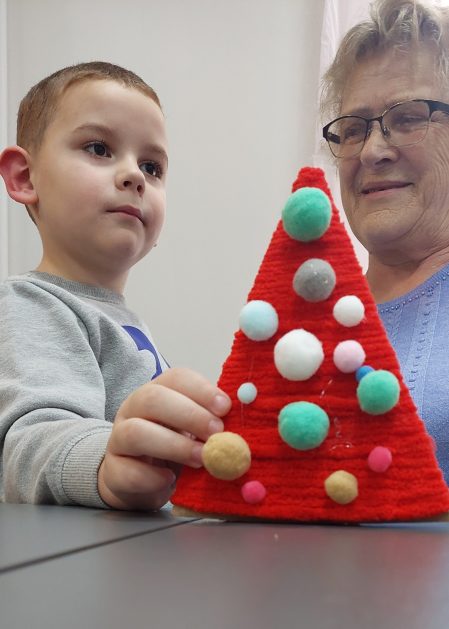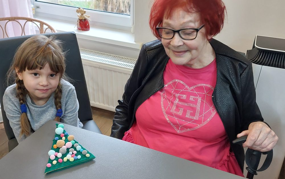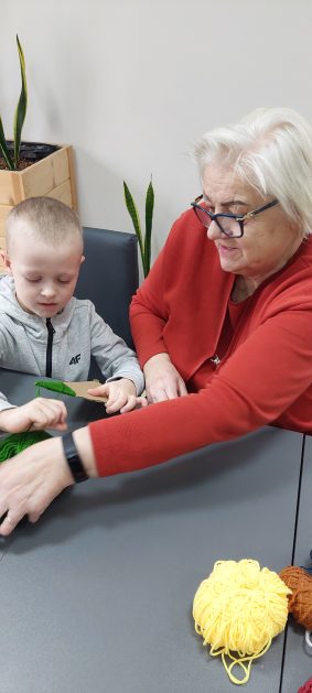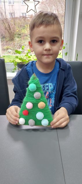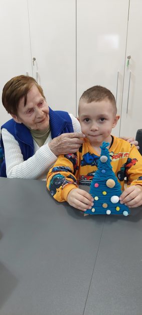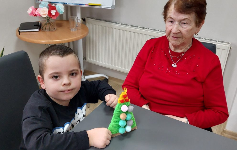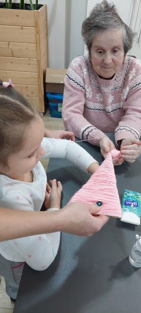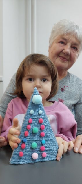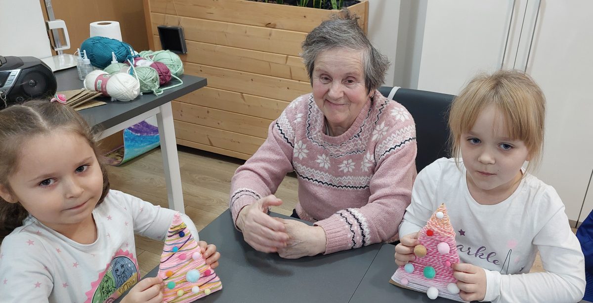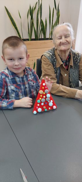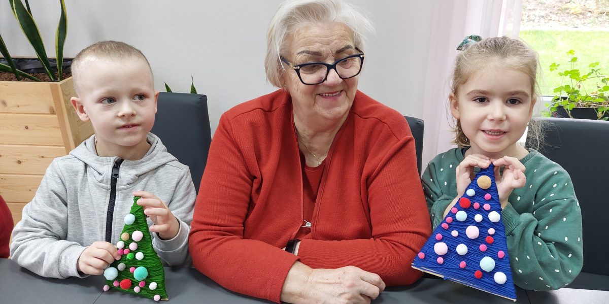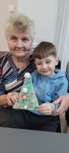 5 latki „A” 2 grudnia spotkały się z seniorami w DDP „Złota Jesień” na warsztatach świątecznych. Miło spędziły czas na wykonaniu dekoracji świątecznych – choinek z wełny. Seniorzy pokazali, że są młodzi duchem, radośni, weseli, życzliwi, lubią dzieci i aktywnie spędzać czas. Takie międzypokoleniowe działania przynoszą wiele korzyści: wzmacniają więzi w społeczności lokalnej, wzbogacają procesy uczenia się zarówno dzieci, jak i osób starszych, a przede wszystkim dają radość obu stronom. Wizyta w DDP „Złota Jesień” była wartościowym spotkaniem, które dało dzieciom możliwość zrozumienia wartości takich jak szacunek i życzliwość jaką należy okazywać osobom starszym. Na koniec spotkania dzieci zaśpiewały pastorałkę świąteczną: „Samotny człowiek jest smutny czasami, a ludziom jest dobrze, gdy nie są sami…”