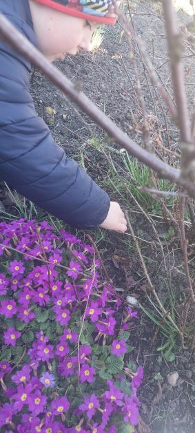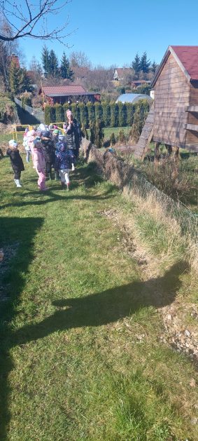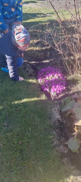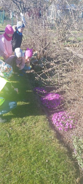 W poszukiwaniu ciekawostek przyrodniczych dwie grupy 5 latków wybrały się na pobliskie ogródki działowe, aby z bliska przyjrzeć się jak przyroda budzi się do życia. To ciekawe doświadczenie, dzieci poszerzyły wiedzę dotyczącą nazw pierwszych wiosennych kwiatów a spotkani działkowcy chętnie opowiadali o swoich uprawach.