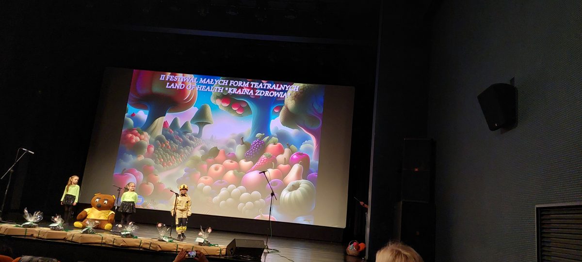 16 kwietnia – 5 latki „A” próbowały swoich sił na scenie w Kinie „Wolność”, biorąc udział w w II Festiwalu Małych Form Teatralnych „Land od health” organizowanym przez Przedszkole Niepubliczne „Miś”. Bardzo dziękujemy za zaproszenie dyrekcji Przedszkola Niepublicznego „Miś” za możliwość udziału w tym świetnym wydarzeniu, którego celem było przede wszystkim dbanie o zdrowie, kształtowanie prawidłowych nawyków żywieniowych, sport a przede wszystkim nauka języka angielskiego już od najmłodszych lat. Pozytywne emocje udzielały się wszystkim uczestnikom tego pięknego wydarzenia, z pewnością na długo zostaną zapamiętane. w pamięci. Nie było przegranych, każde dziecko zostało nagrodzone a za odwagę i zaangażowanie dzieci otrzymały wspaniały prezent dla swojej grupy: kącik lekarski…