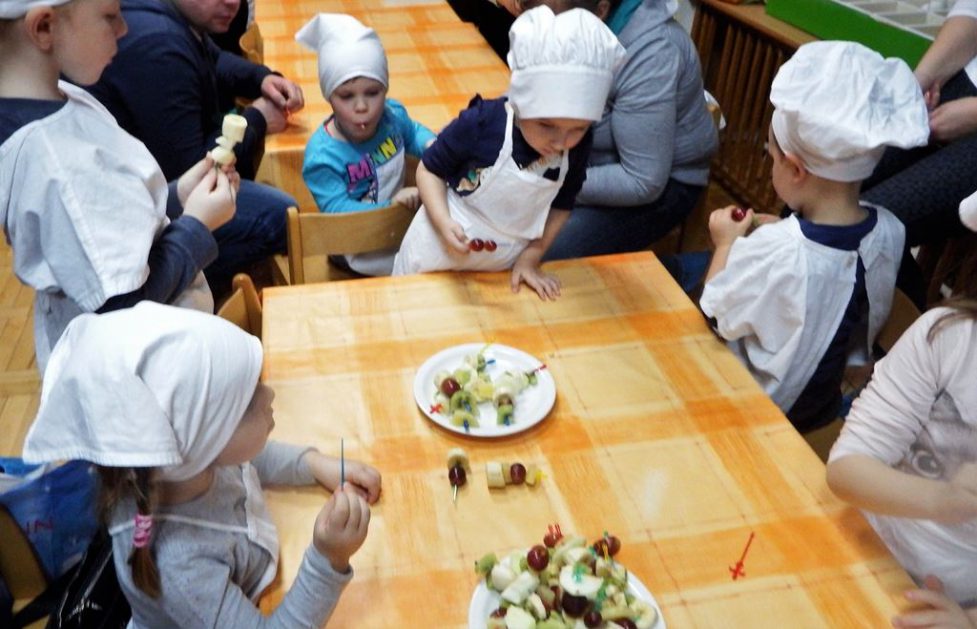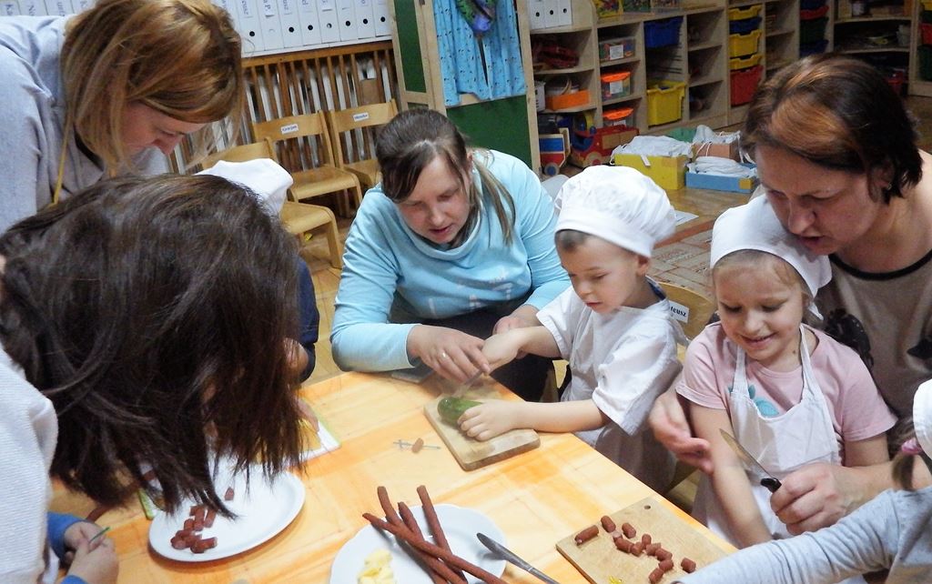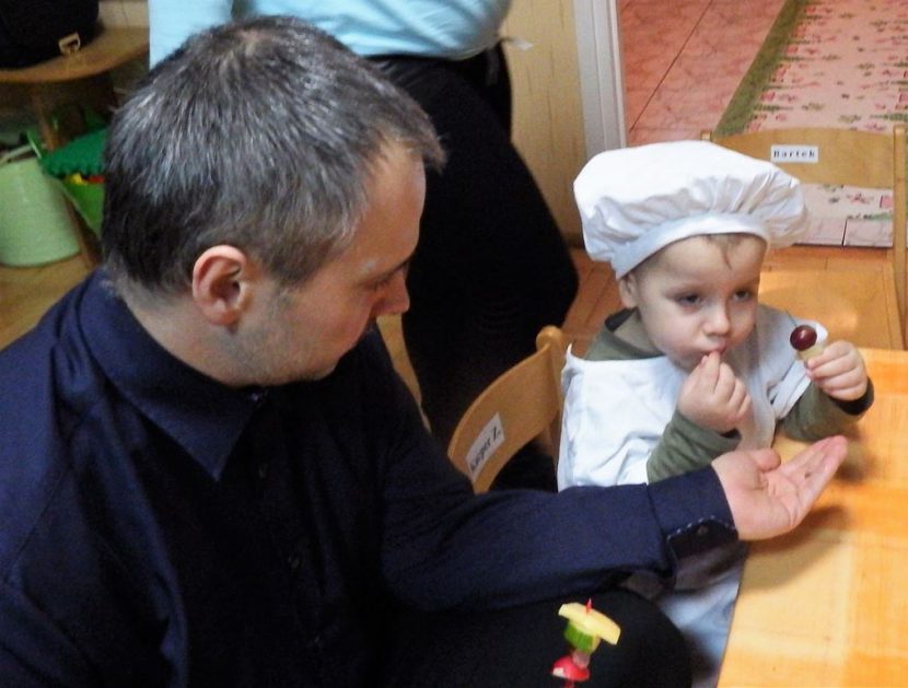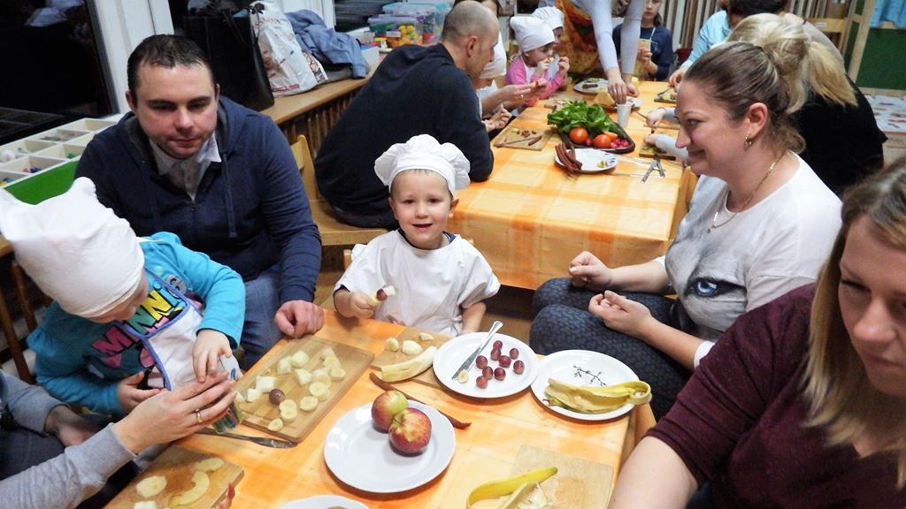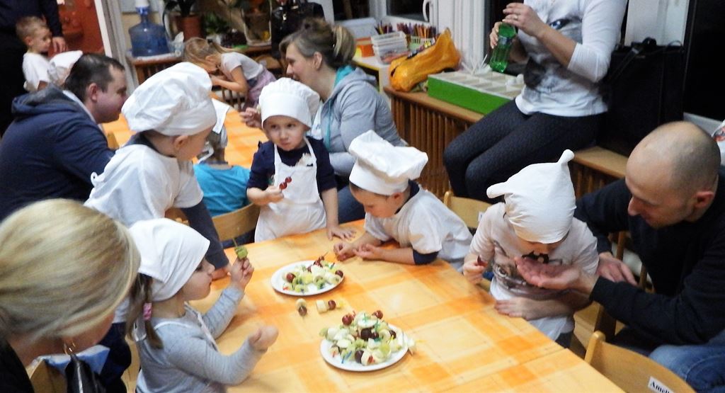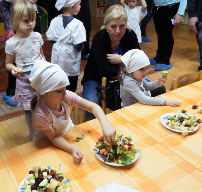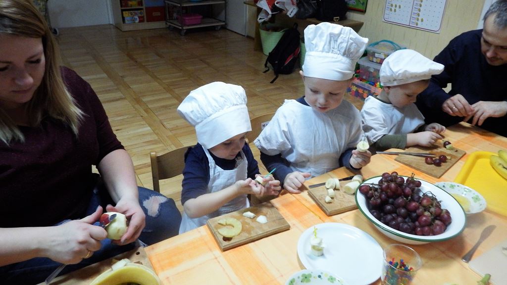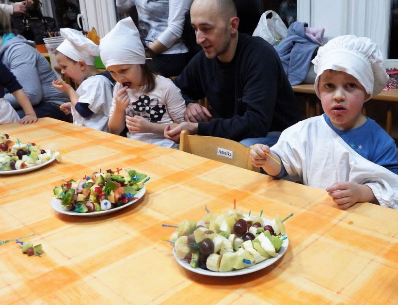 W grupie 3-4 latków P. Hani odbyło się spotkanie integracyjne, na którym w roli głównej były zdrowe produkty, z których dzieci wraz z rodzicami przygotowywały kolorowe szaszłyki. Żeby zachęcić dzieci do jedzenia warzyw, owoców najlepiej dać im możliwość działania w kuchni, więc w przedszkolnej sali dzieci ochoczo zabrały się do pracy. Najwięcej radości podczas robienia szaszłyków sprawiło dzieciom nadziewanie kolorowych kawałeczków na wykałaczki. Konsumowały z ciekawością jakie smaki połączyły na patyczkach.