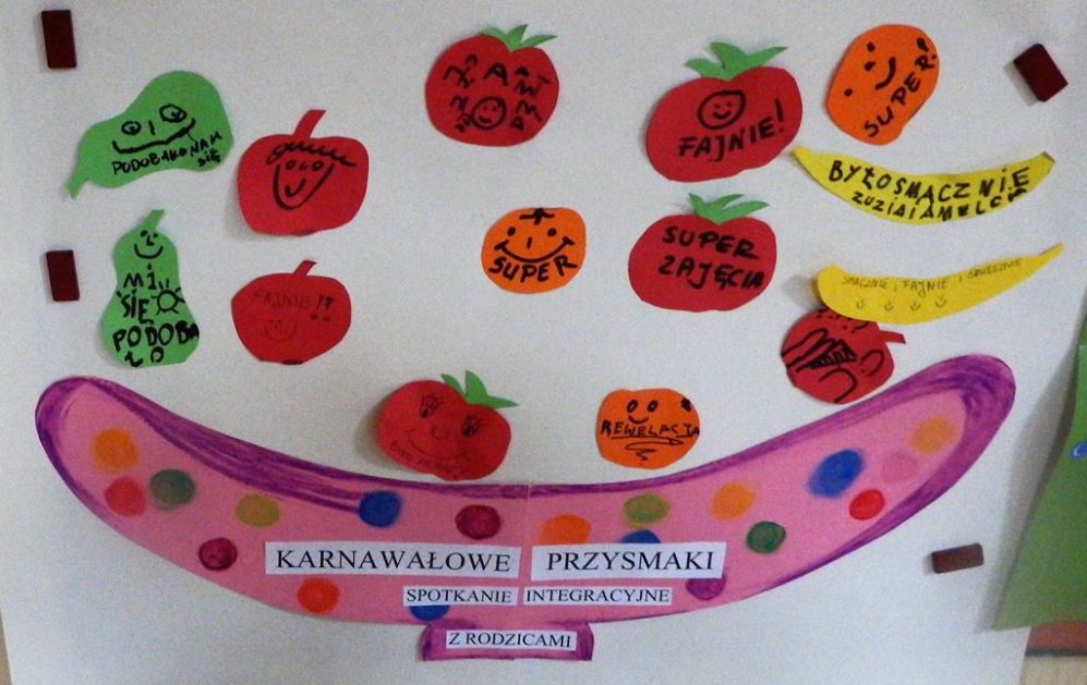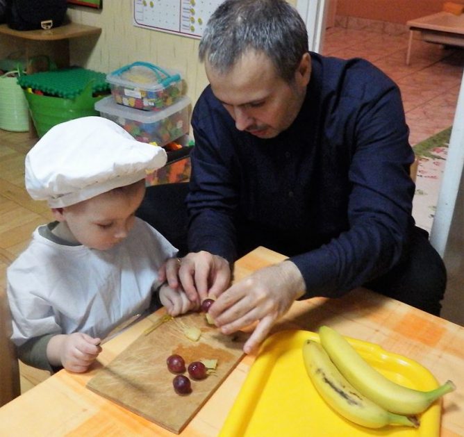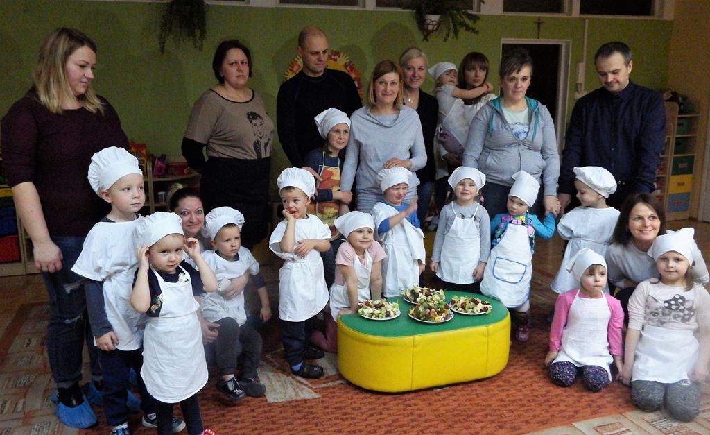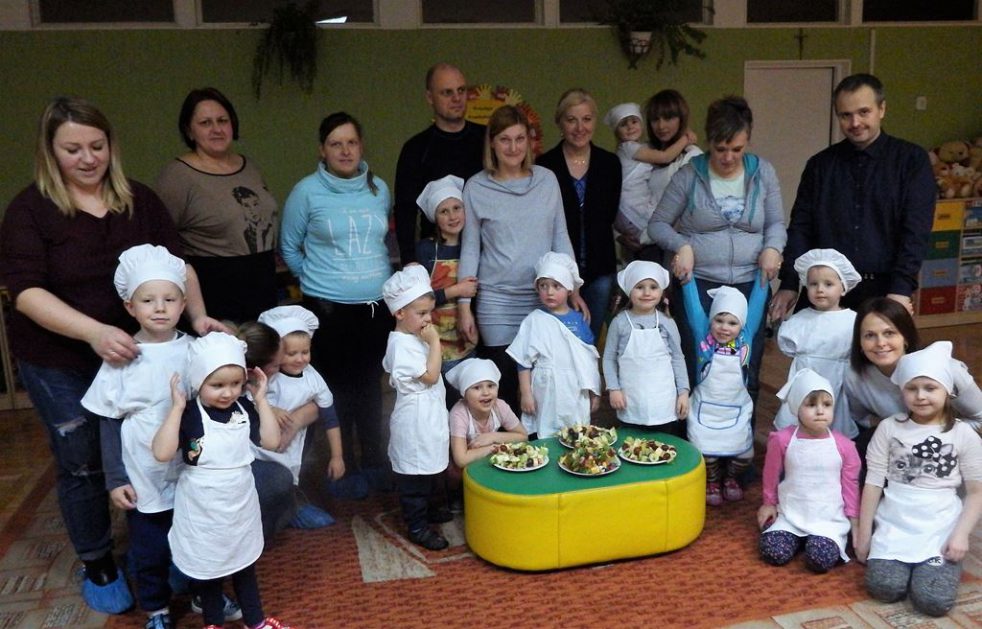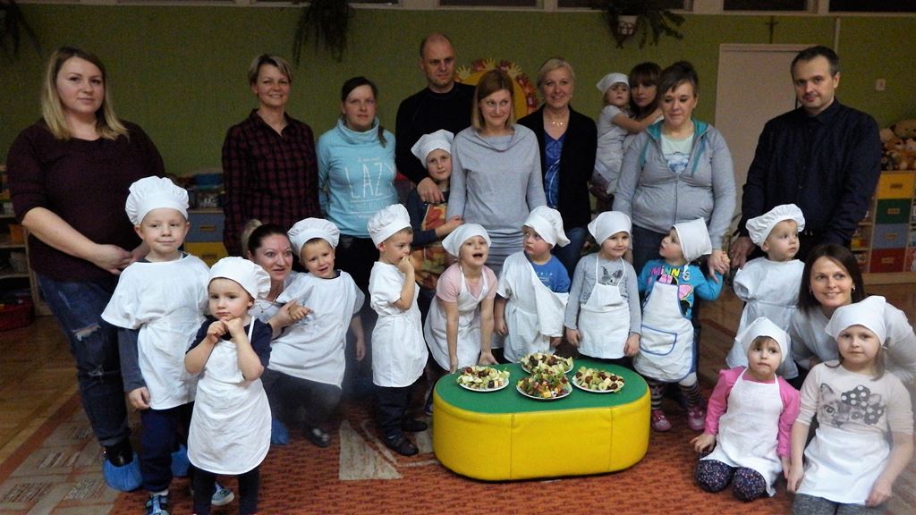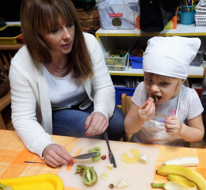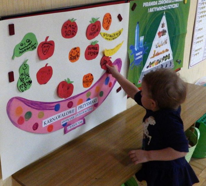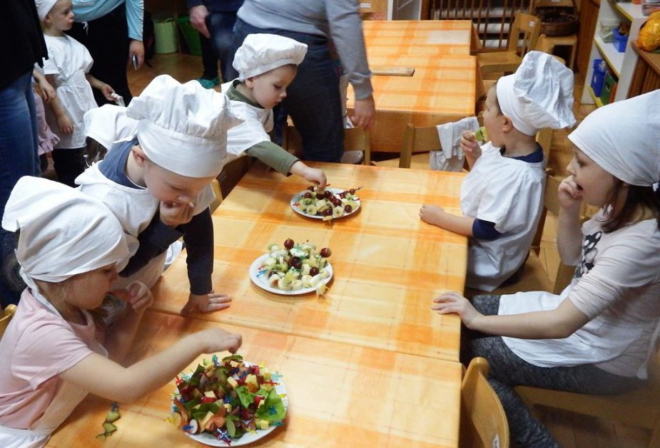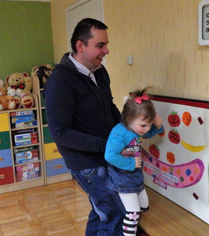 W grupie 3-4 latków P. Hani odbyło się spotkanie integracyjne, na którym w roli głównej były zdrowe produkty, z których dzieci wraz z rodzicami przygotowywały kolorowe szaszłyki. Żeby zachęcić dzieci do jedzenia warzyw, owoców najlepiej dać im możliwość działania w kuchni, więc w przedszkolnej sali dzieci ochoczo zabrały się do pracy. Najwięcej radości podczas robienia szaszłyków sprawiło dzieciom nadziewanie kolorowych kawałeczków na wykałaczki. Konsumowały z ciekawością jakie smaki połączyły na patyczkach.