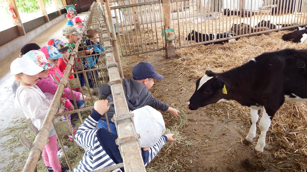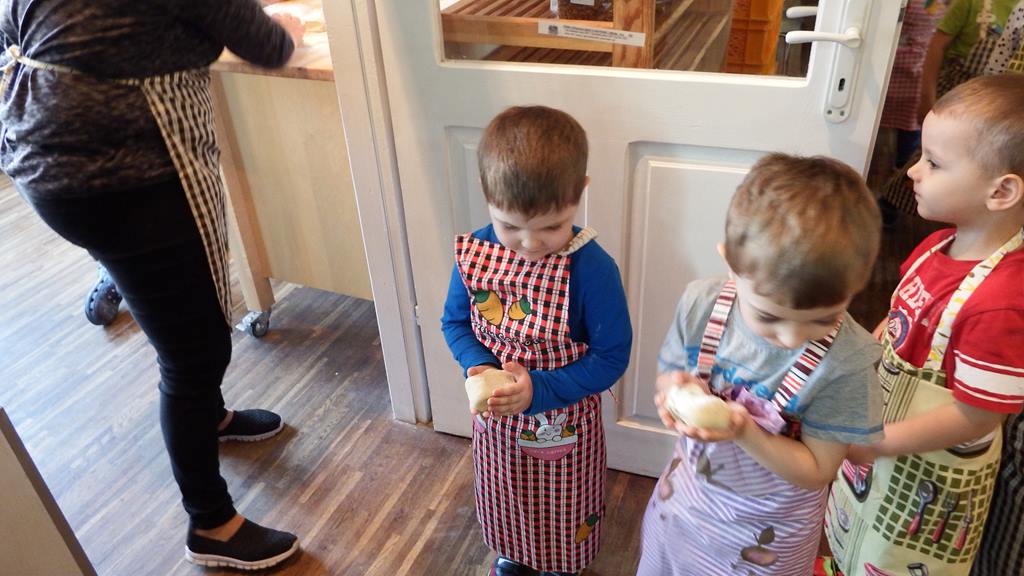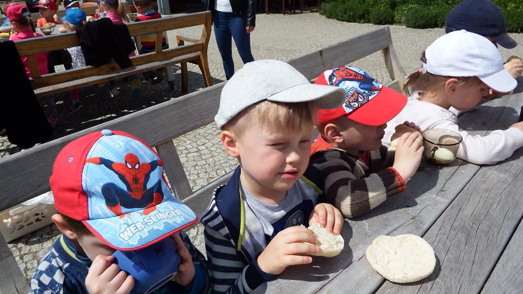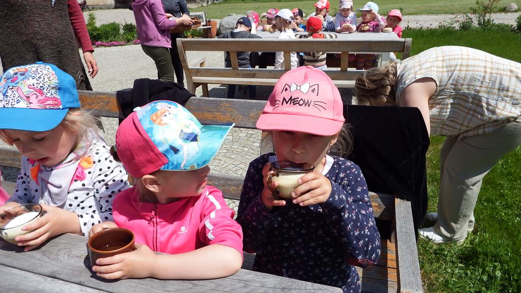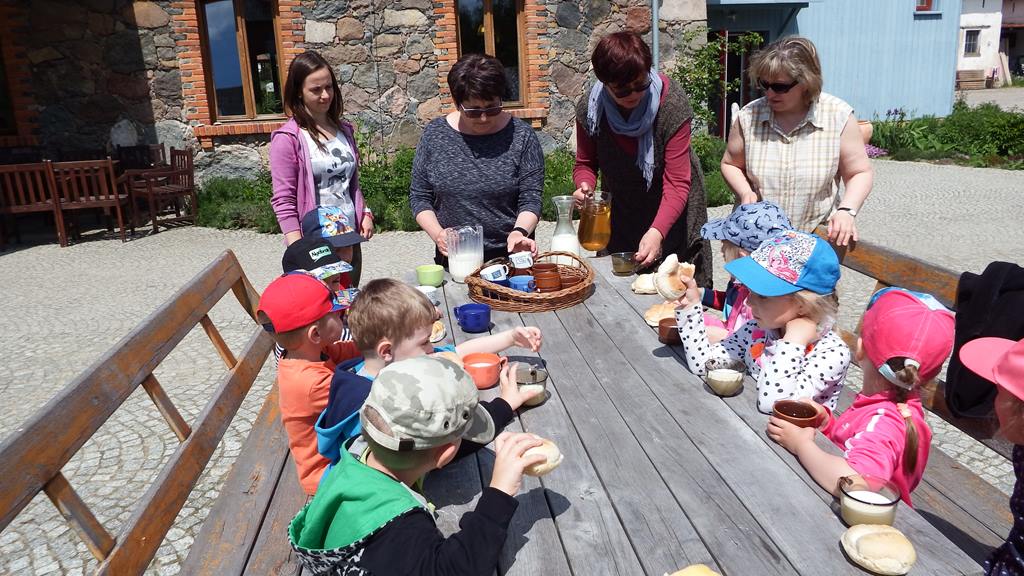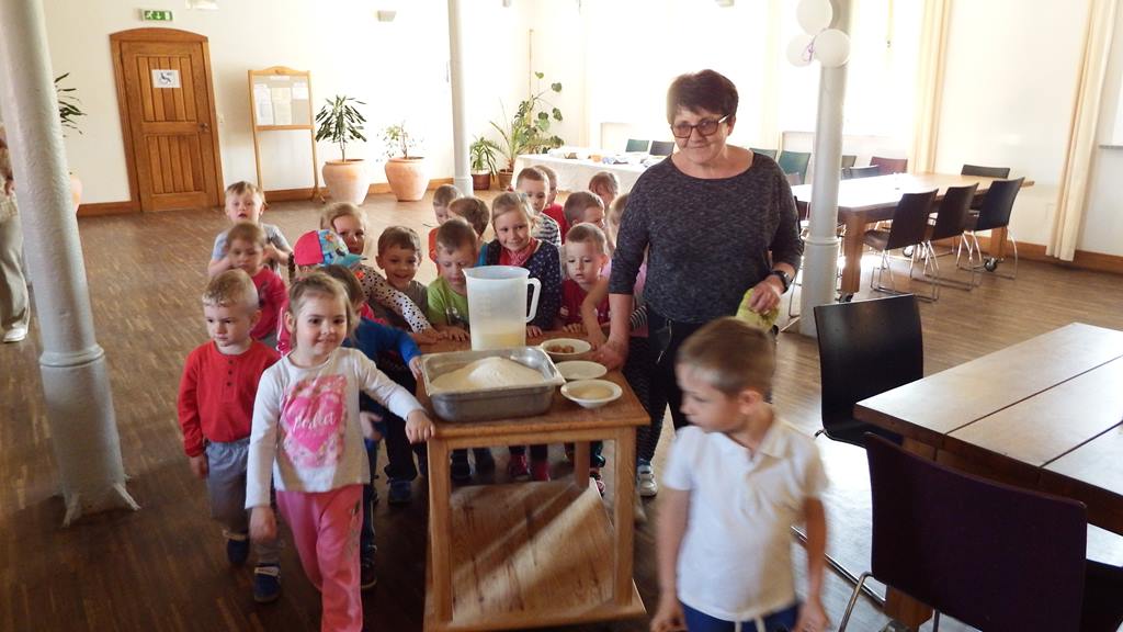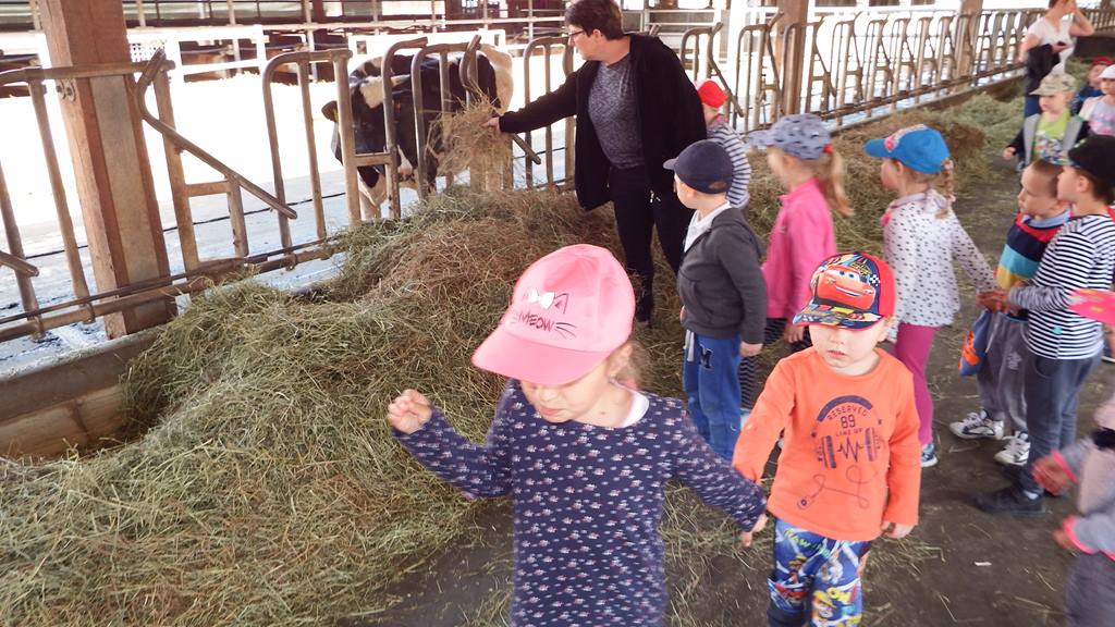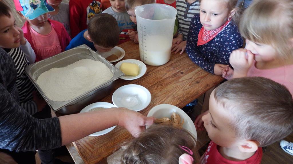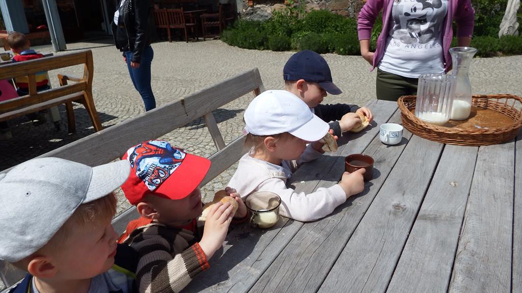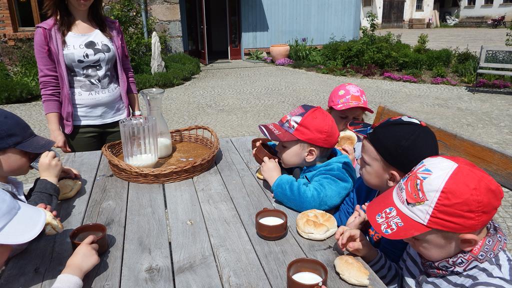 Grupa P. Hani wybrała się na wycieczkę do Juchowa, gdzie odwiedziła gospodarstwo ekologiczne. Dzieci na miejscu poznały kolejne etapy wypieku chleba, rodzaje ziaren, samodzielnie wyrabiały i formowały swoje pierwsze bułeczki. W oczekiwaniu na wypieki dzieci zwiedzały oborę i podziwiały jej mieszkańców – krowy i małe cielaczki, próbowały nakarmić krówki i pomóc przy codziennych czynnościach porządkowych. Po wyczerpującej pracy dzieci wróciły, aby na powietrzu skosztować własnych wypieków popijając pysznym mleczkiem.