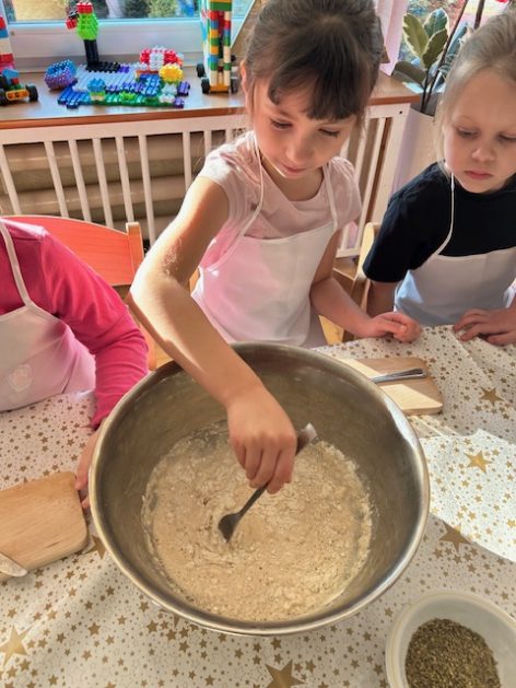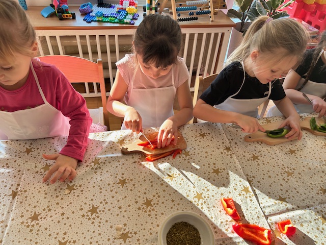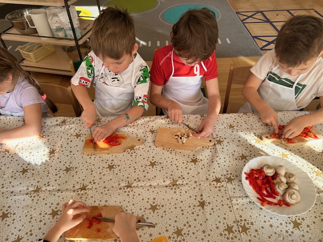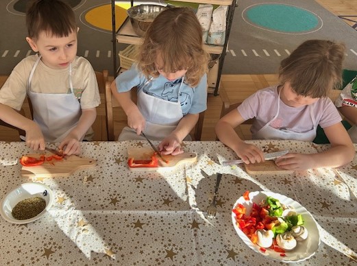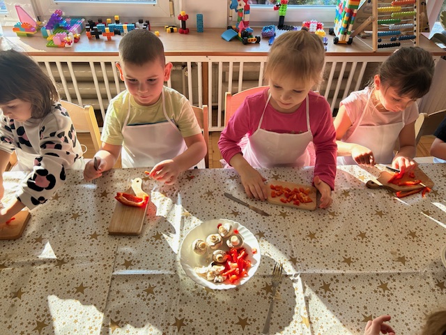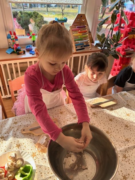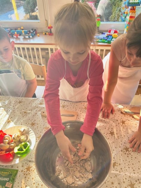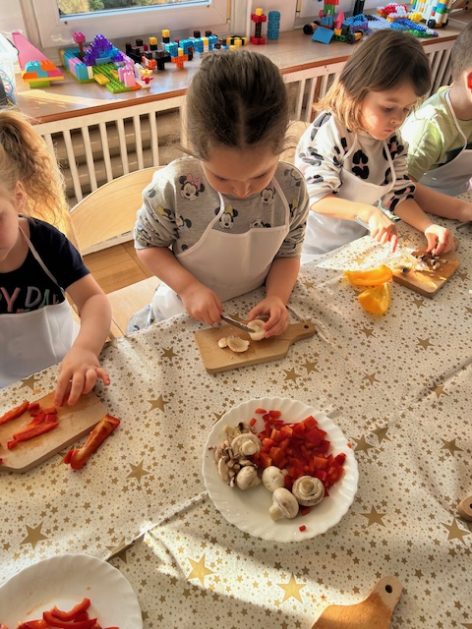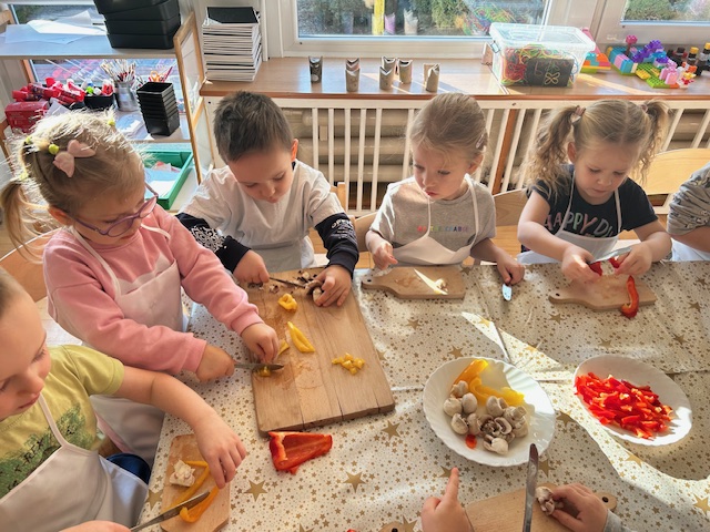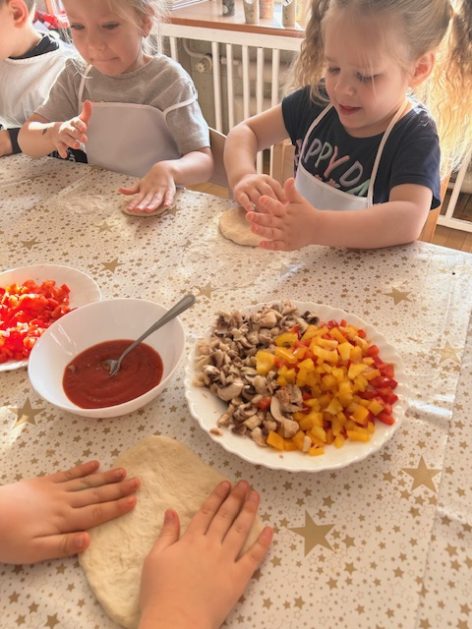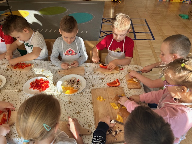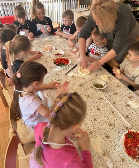U nas też są smakosze pizzy, więc w kucharzy się dzieci zmieniły i do pracy przystąpiły: ” Dzisiaj pizzę upieczemy a do tego potrzebujemy: …” nucąc słowa piosenki, dzieci sprawnie pracowały i pyszną pizzę przygotowały!