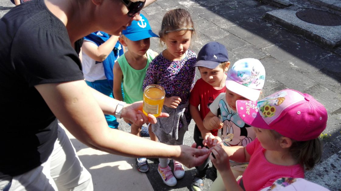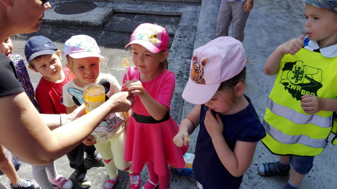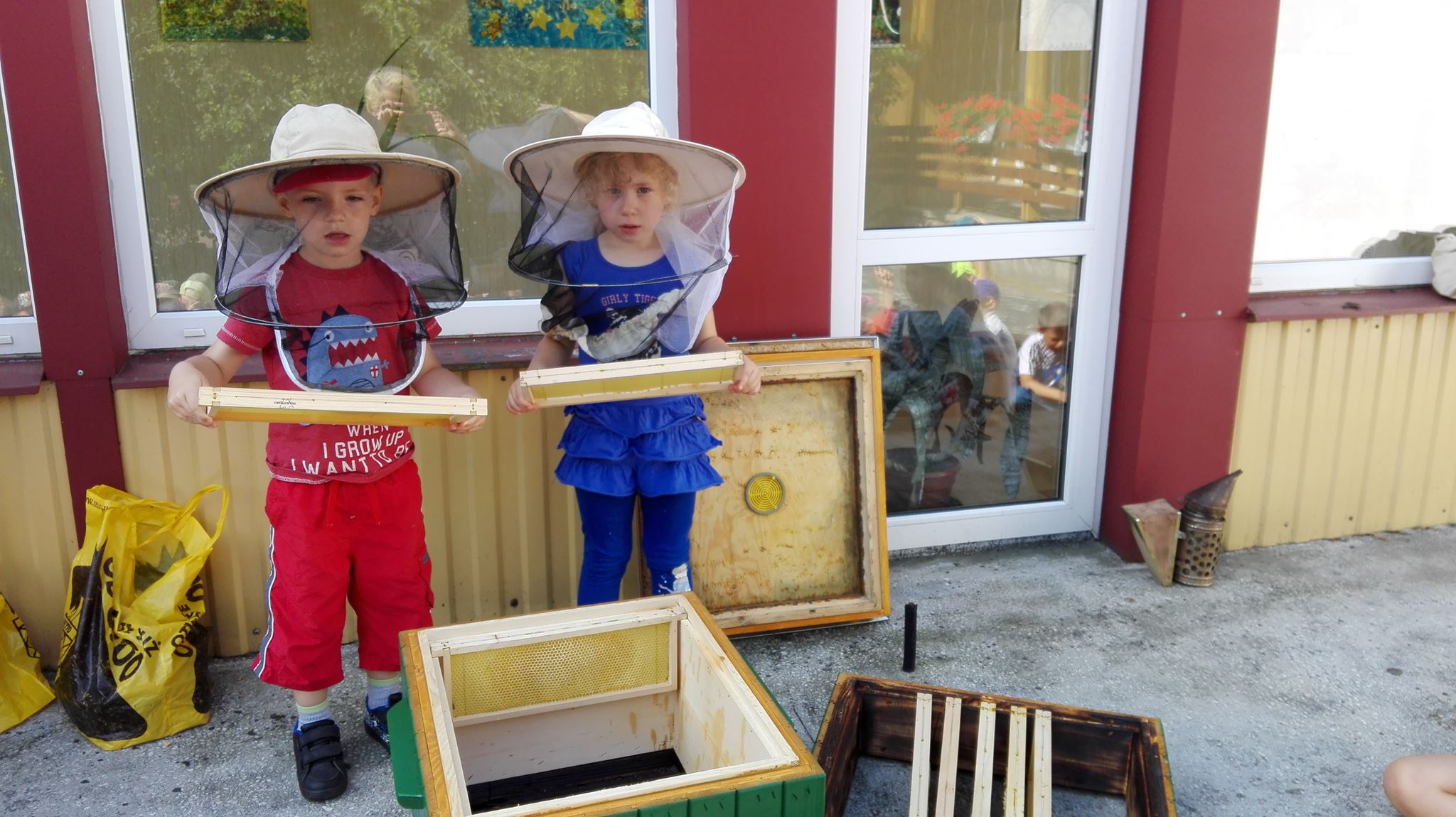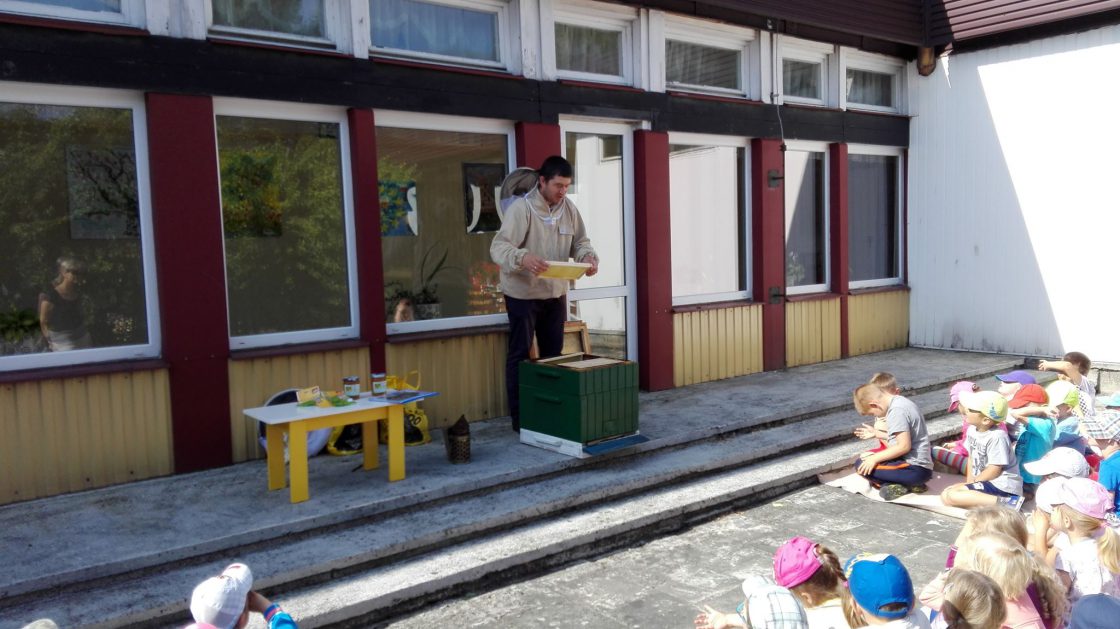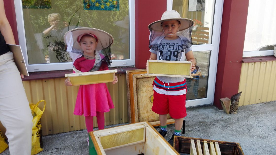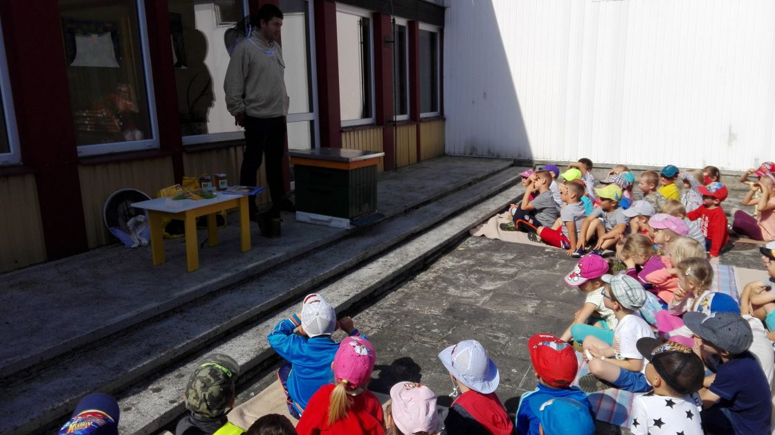 6 – go lipca odbyło się spotkanie z pszczelarzem z zamiłowania – tatusiem Milenki z grupy 4 latków, który w bardzo interesujący sposób opowiadał dzieciom o swojej pasji. Dzieci poznały korzyści, które przynoszą pszczoły rolnikom i działkowcom, bo dzięki tym owadom mamy dorodne jabłka, gruszki, śliwki i wiele innych owoców. Na pytanie, kto może być pszczelarzem, pada odpowiedź, że każdy, kto lubi być blisko przyrody. Aby być dobrym pszczelarzem – jak mówi tata Milenki – trzeba dużo wiedzieć o pszczołach. Dzieci mogły przymierzyć kapelusz pszczelarski. Dowiedziały się, że chroni on przed atakiem pszczół. Przedszkolaki obejrzały plaster miodu, szczotkę do odgarniania pszczół, grzebyk do otwierania zaklejonych plastrów i inne akcesoria potrzebne do podbierania miodu. Podczas spotkania dzieci zostały poczęstowane „słodkim przysmakiem” w postaci miodu, a w nagrodę za uważne słuchanie dostały medal „Przyjaciela pszczół”.