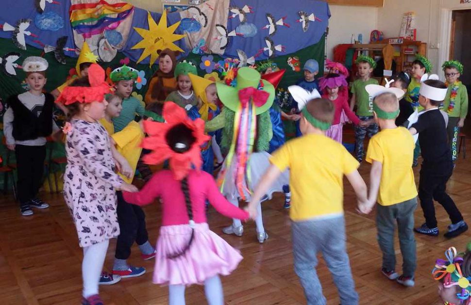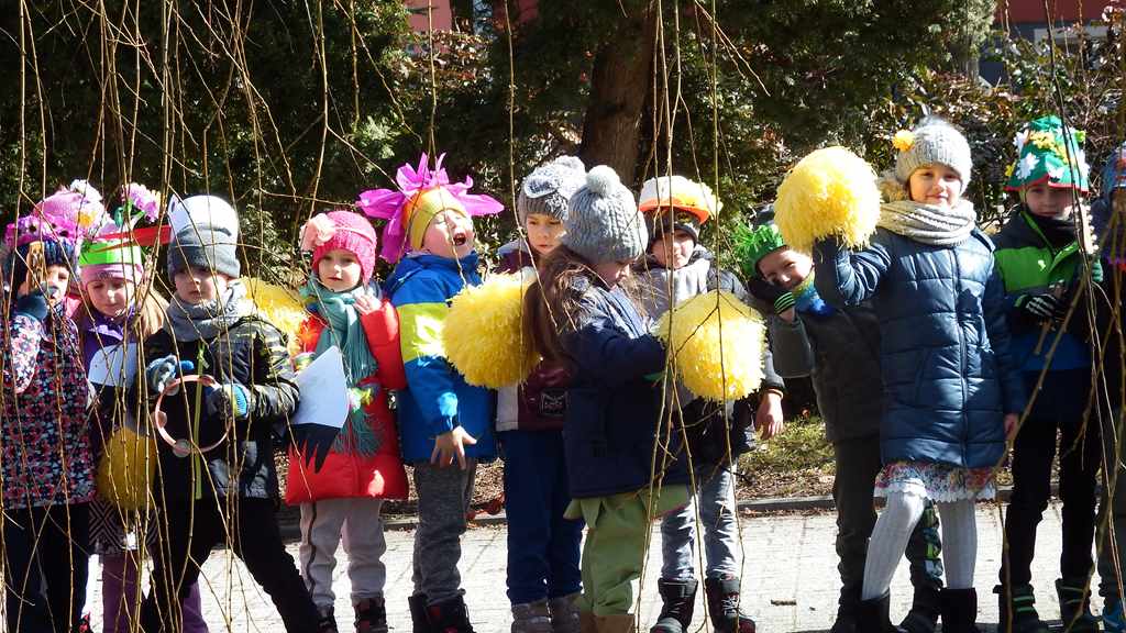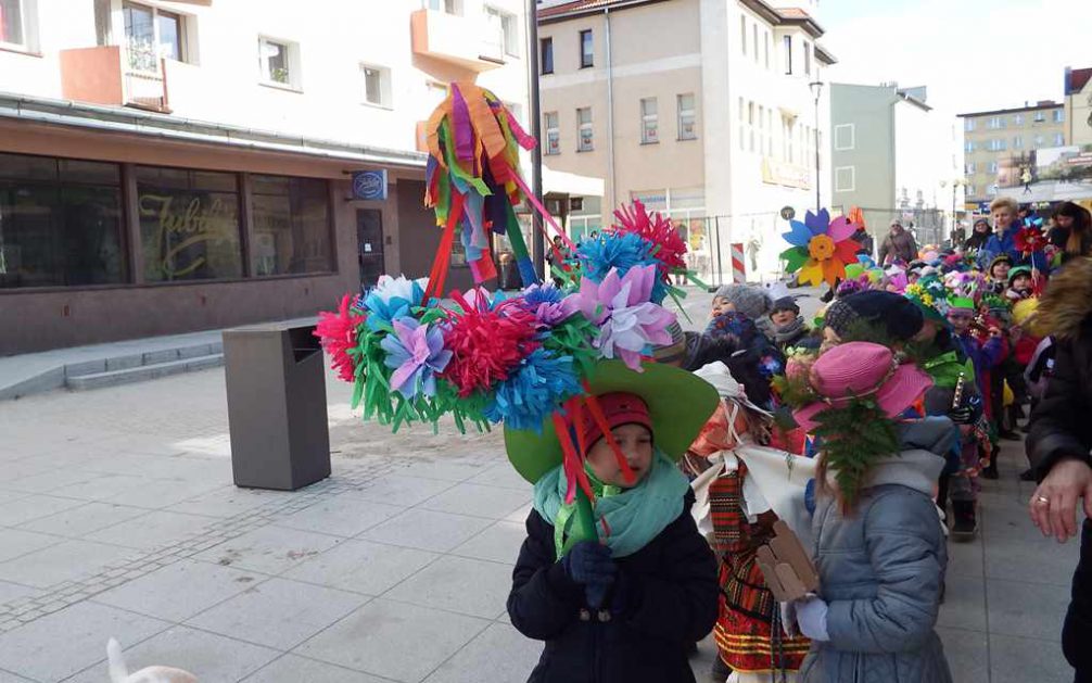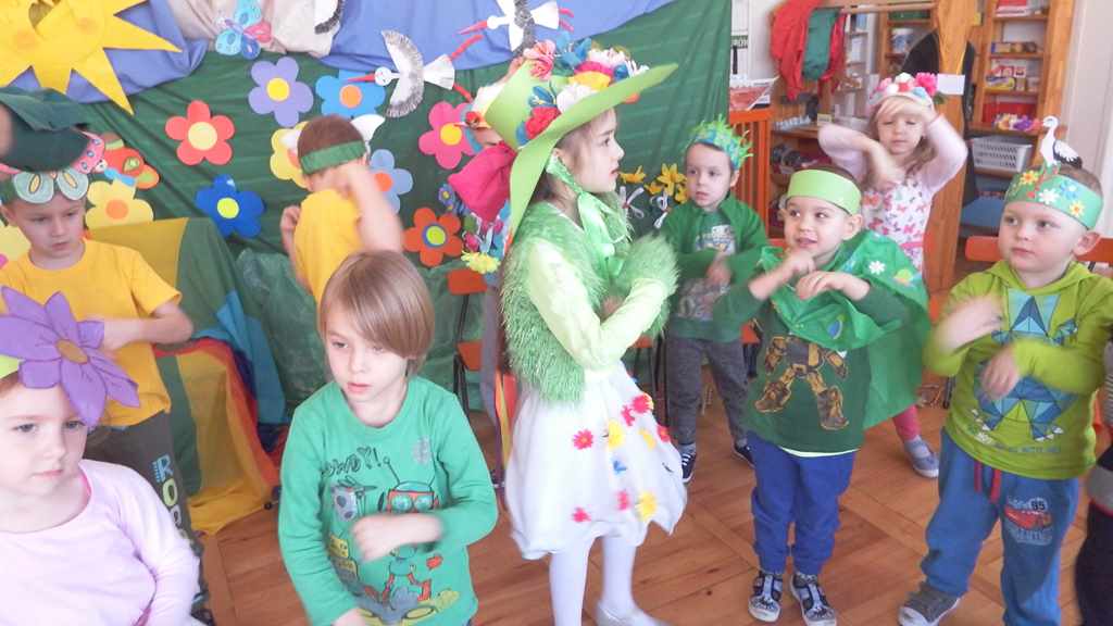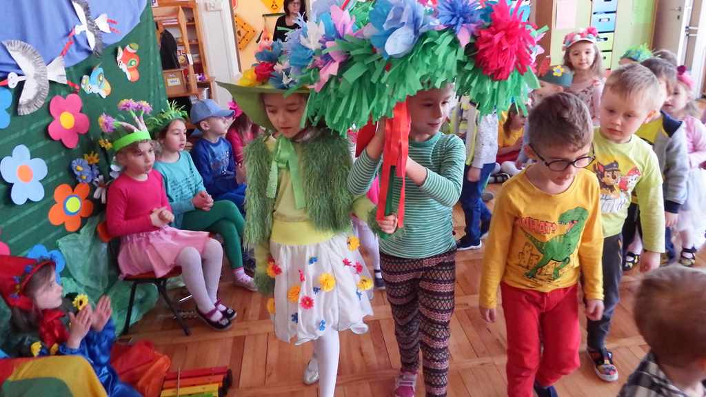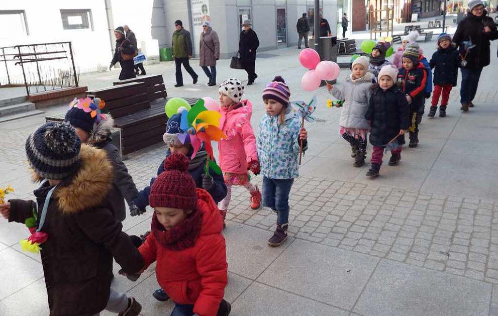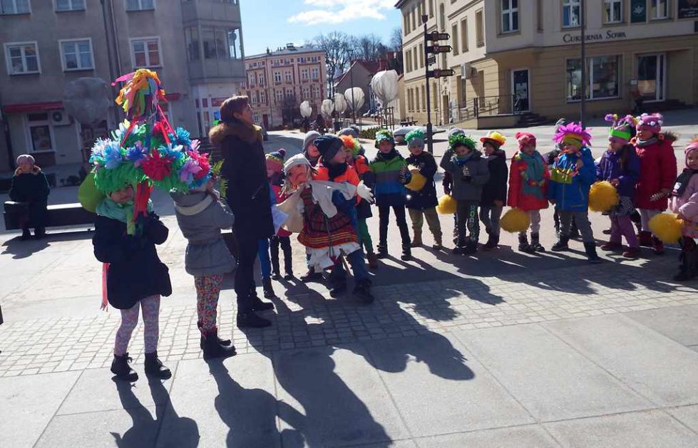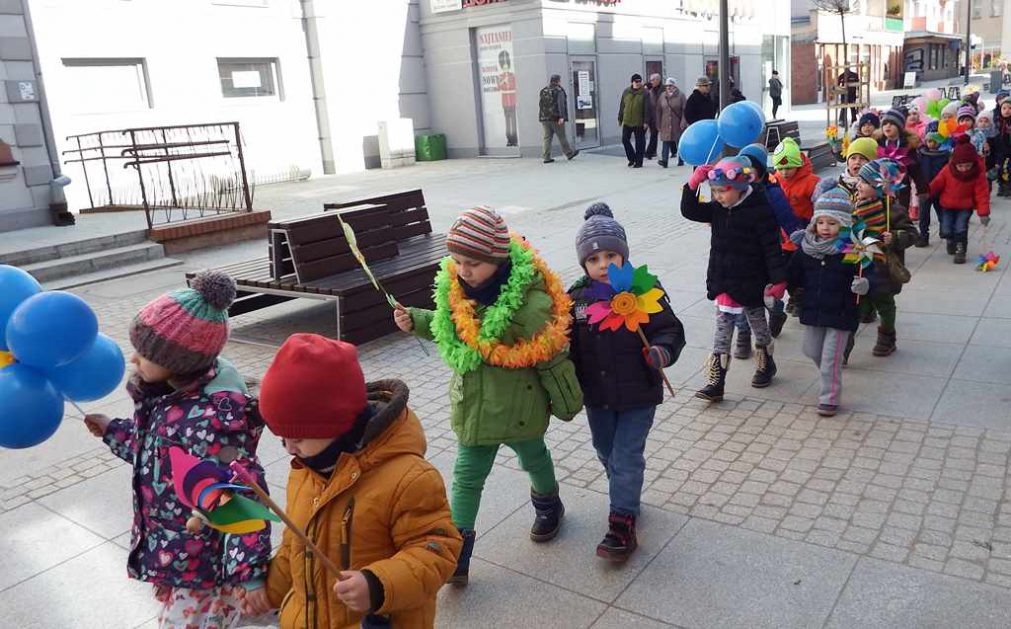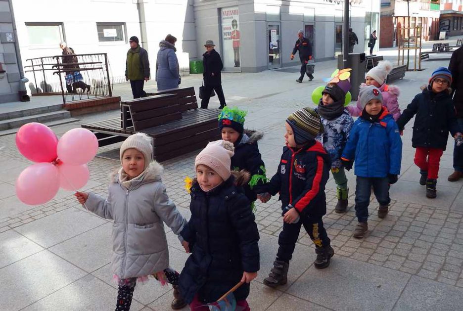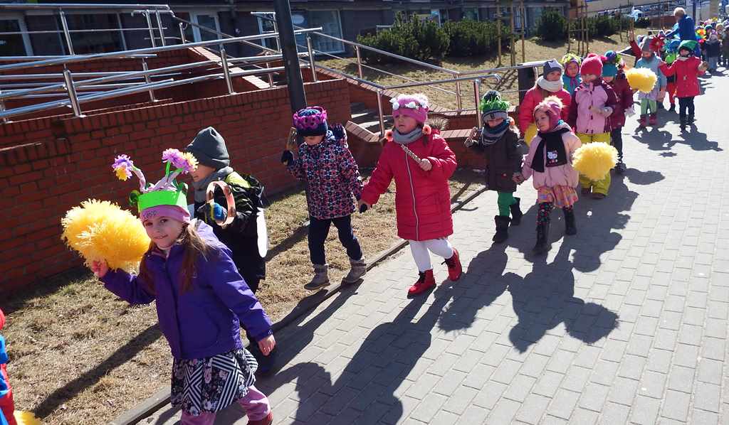 Starszaki zaprosiły wszystkie przedszkolaki na kolorowe przedstawienie ukazujące jak przyjemna to pora roku – Zielona Wiosna. Przy dźwiękach piosenek, z uśmiechem na ustach dzieci ruszyły barwnym korowodem po ulicach naszego miasta, grając i śpiewają rozgłaszały wszem i wobec, że wszystko budzi się do życia, więc cieszmy się i przekazujmy sobie pozytywną energię!