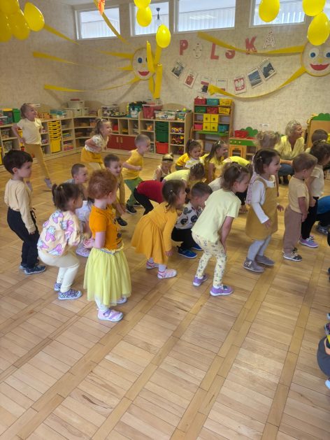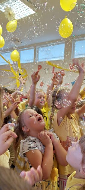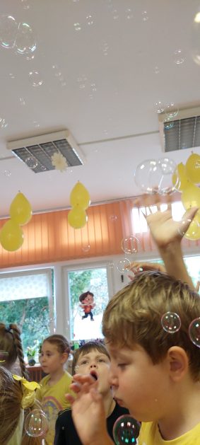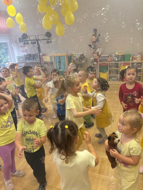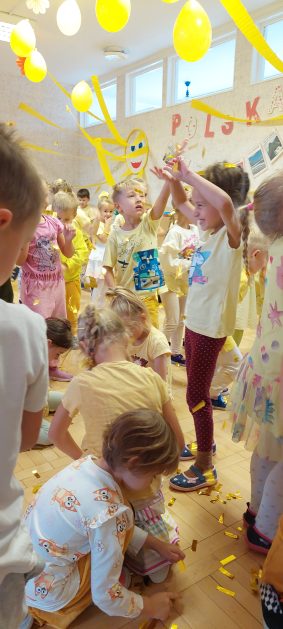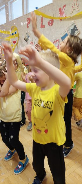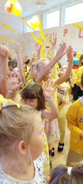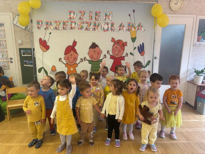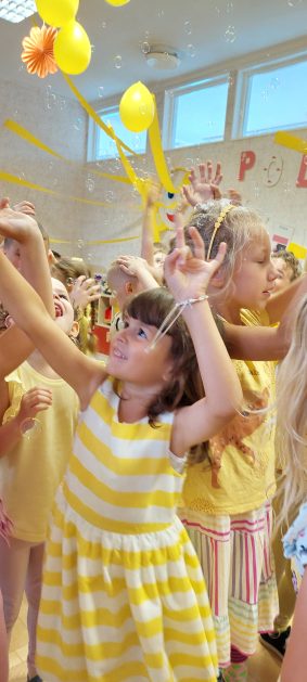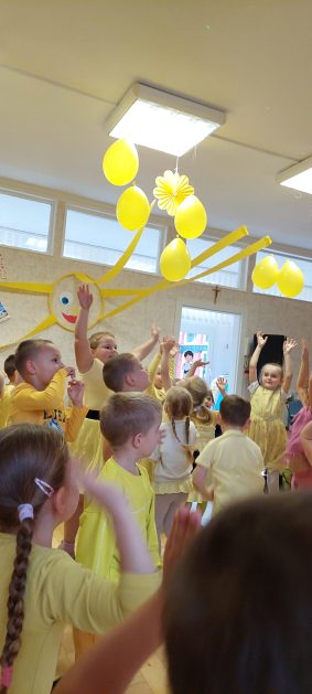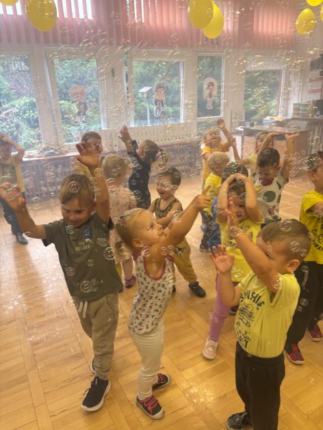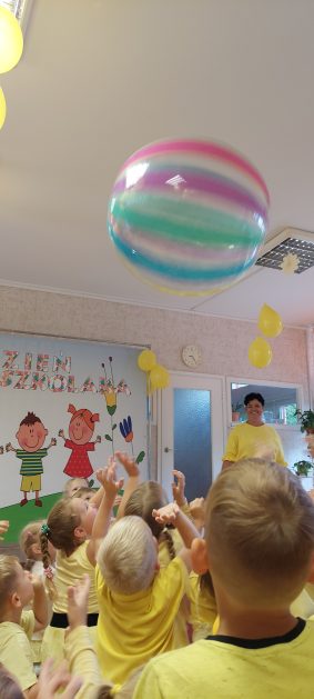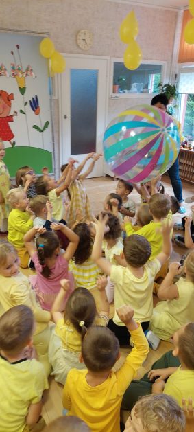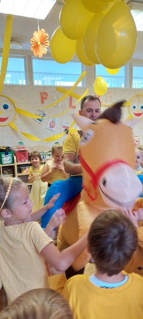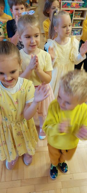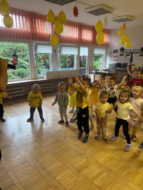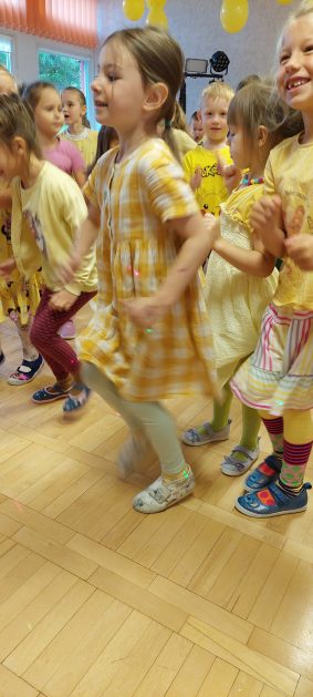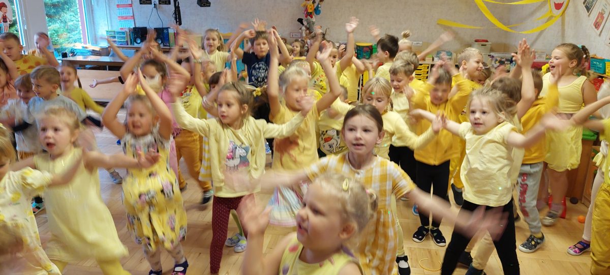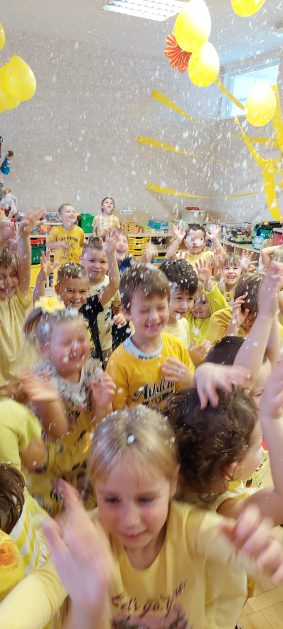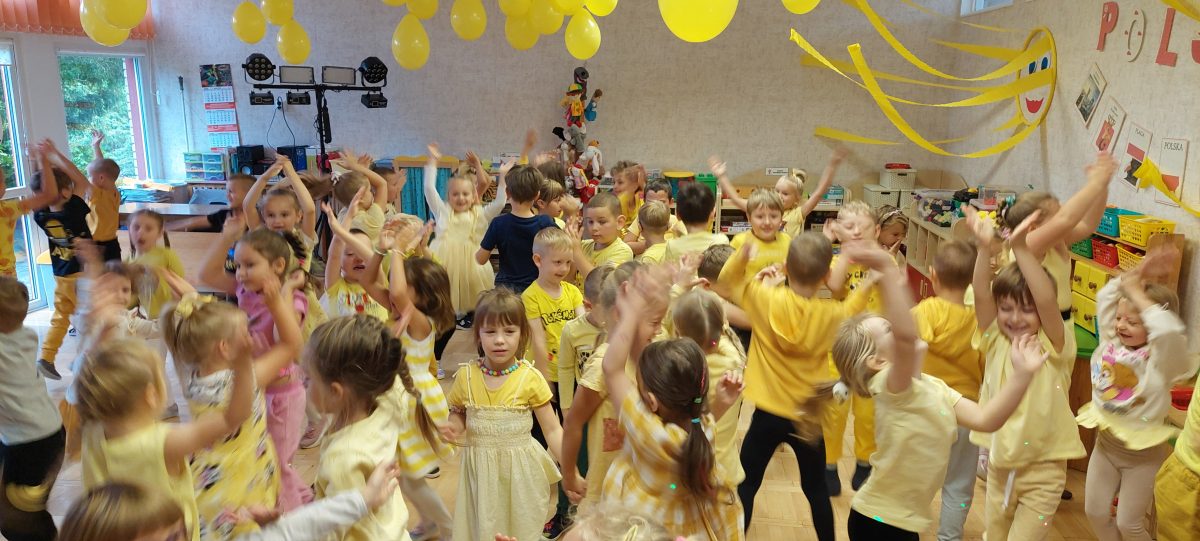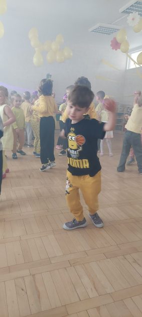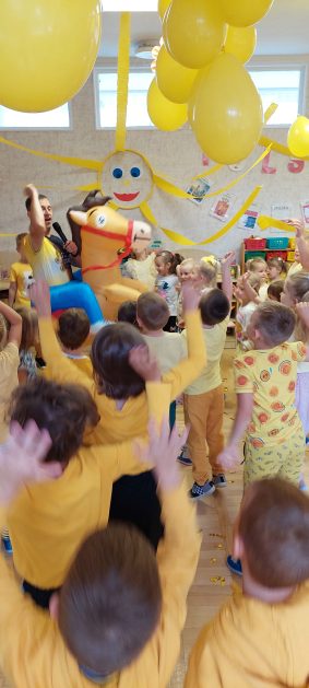 W kalendarzu Ogólnopolski Dzień Przedszkolaka przypada 20 września, my świętowaliśmy 18 września. Święto zostało ustanowione przez Sejm, by podkreślić wagę edukacji przedszkolnej w rozwoju i edukacji dzieci oraz ma przyczynić się do popularyzacji wychowania przedszkolnego. Nasze wszystkie słoneczka od rana rozjaśniały przedszkole swoimi żółtymi strojami. Po śniadanku śmiech i tańce wraz z wodzirejem DJ Przemo. Wszyscy tańczyli… trochę lepiej, trochę gorzej ale to co wychodziło dzieciom doskonale to uśmiech od ucha do ucha! Po zabawie Pani dyrektor odwiedziła każdą salę i jeszcze raz złożyła wszystkim dzieciom życzenia: