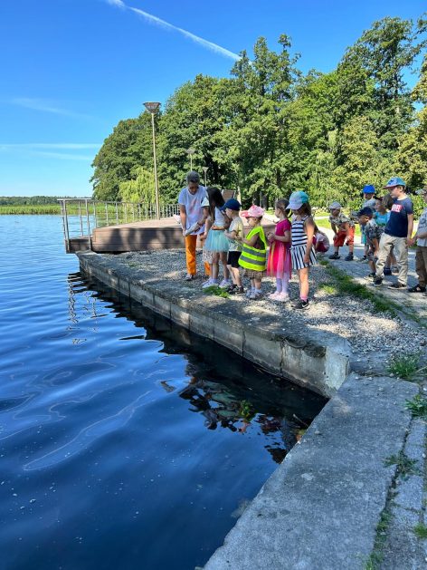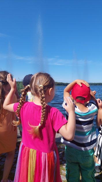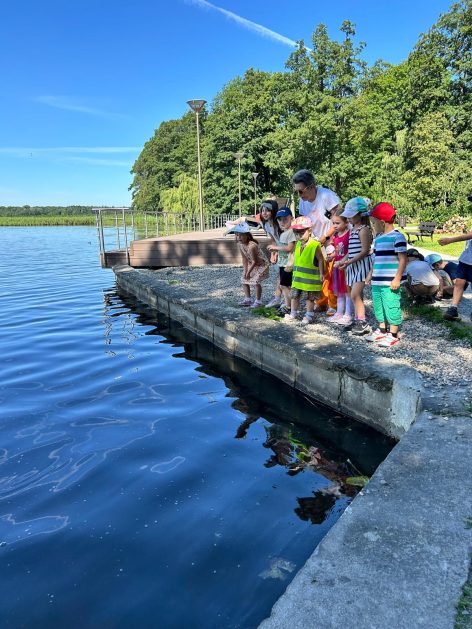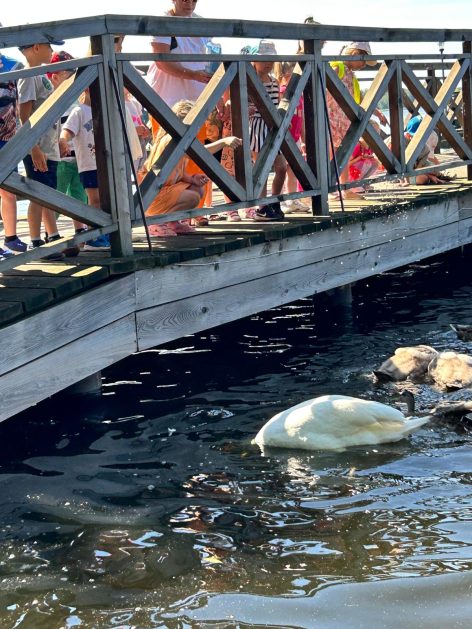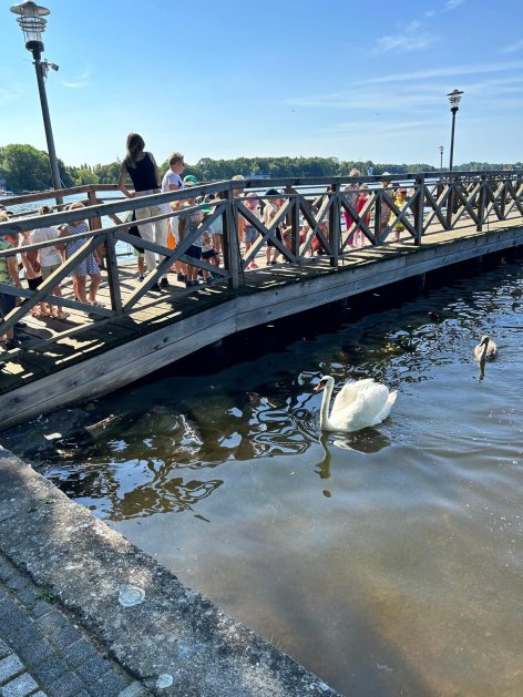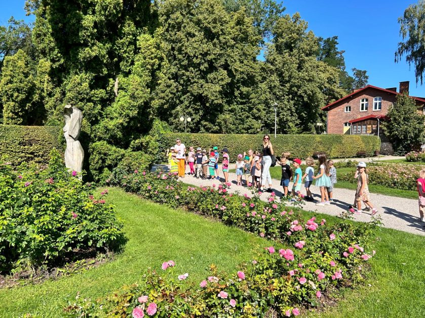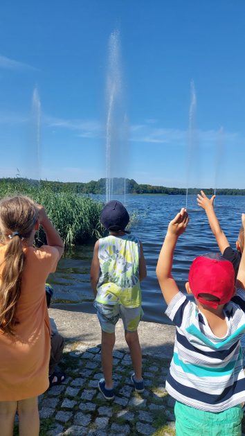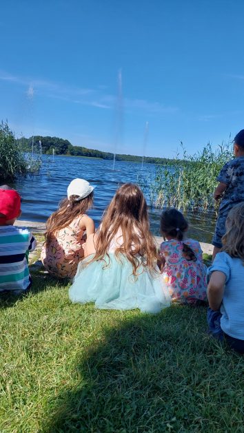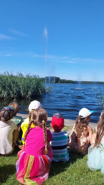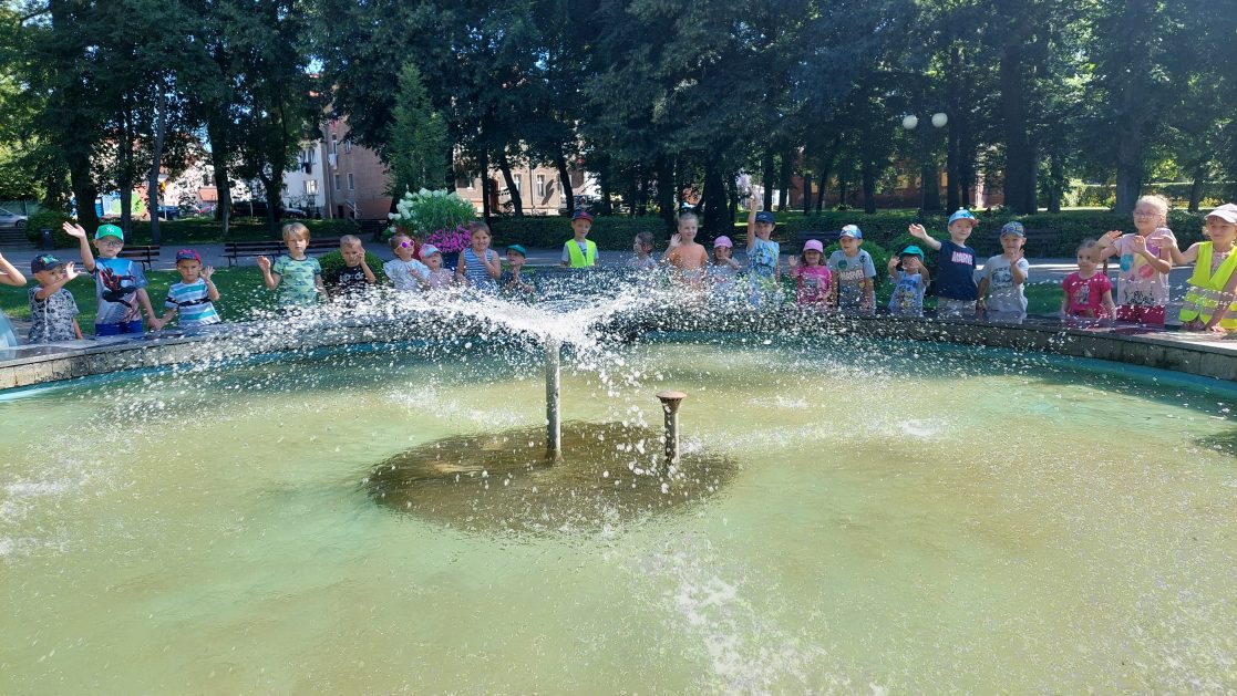 Dzisiaj ostatni dzień wspólnej zabawy. Ten czas spędziliśmy na spacerze w naszym pięknym parku, byliśmy w innej jego części – Ogrodzie Różanym, gdzie dzieci podziwiały Kamellię Japońską. Odwiedziliśmy również wodnych przyjaciół, karmiliśmy kaczki oraz rodzinę łabędzi płatkami owsianymi. Na koniec podziwialiśmy koncert w wykonaniu fontann wodnych, pływających na wysokości placu Kamińskiego, tryskających w rytm muzyki, którą można zaprogramować za pomocą aplikacji na smartfonie. To jedna z atrakcji nad jeziorem w szczecineckim parku. Kropelki wody ochłodziły nas podczas powiewu wiatru, wywołując u dzieci dużo radości.