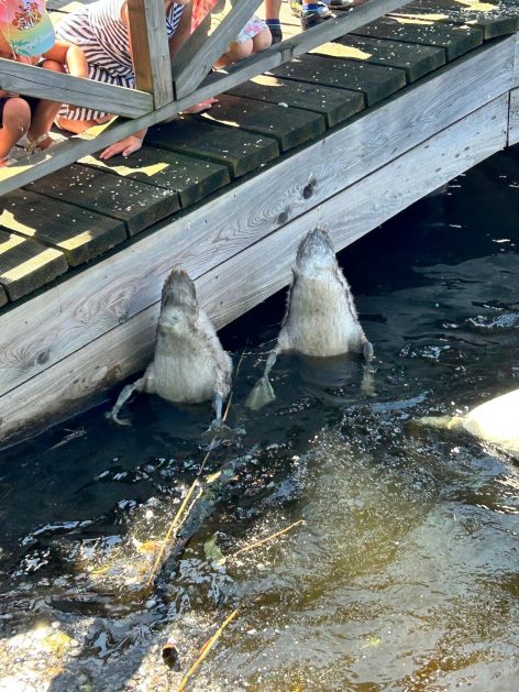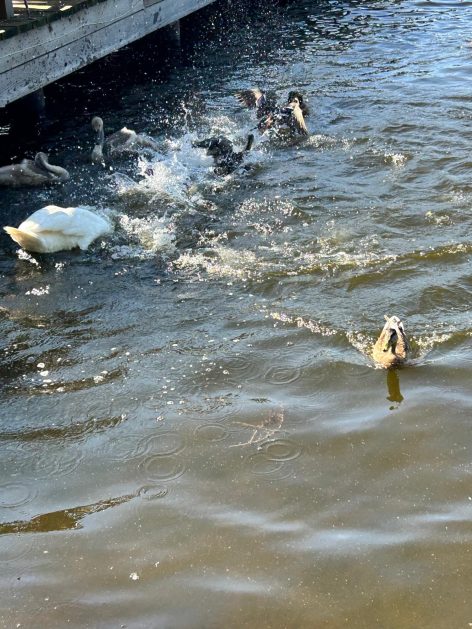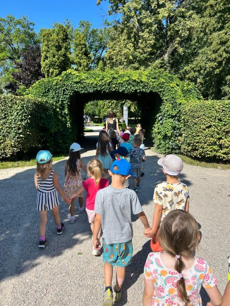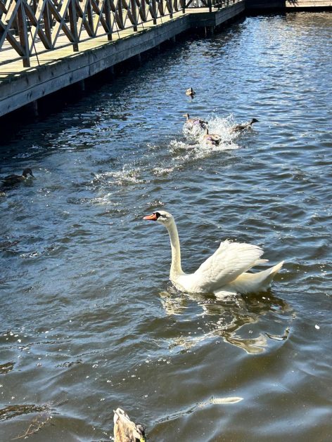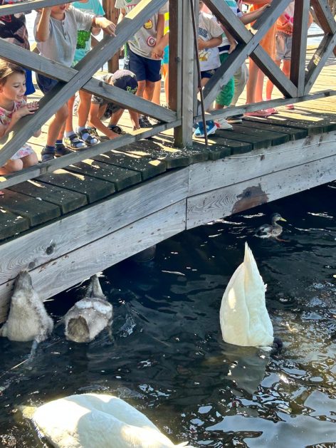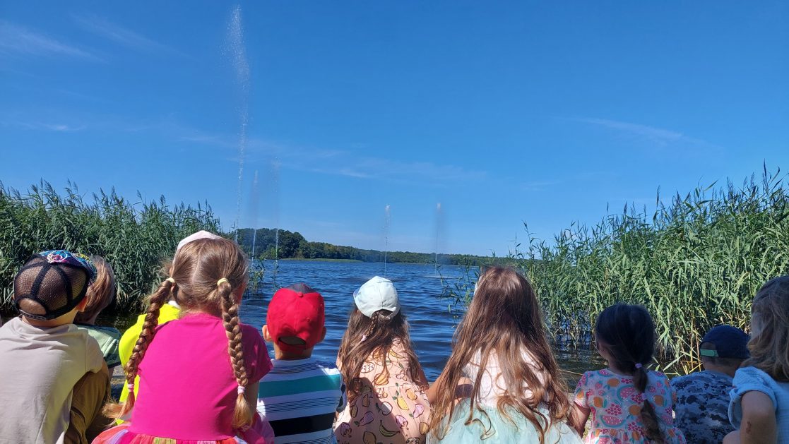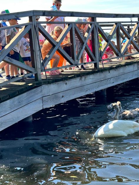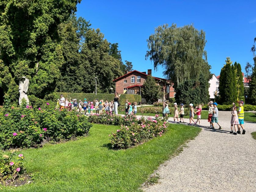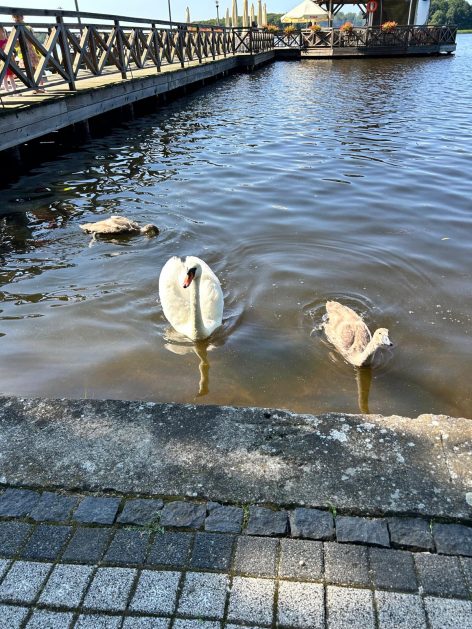 Dzisiaj ostatni dzień wspólnej zabawy. Ten czas spędziliśmy na spacerze w naszym pięknym parku, byliśmy w innej jego części – Ogrodzie Różanym, gdzie dzieci podziwiały Kamellię Japońską. Odwiedziliśmy również wodnych przyjaciół, karmiliśmy kaczki oraz rodzinę łabędzi płatkami owsianymi. Na koniec podziwialiśmy koncert w wykonaniu fontann wodnych, pływających na wysokości placu Kamińskiego, tryskających w rytm muzyki, którą można zaprogramować za pomocą aplikacji na smartfonie. To jedna z atrakcji nad jeziorem w szczecineckim parku. Kropelki wody ochłodziły nas podczas powiewu wiatru, wywołując u dzieci dużo radości.