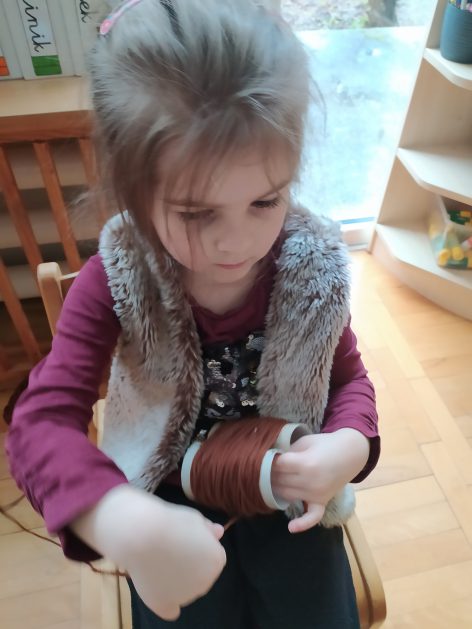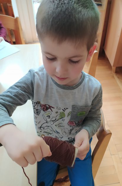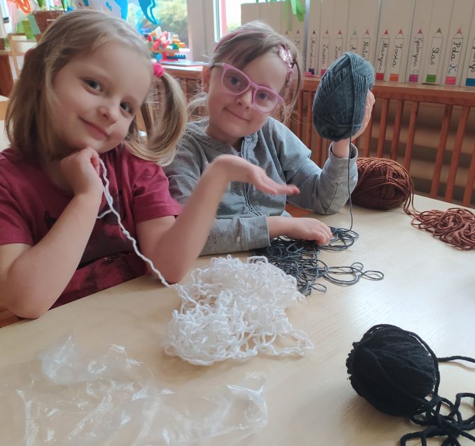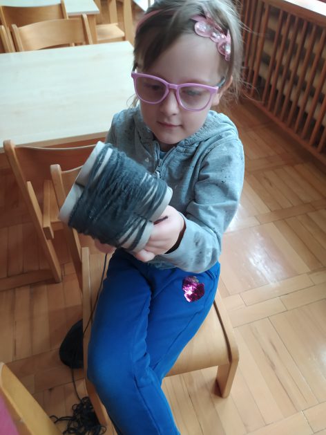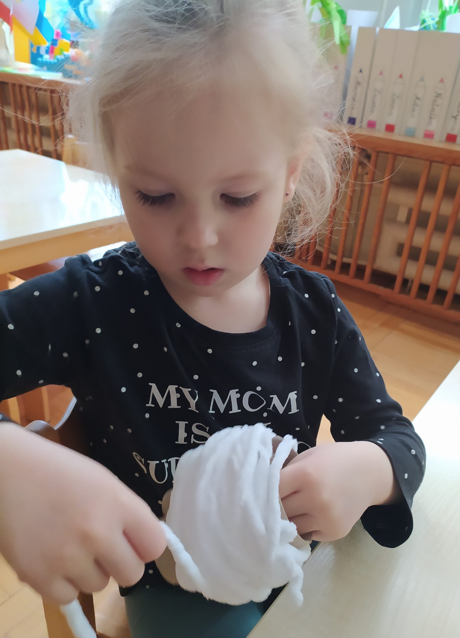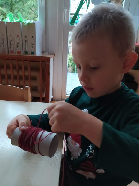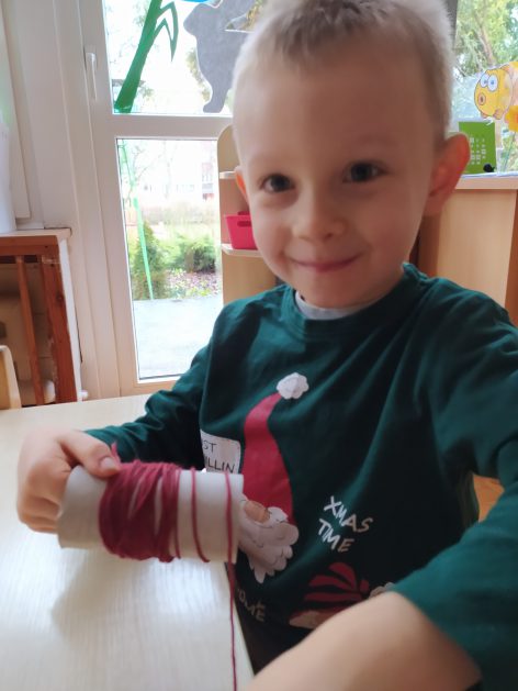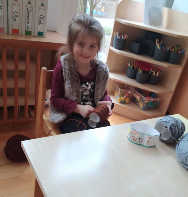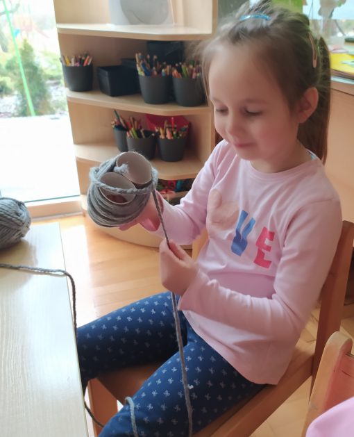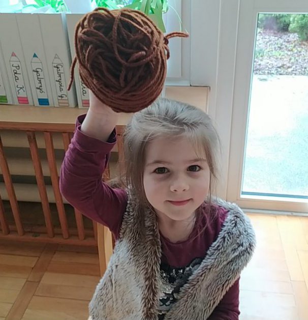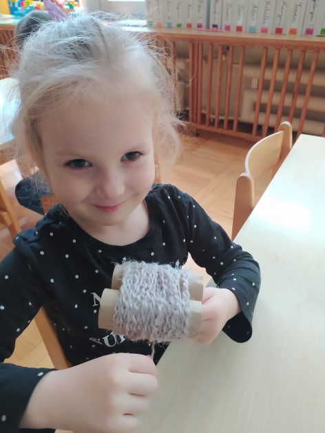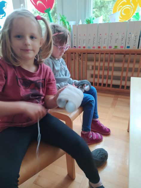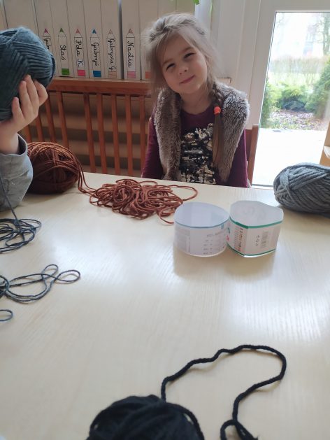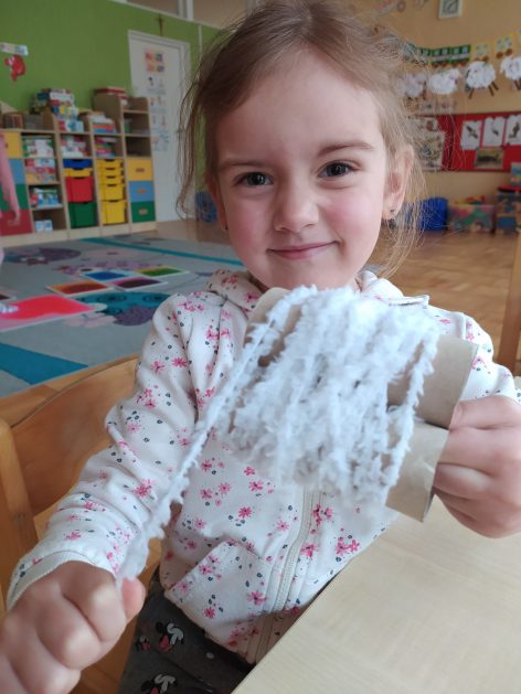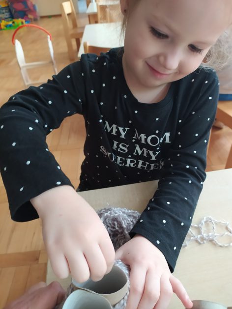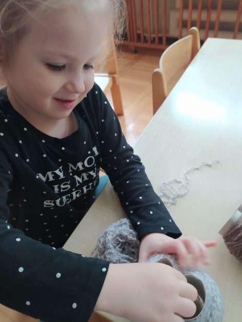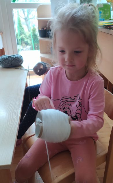 4 latki przygotowują się do kiermaszu wielkanocnego. Chcemy zrobić świąteczne owieczki. Uczymy się jak zrobić pomponik z włóczki. Sprawne rączki mamy i …..nawijamy, nawijamy……