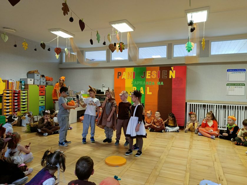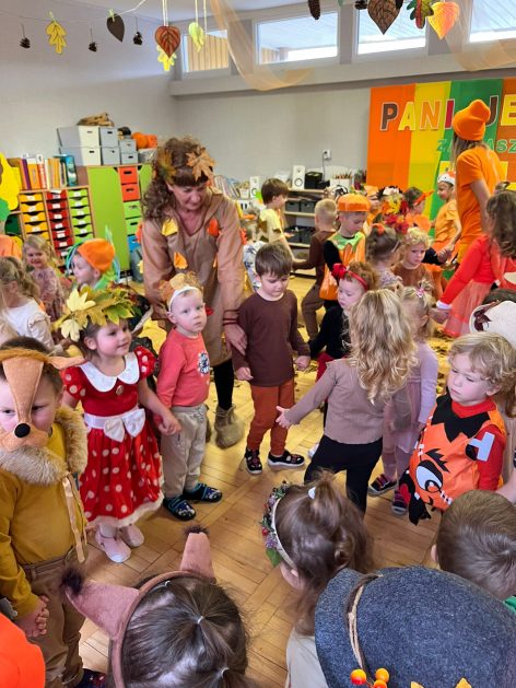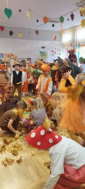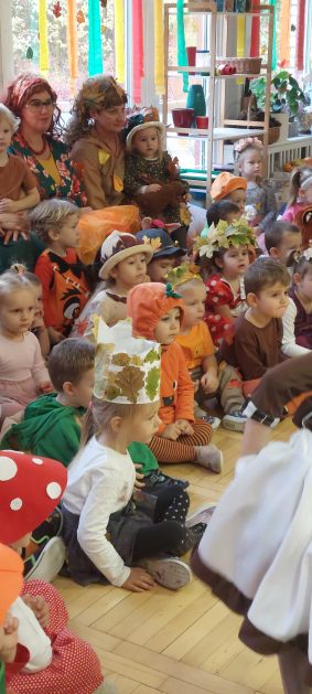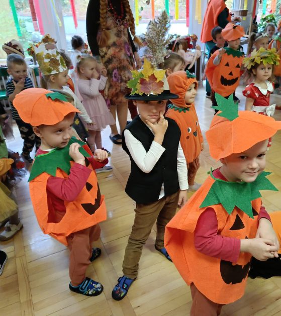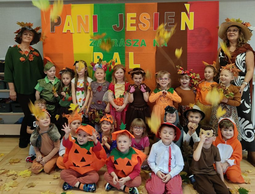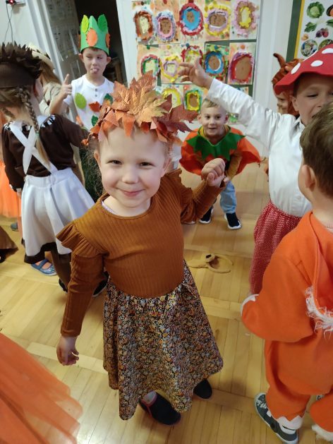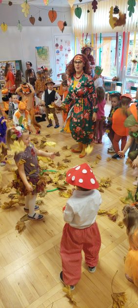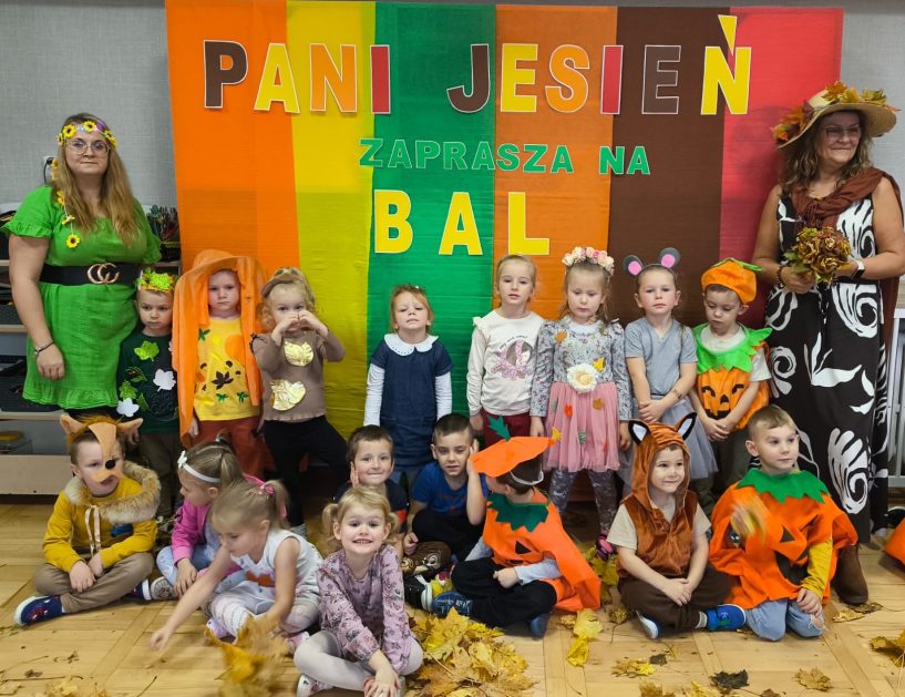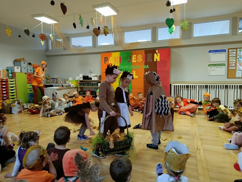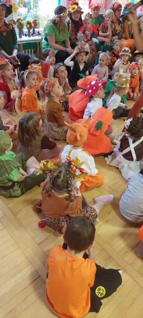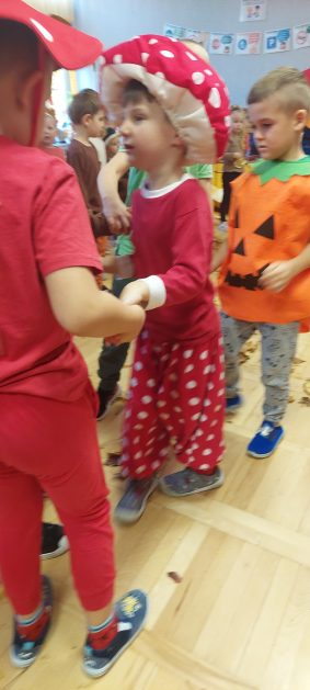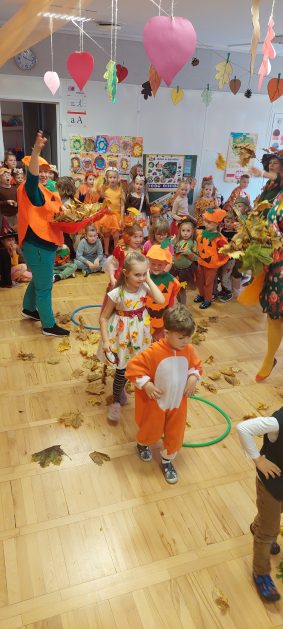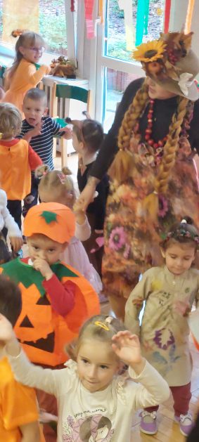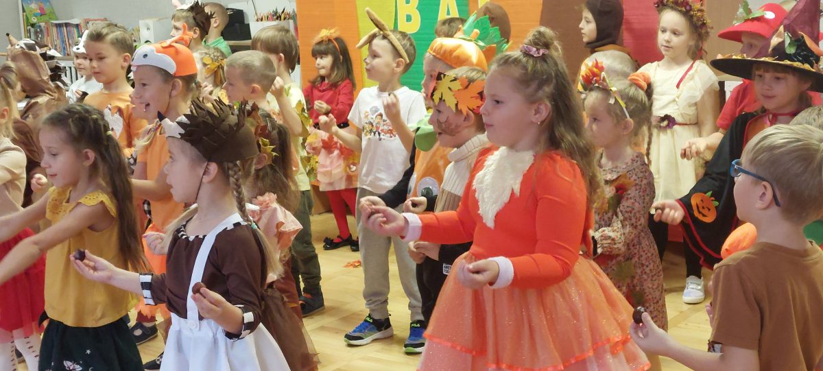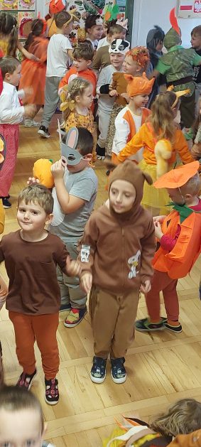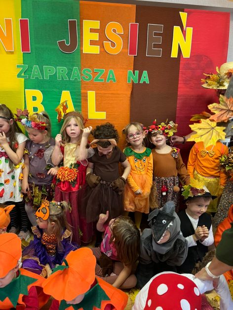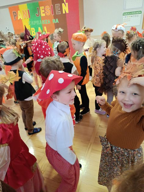 Liście opadają z drzew i jest chłodno, szaro, buro, brryy! A u nas cieplutko i kolorowo, Pani Jesień ma inne oblicze, jest kolorowa, do tańca i zabawy gotowa! Mimo, że to nie karnawał, u nas w przedszkolu bawiliśmy się na balu u Pani Jesieni. Starszaki przygotowały krótkie przedstawienie jesienne i na koniec zaprosiły wszystkie przepięknie, kolorowo i tematycznie przebrane jeżyki, wiewióreczki, ptaszki, myszki, liski, dynie, muchomorki, kasztanki do wesołej zabawy.