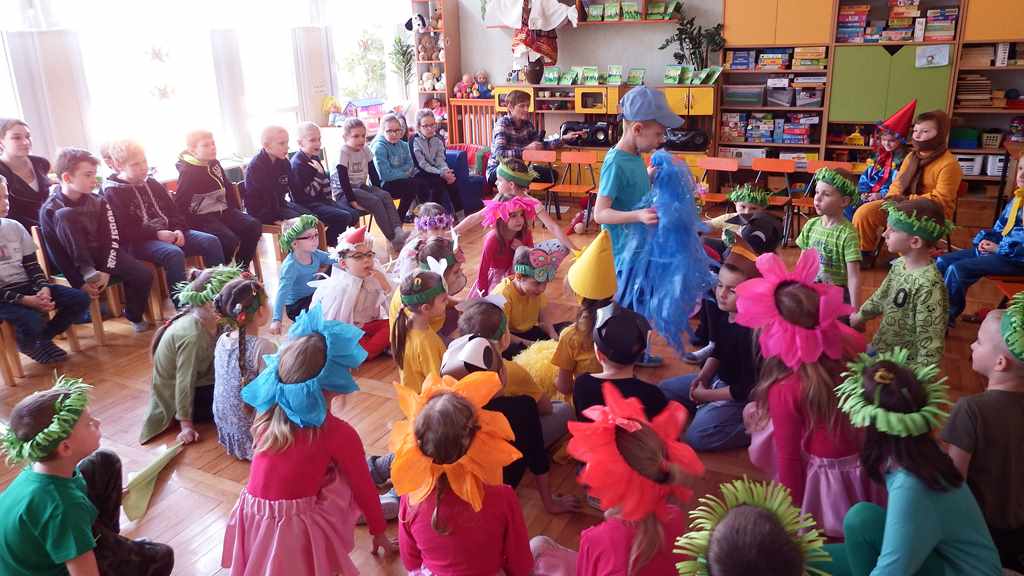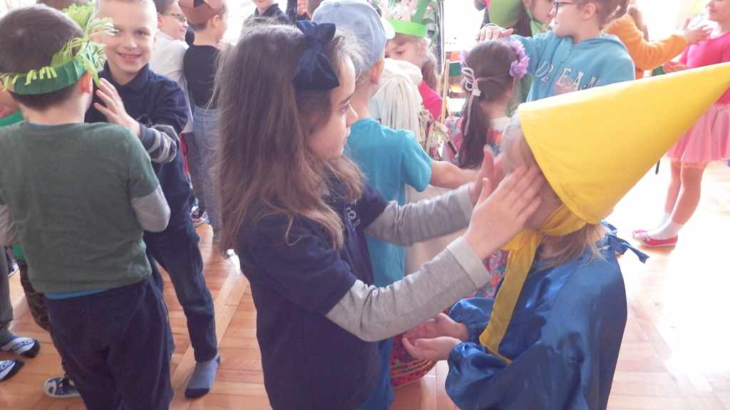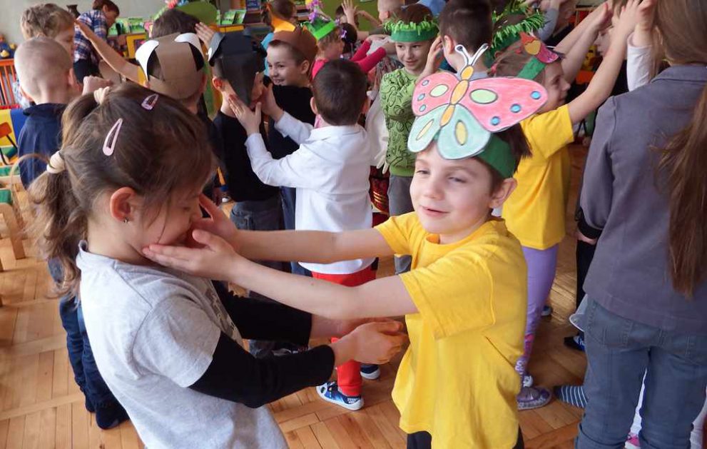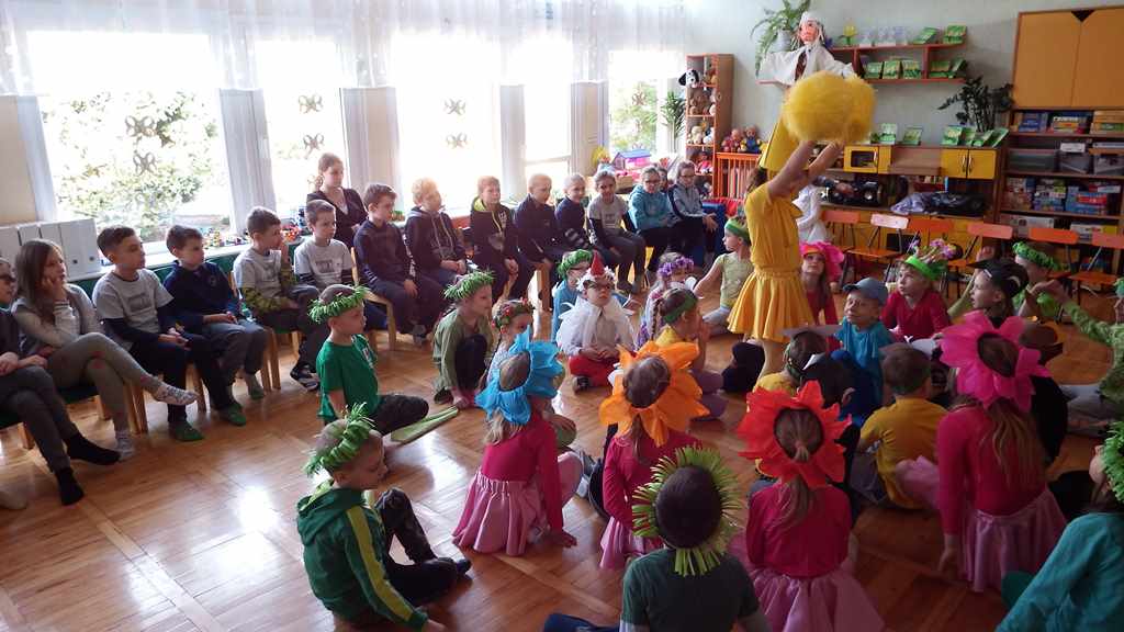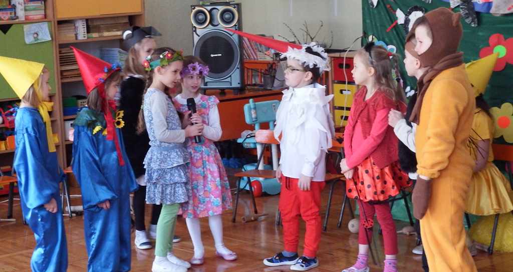 W ramach współpracy przedszkola ze szkołą podstawową nr 6 dzieci z grup 6 i 5-6 latków zaprosiły uczniów klas I na przedstawienie z okazji Powitania Wiosny. Wesołe, kolorowe przedstawienie zakończyło się wspólną zabawą przy muzyce.