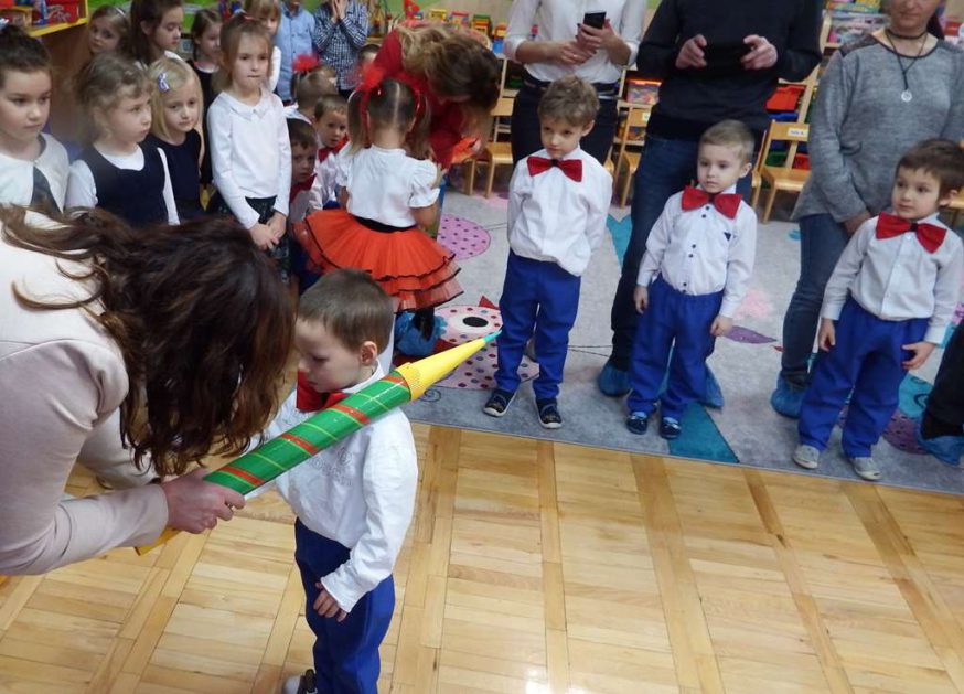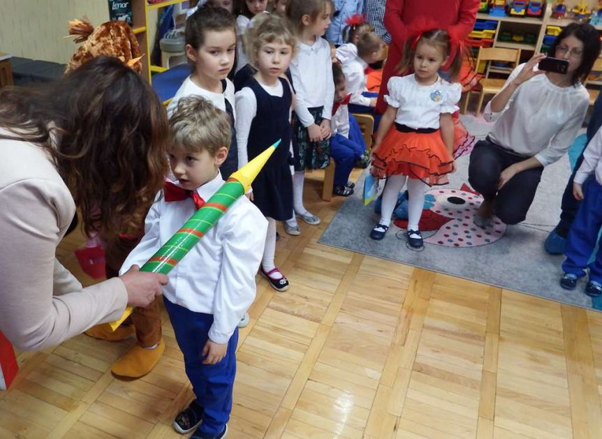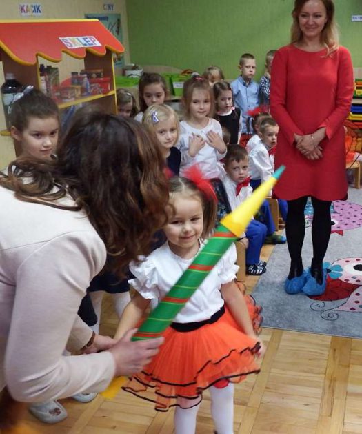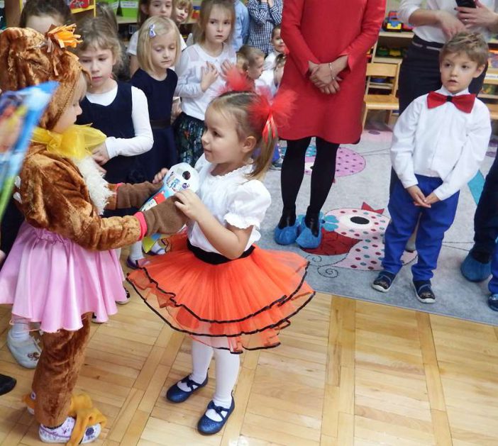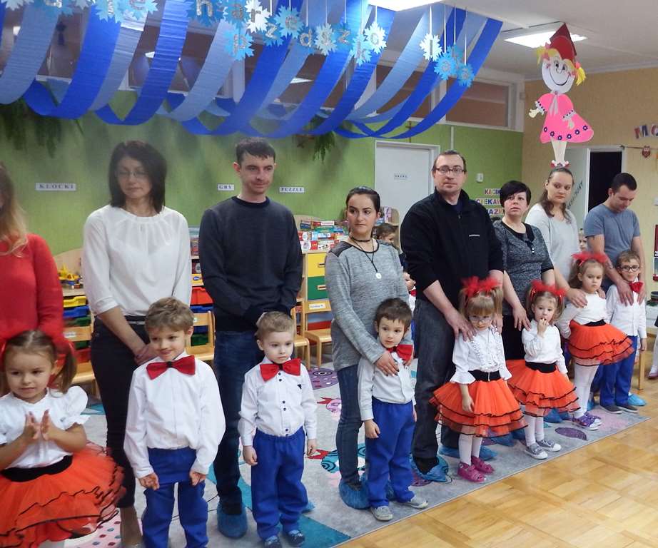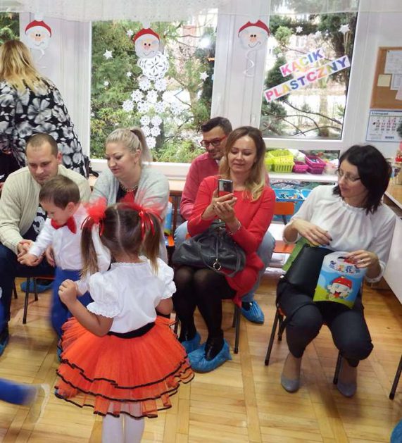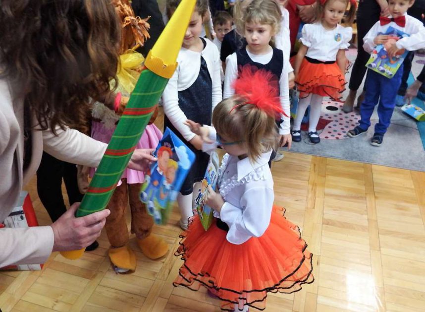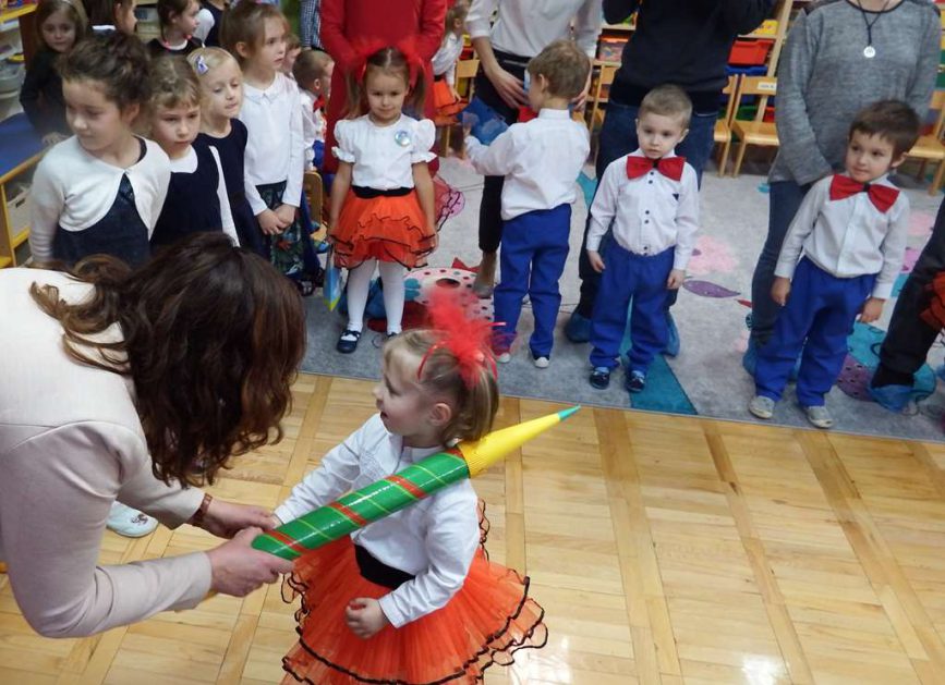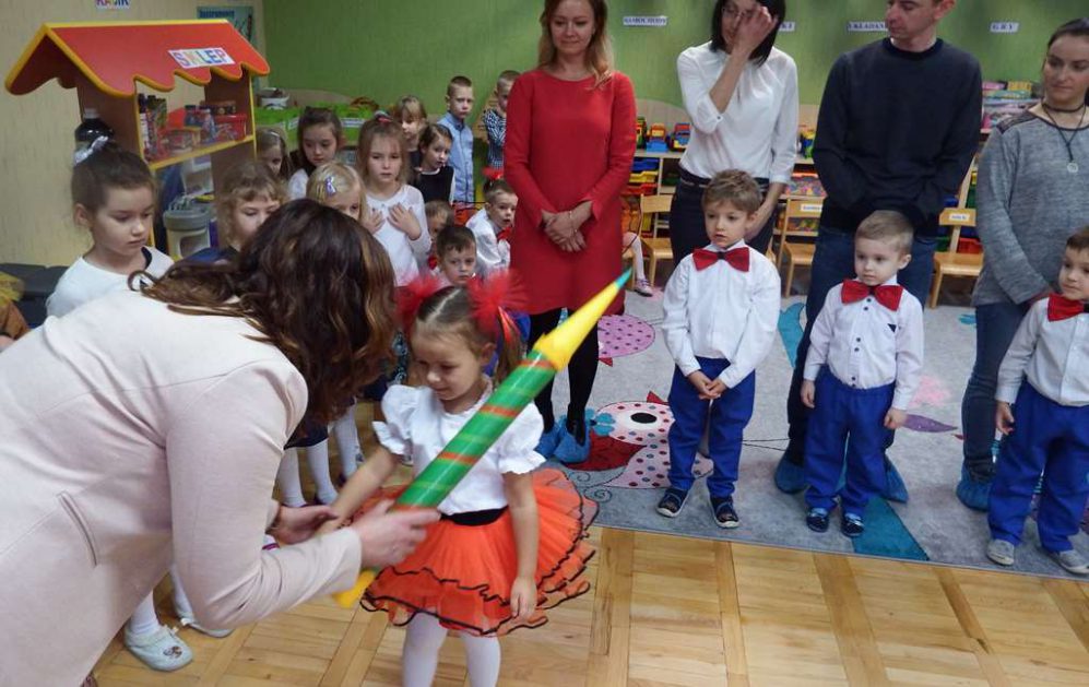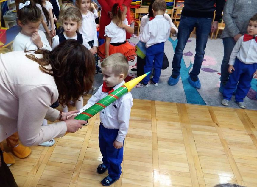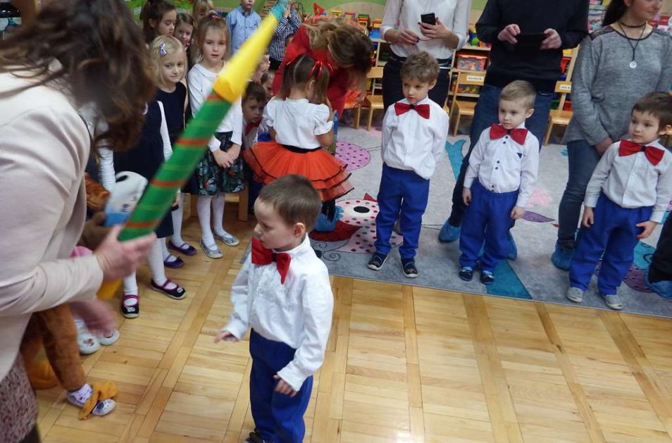 14 grudzień – kalendarz ważną datę wskazuje, bo Pani dyrektor niektóre 4 latki na przedszkolaki pasuje. Ale zanim się to stanie, każde dziecko musiało wykonać zadanie. Dzieci dzielnie się spisały, zatańczyły, zaśpiewały, na pytania odpowiadały, różne zagadki rozwiązywały. Rodzice też wykazać się musieli: zatańczyli i przysięgę złożyli. Dzieci obiecały być grzecznymi, dzielnymi przedszkolakami, więc Pani dyrektor wyjścia nie miała i na przedszkolaka dzieci pasowała. Uśmiech na buziach dzieci zagościł, bo dostały dyplom, odznakę i kuferek obfitości.