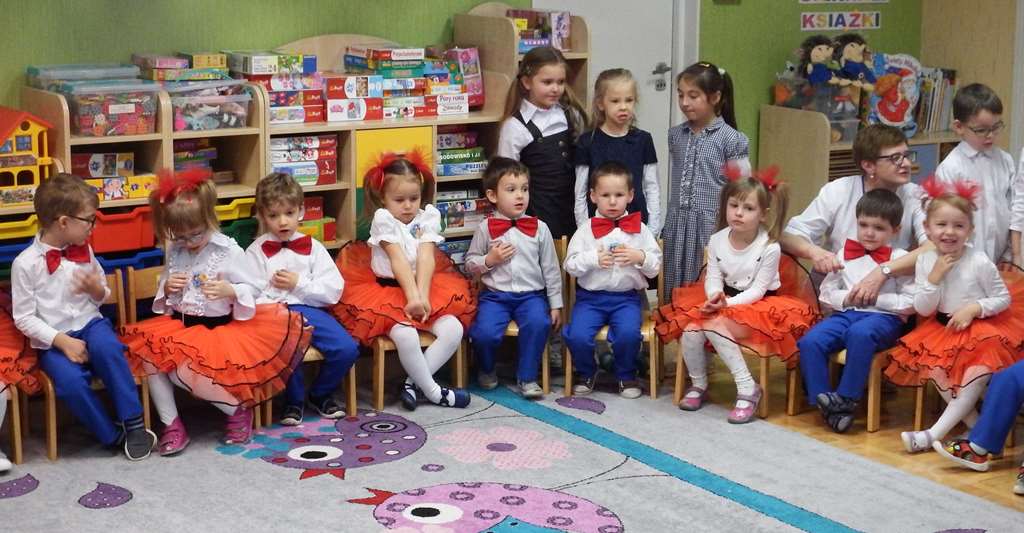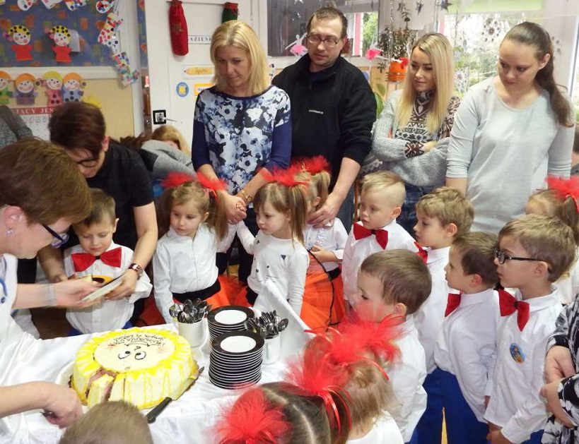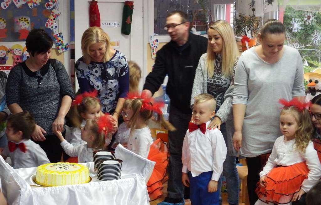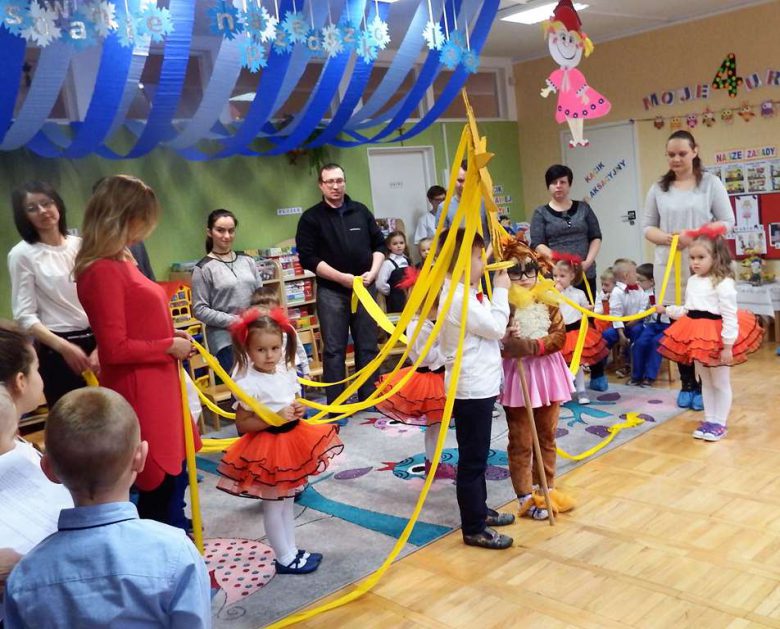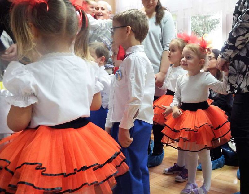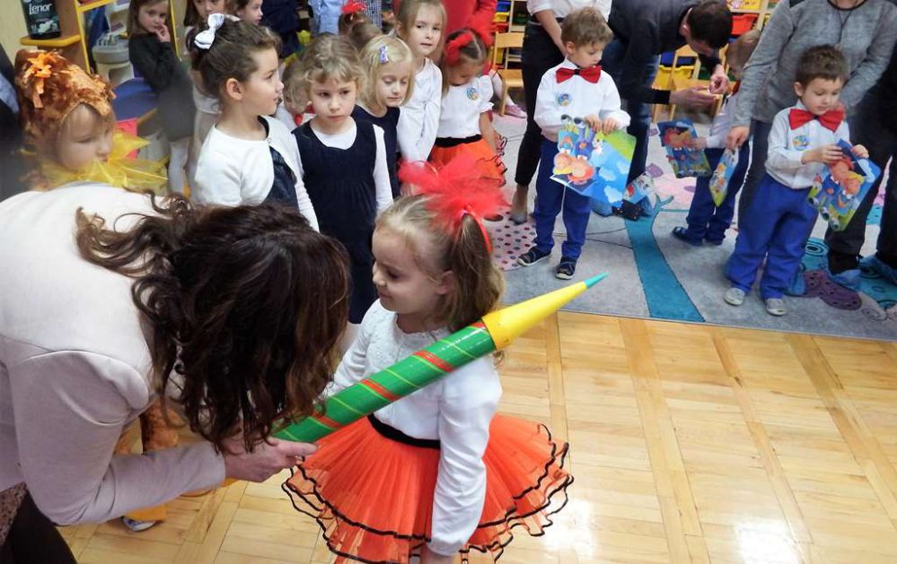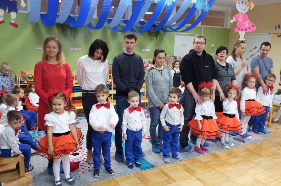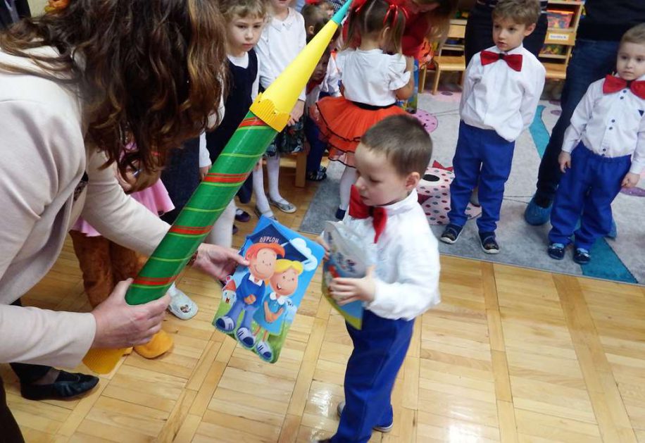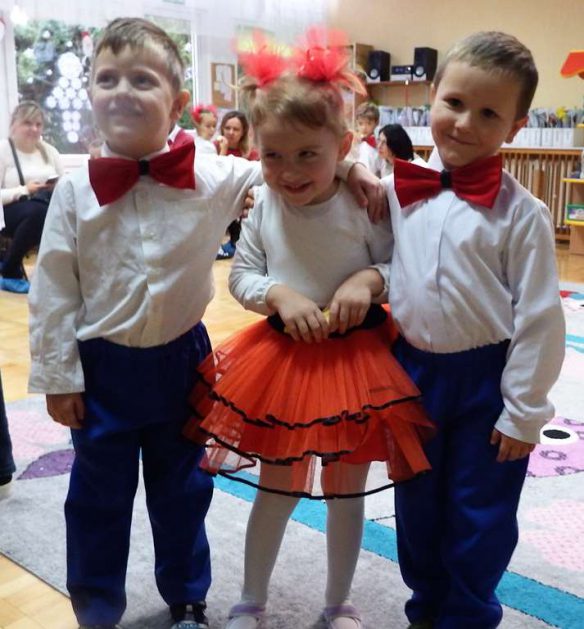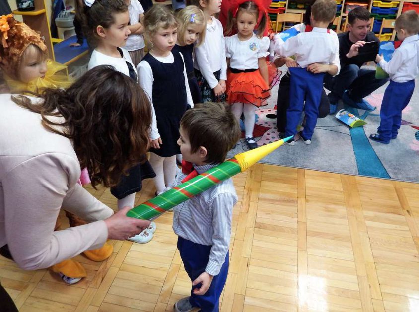 14 grudzień – kalendarz ważną datę wskazuje, bo Pani dyrektor niektóre 4 latki na przedszkolaki pasuje. Ale zanim się to stanie, każde dziecko musiało wykonać zadanie. Dzieci dzielnie się spisały, zatańczyły, zaśpiewały, na pytania odpowiadały, różne zagadki rozwiązywały. Rodzice też wykazać się musieli: zatańczyli i przysięgę złożyli. Dzieci obiecały być grzecznymi, dzielnymi przedszkolakami, więc Pani dyrektor wyjścia nie miała i na przedszkolaka dzieci pasowała. Uśmiech na buziach dzieci zagościł, bo dostały dyplom, odznakę i kuferek obfitości.