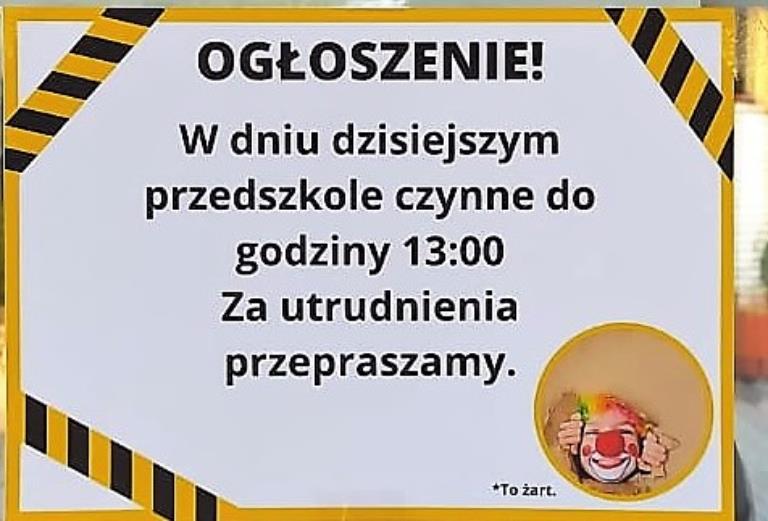 „Przedszkole czynne w dniu dzisiejszym do godziny 13:00 – za utrudnienia przepraszamy!”