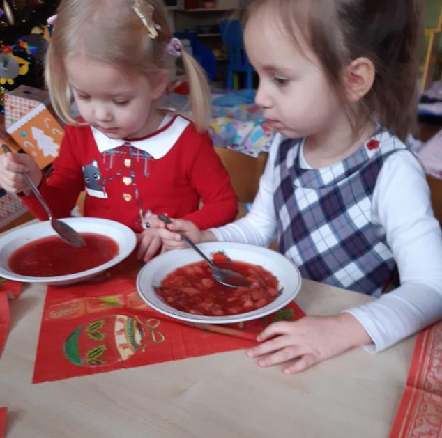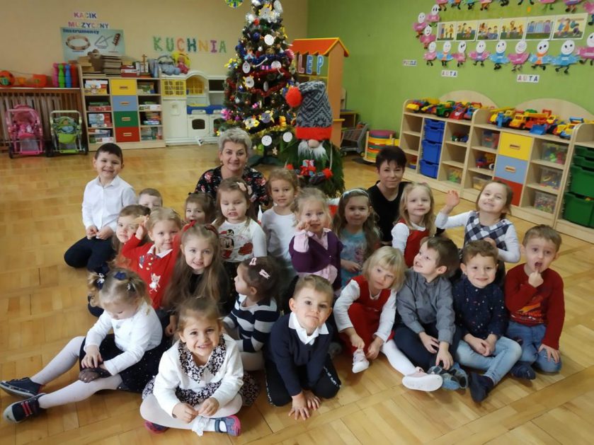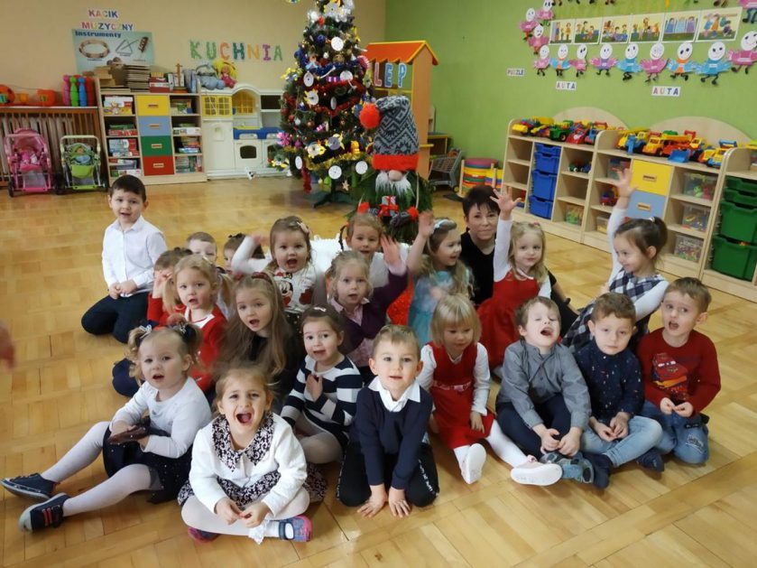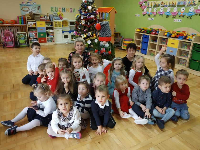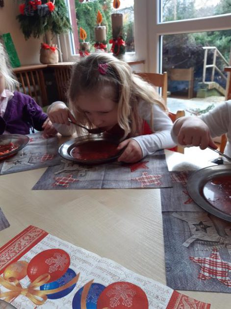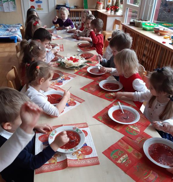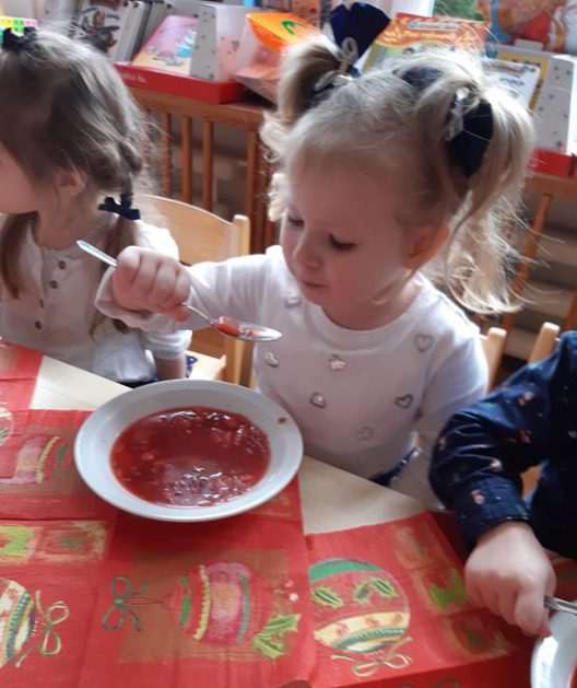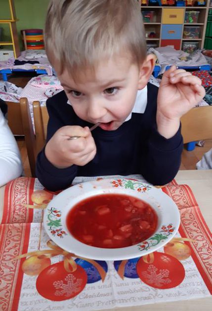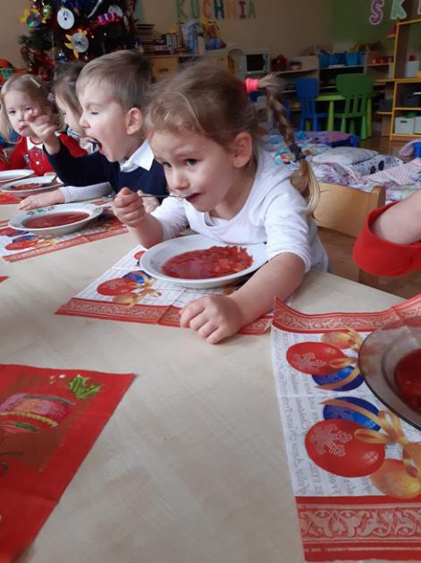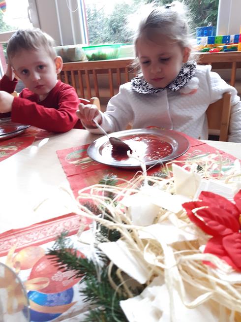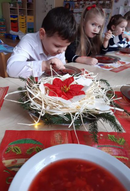 U maluszków już „wyrosła” choinka, dzieci samodzielnie przystroiły ją bombkami i łańcuszkami. 23 grudnia oglądały świąteczny program słowno – muzyczny przygotowany przez starszaki, z zaciekawieniem przyglądały się starszym kolegom przebranym w różne stroje. Po przedstawieniu złożyły sobie życzenia i przy dźwiękach kolęd, pastorałek zasiadły do świątecznego barszczyku, który jak nigdy smakował dzieciom wyśmienicie.