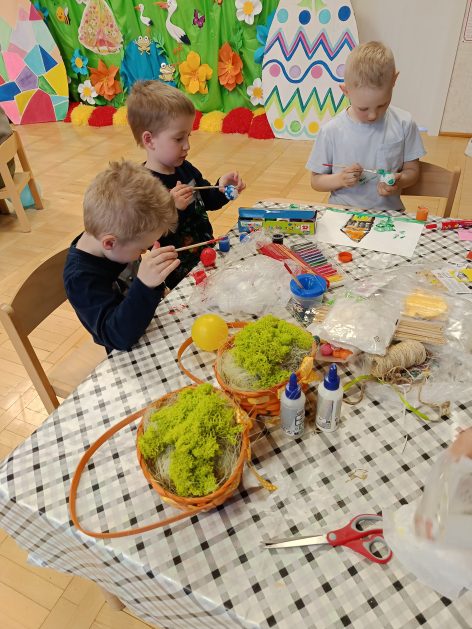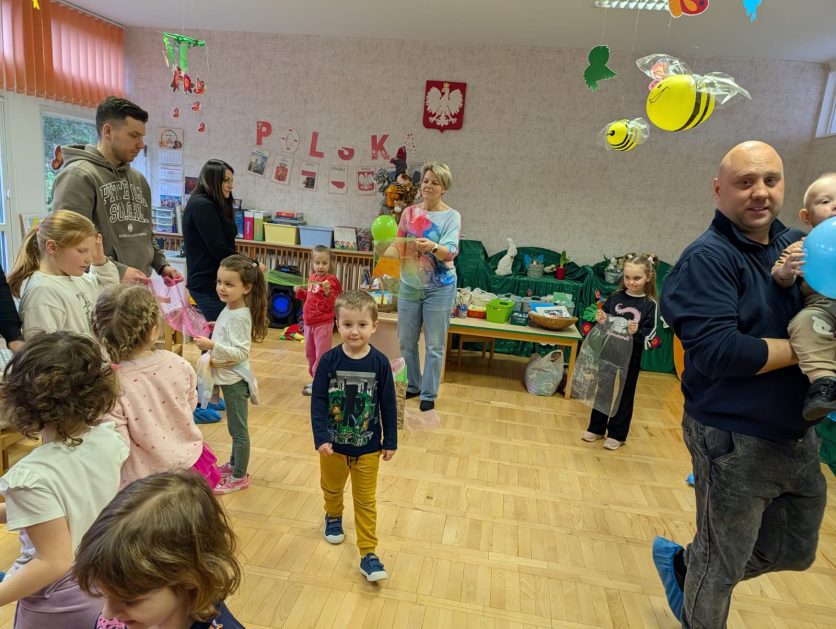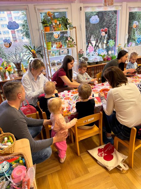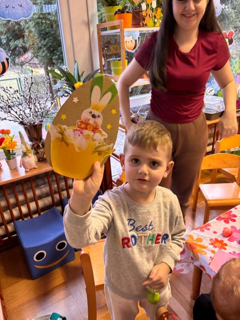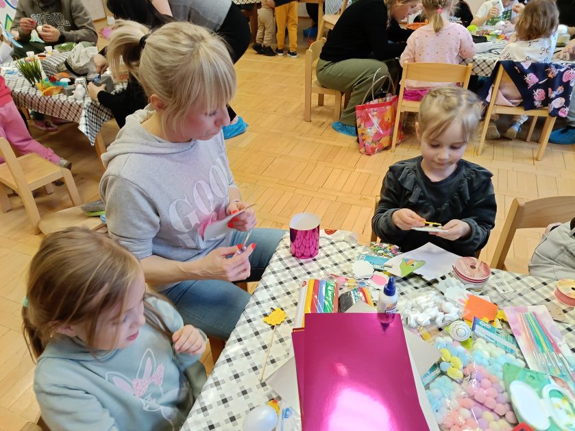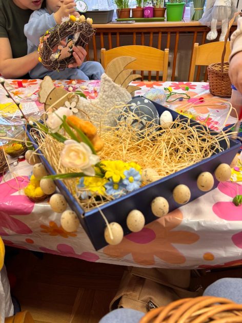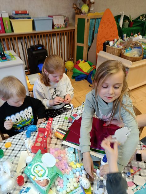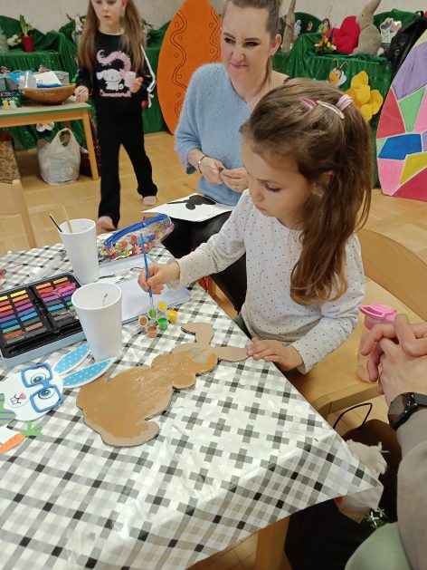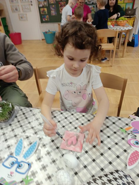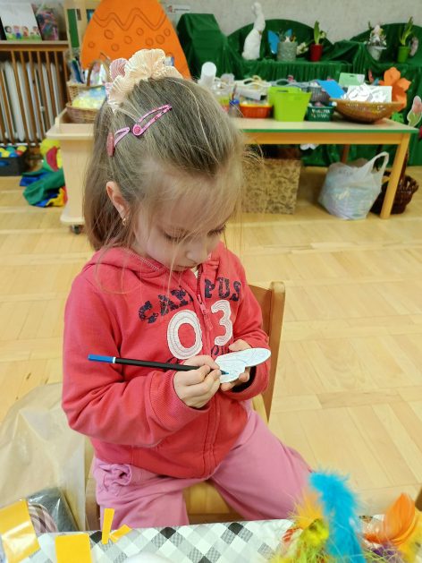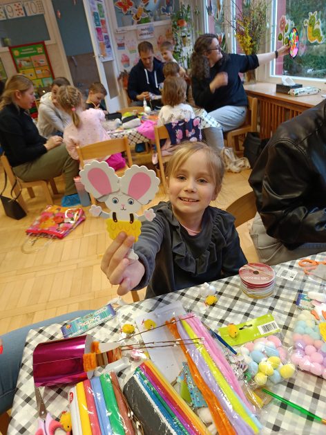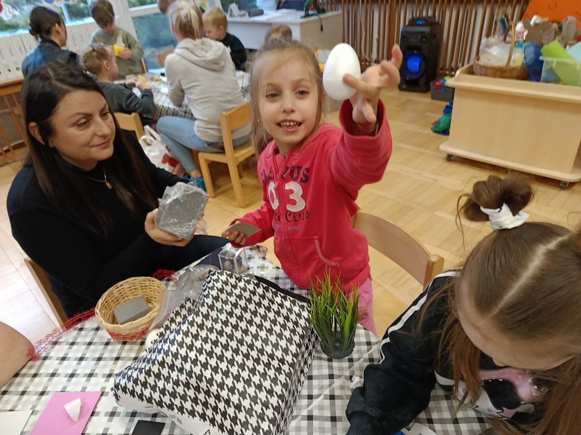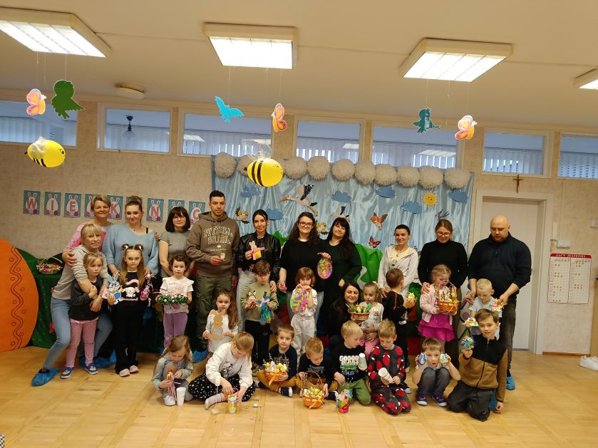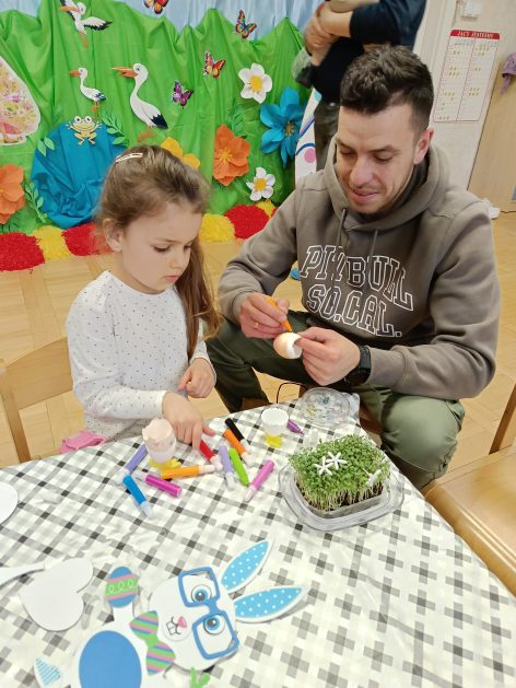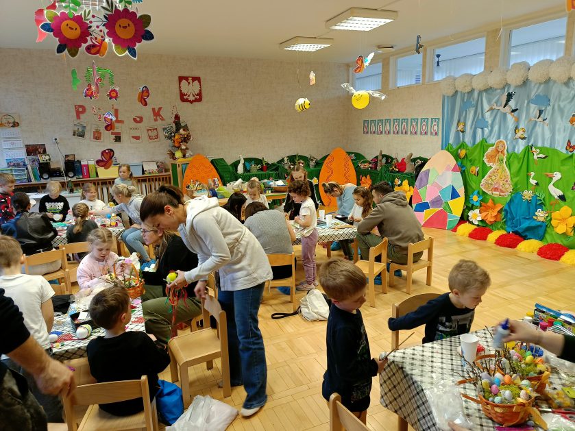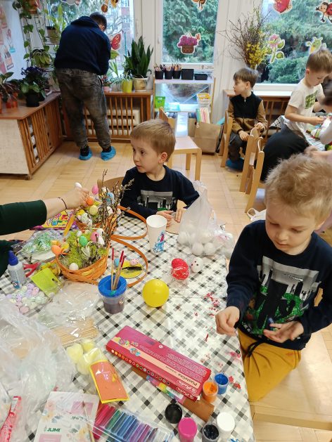 Tak niedawno witaliśmy Wiosnę, która przyniosła nam wyczekiwane ciepłe dni, pierwsze promienie słońca na pięknym, czystym niebie, tchnęła życie i obudziła całą przyrodę ….A tu już tuż, tuż zbliżają się wiosenne Święta Wielkanocne…Wraz ze Świętami w naszym przedszkolu rusza kiermasz świąteczny z którego dochód wspiera działalność szczecineckiego Hospicjum św. Franciszka z Asyżu. Przygotowując się do tego kiermaszu grupy 3, 4 i 5 latków zorganizowały warsztaty wielkanocne z rodzicami w przedszkolu, wszyscy zebrani z wielkim zaangażowaniem i kreatywnością wykonali różne ozdoby świąteczne. Spotkania takie są okazją do twórczej zabawy, ale przede wszystkim do wspólnego spędzenia czasu, zwolnienia codziennego tempa, są chwilą relaksu, rozmów i budowania więzi między dziećmi, rodzicami oraz nauczycielami.