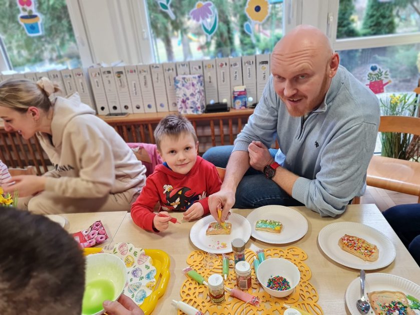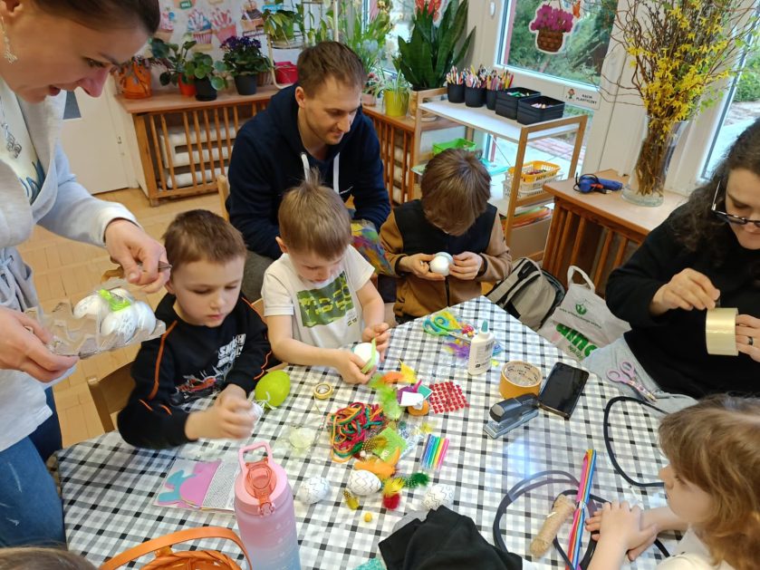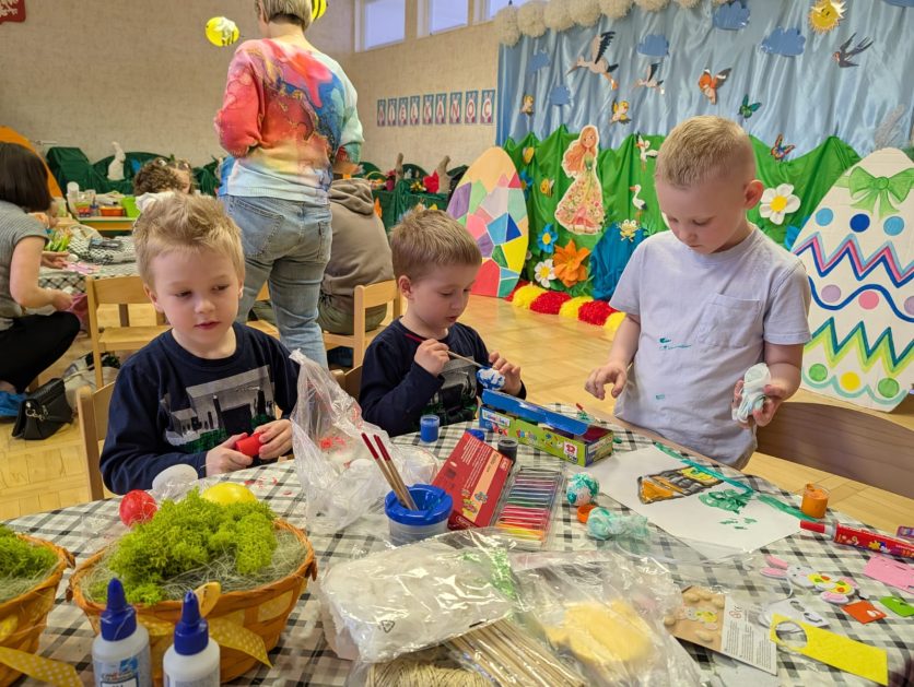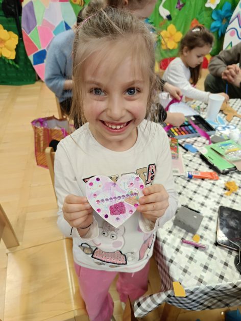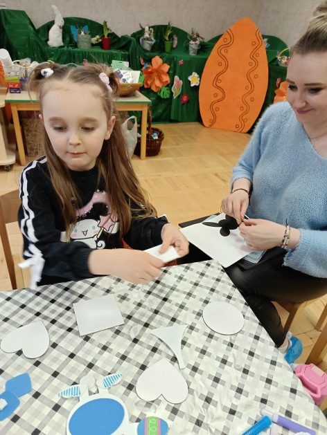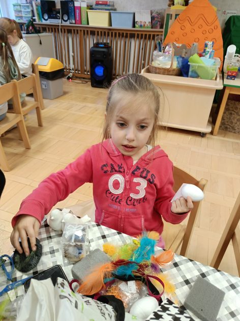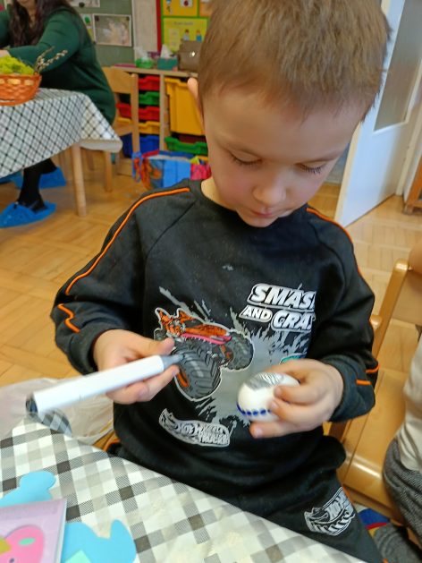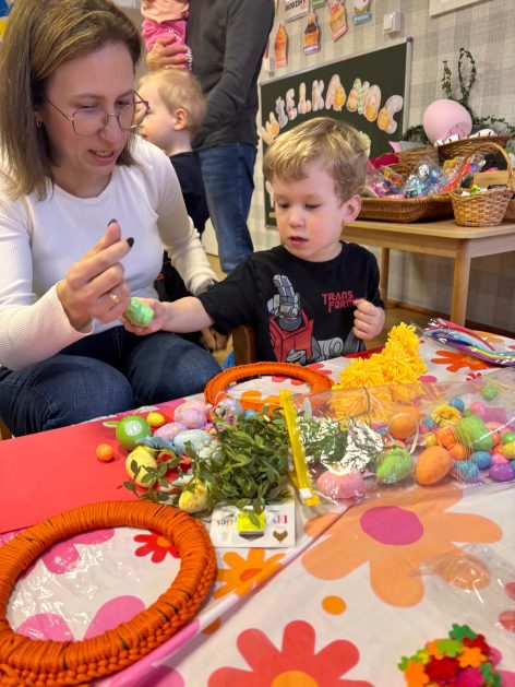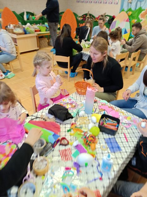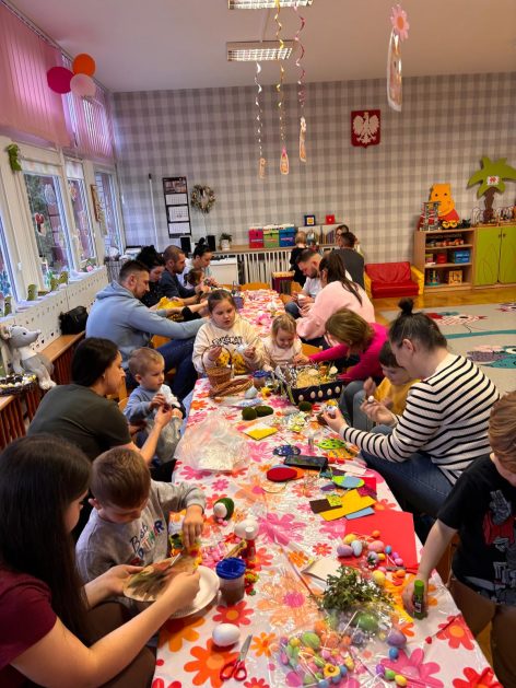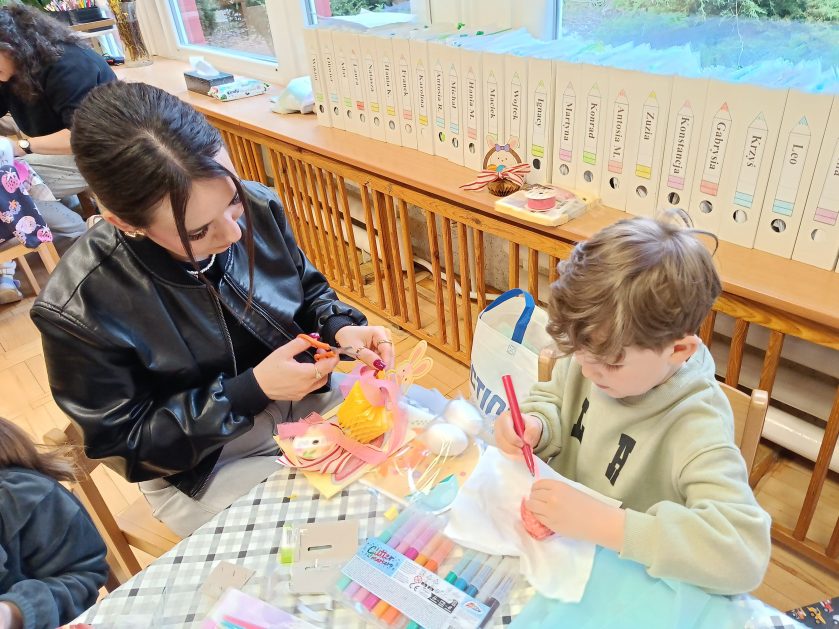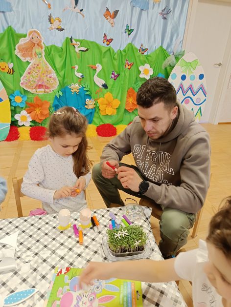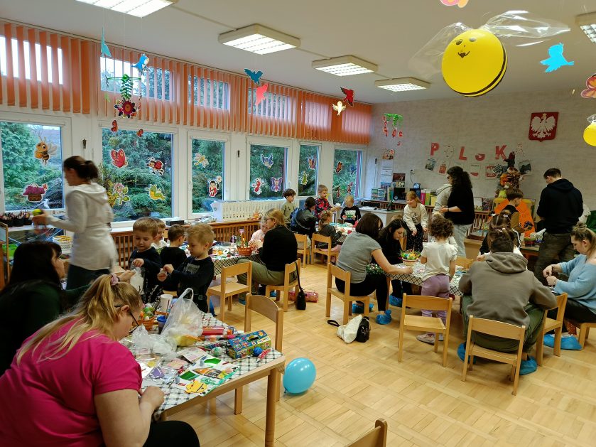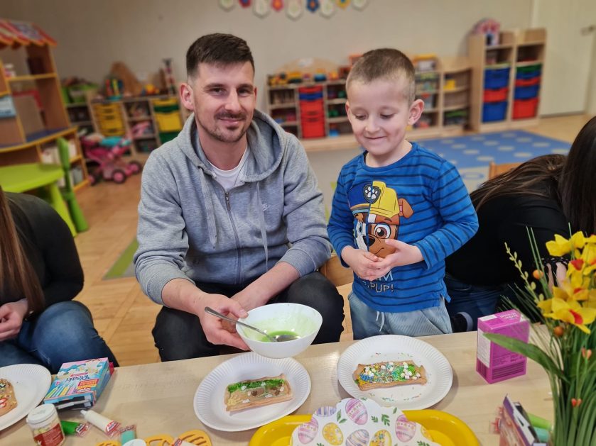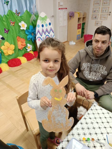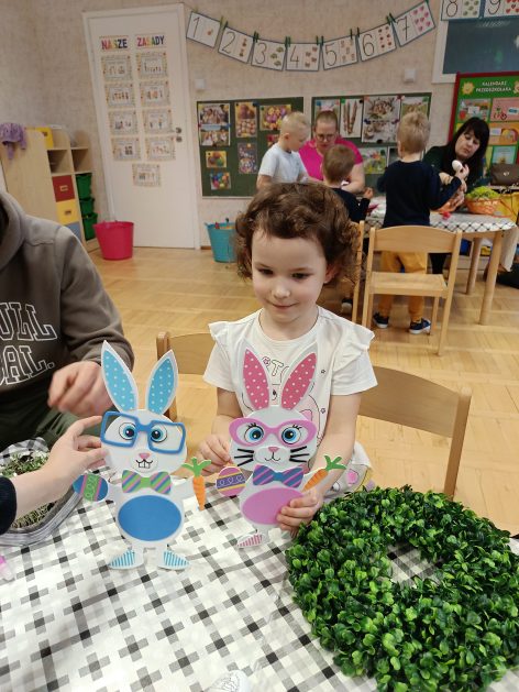 Tak niedawno witaliśmy Wiosnę, która przyniosła nam wyczekiwane ciepłe dni, pierwsze promienie słońca na pięknym, czystym niebie, tchnęła życie i obudziła całą przyrodę ….A tu już tuż, tuż zbliżają się wiosenne Święta Wielkanocne…Wraz ze Świętami w naszym przedszkolu rusza kiermasz świąteczny z którego dochód wspiera działalność szczecineckiego Hospicjum św. Franciszka z Asyżu. Przygotowując się do tego kiermaszu grupy 3, 4 i 5 latków zorganizowały warsztaty wielkanocne z rodzicami w przedszkolu, wszyscy zebrani z wielkim zaangażowaniem i kreatywnością wykonali różne ozdoby świąteczne. Spotkania takie są okazją do twórczej zabawy, ale przede wszystkim do wspólnego spędzenia czasu, zwolnienia codziennego tempa, są chwilą relaksu, rozmów i budowania więzi między dziećmi, rodzicami oraz nauczycielami.