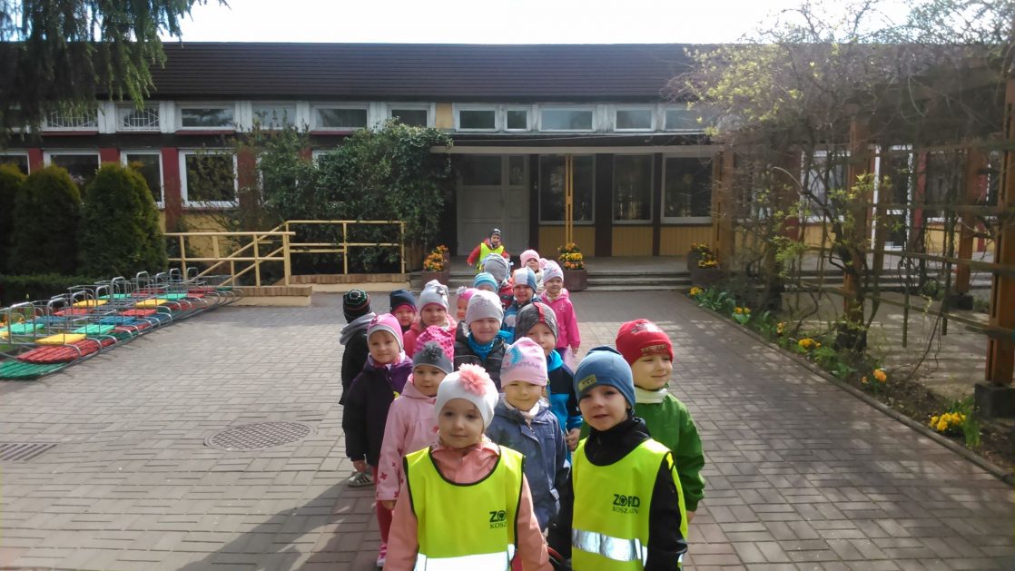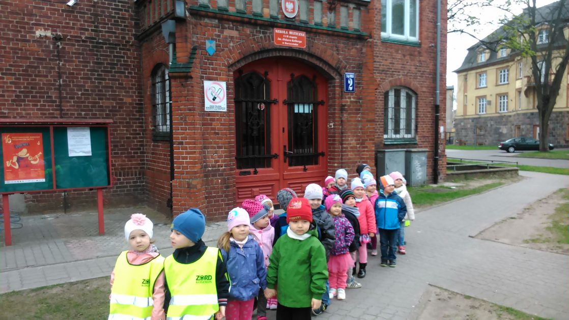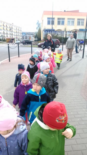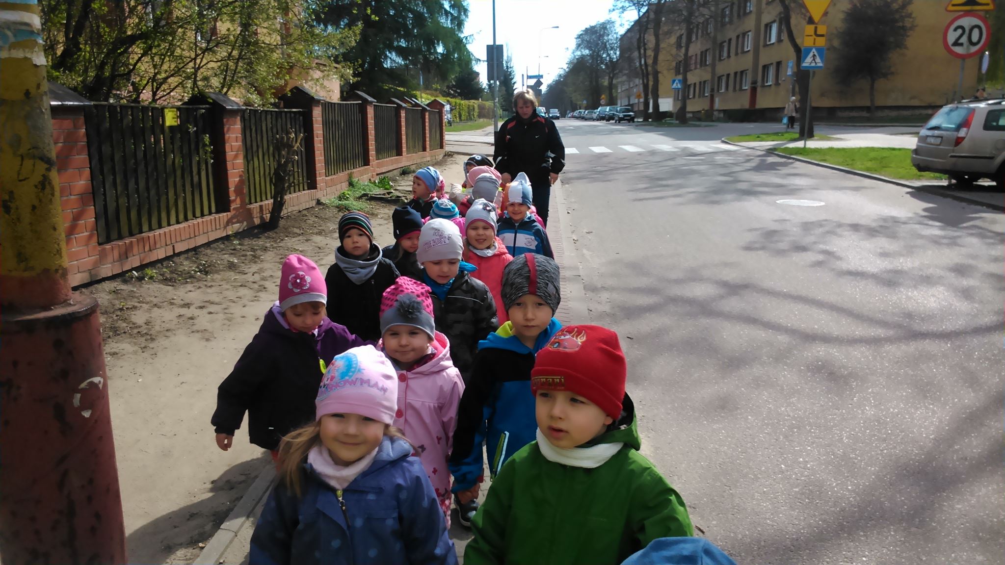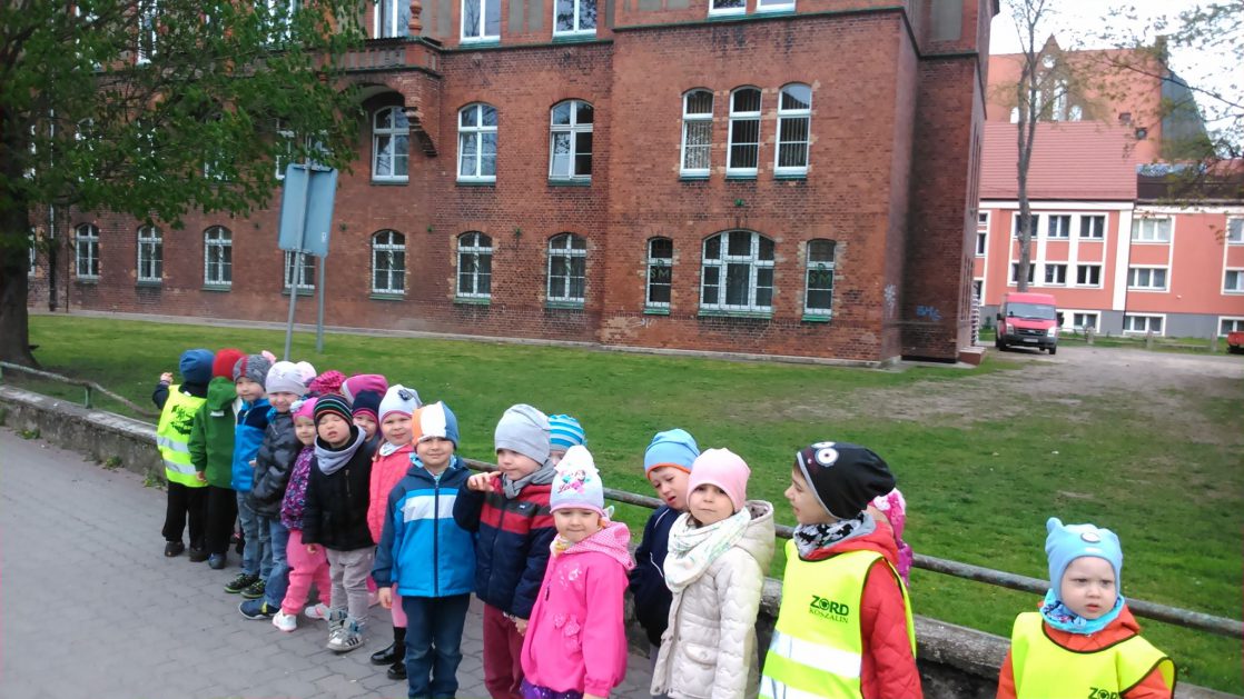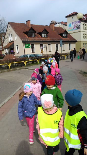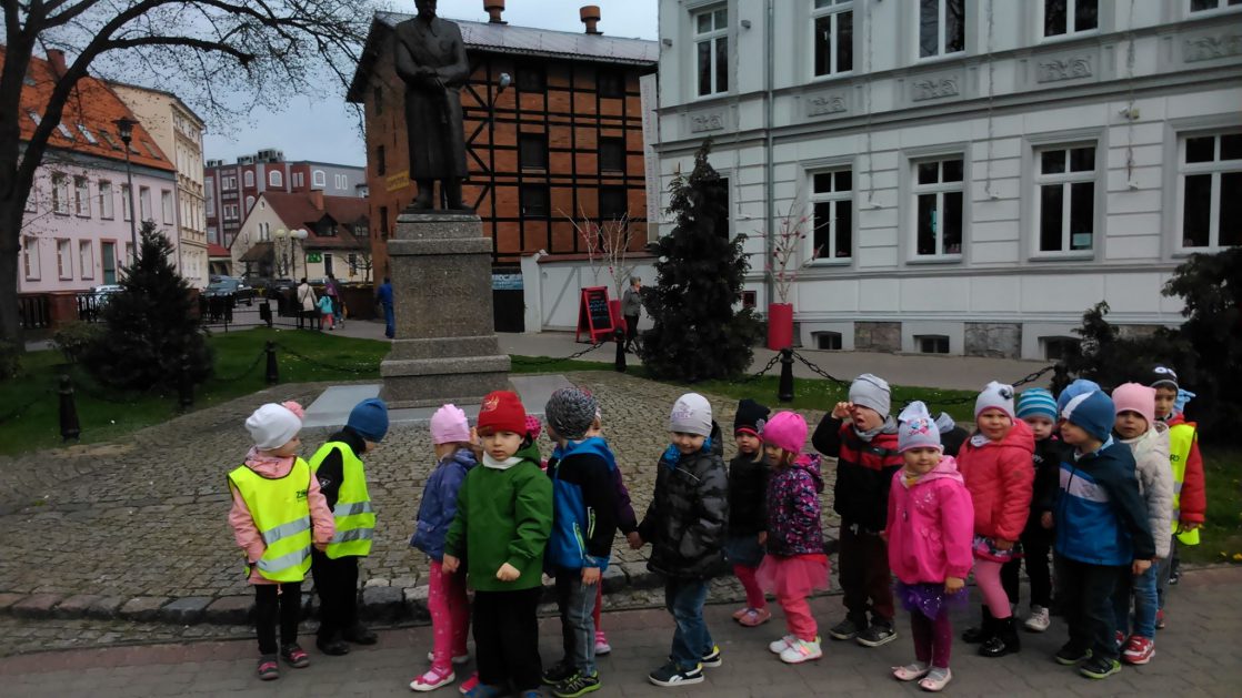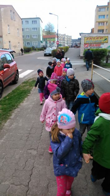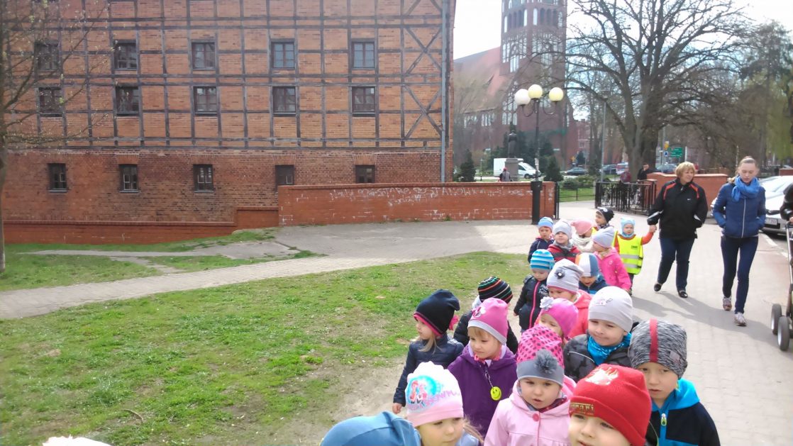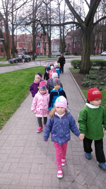 Wiosna już za oknem, więc trzylatki często wybierały się na spacery w najbliższej okolicy przedszkola, aby poznać swoje miasto. Podczas spacerów nie tylko utrwalały zasady bezpiecznego poruszania się w ruchu drogowym jako pieszy, ale również obserwowały różne budynki mijane po drodze w tym: Szkołę Muzyczną, pomnik Piłsudskiego, Ratusz, Zamek Książąt Pomorskich.