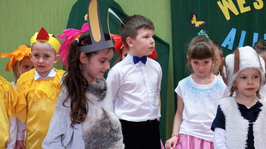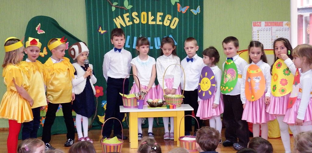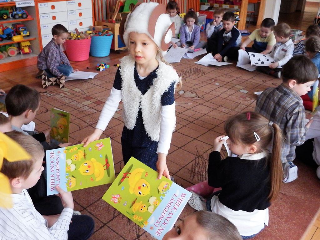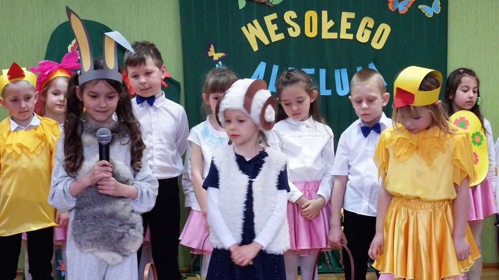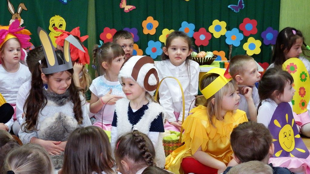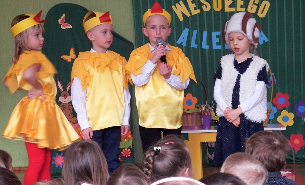 „Witajcie koledzy wspaniali w ten Wielkanocny czas, spotkaliśmy się tutaj jak w prawdziwej rodzinie…” tymi słowami rozpoczęło się dzisiaj 12 kwietnia , przedstawienie w wykonaniu grupy 5 latków pt. „Chory zajączek”. Przedstawienie było pełne radości, przybliżyło zgromadzonym gościom zwyczaje i tradycje wielkanocne jak również stanowiło przesłanie dla wszystkich, mówiące o tym jak ważne jest niesienie pomocy innym w potrzebie. Na zakończenie Pani dyrektor złożyła wszystkim świąteczne życzenia, po czym dzieci zostały obdarowane niespodziankami od zająca.