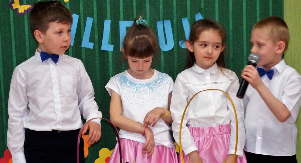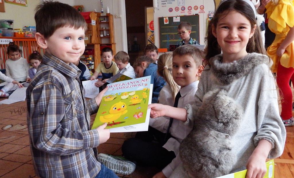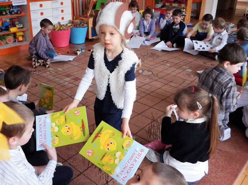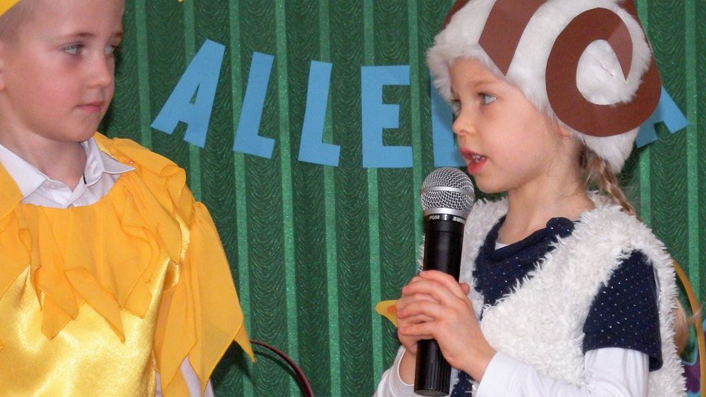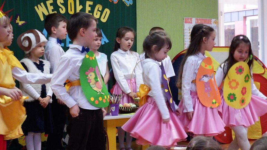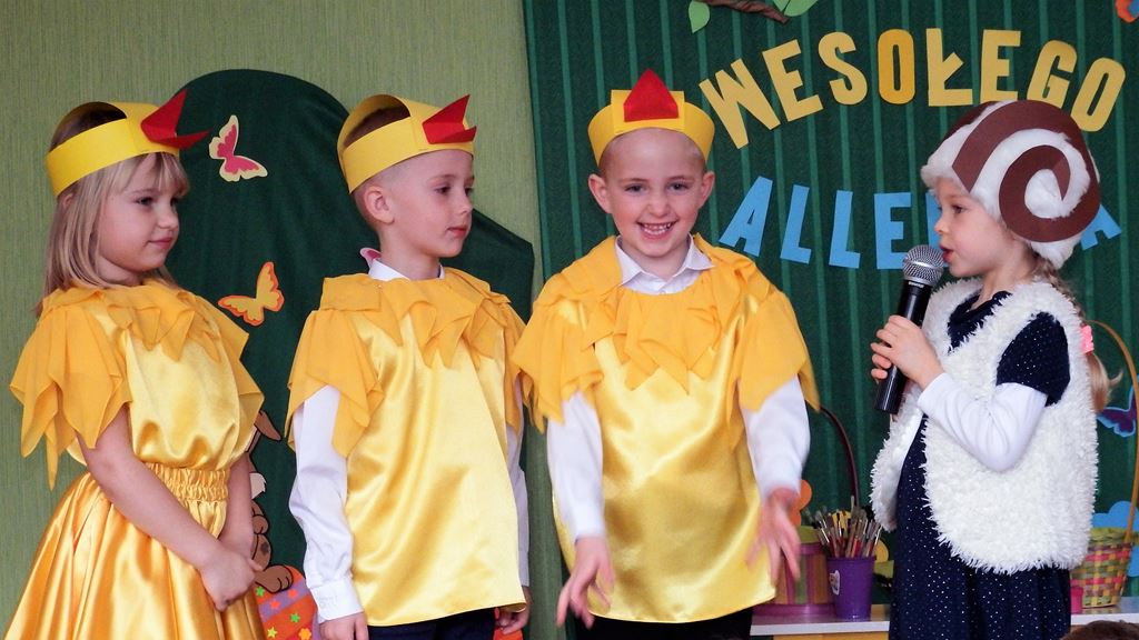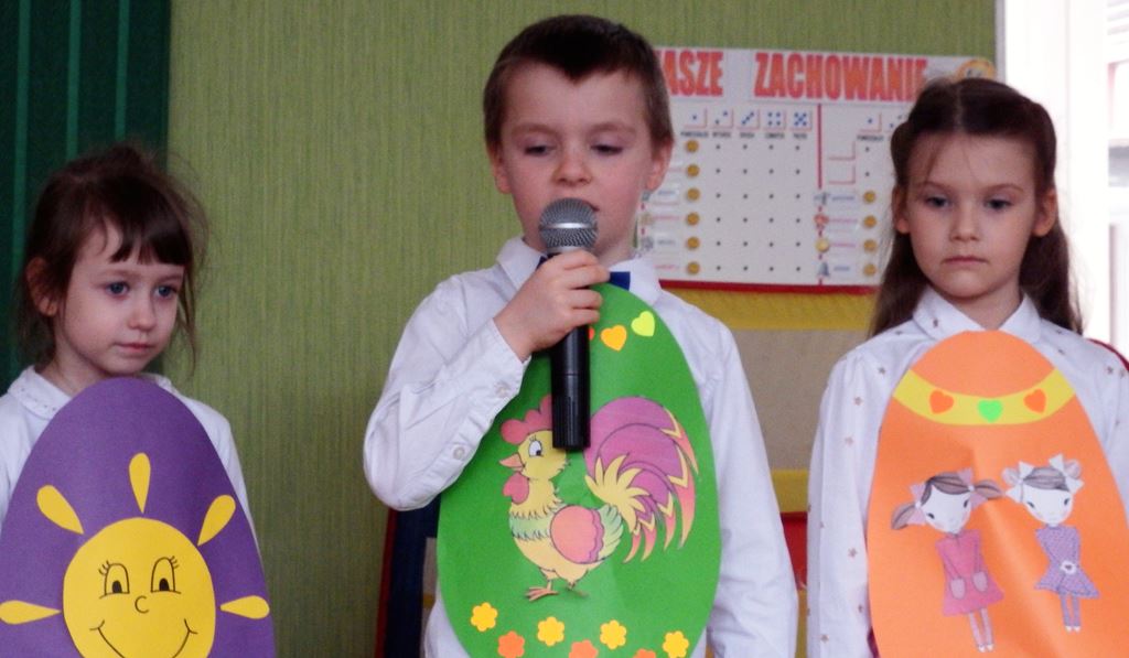„Witajcie koledzy wspaniali w ten Wielkanocny czas, spotkaliśmy się tutaj jak w prawdziwej rodzinie…” tymi słowami rozpoczęło się dzisiaj 12 kwietnia , przedstawienie w wykonaniu grupy 5 latków pt. „Chory zajączek”. Przedstawienie było pełne radości, przybliżyło zgromadzonym gościom zwyczaje i tradycje wielkanocne jak również stanowiło przesłanie dla wszystkich, mówiące o tym jak ważne jest niesienie pomocy innym w potrzebie. Na zakończenie Pani dyrektor złożyła wszystkim świąteczne życzenia, po czym dzieci zostały obdarowane niespodziankami od zająca.