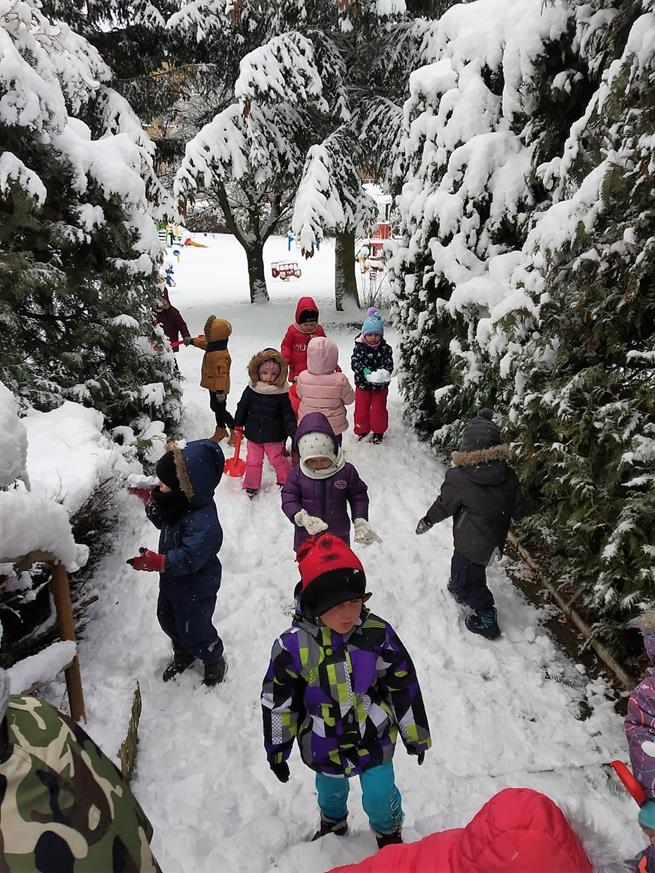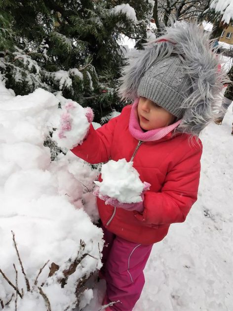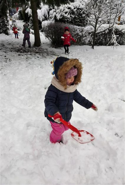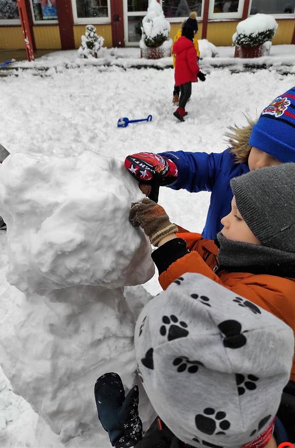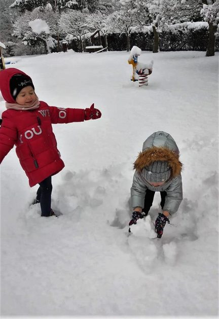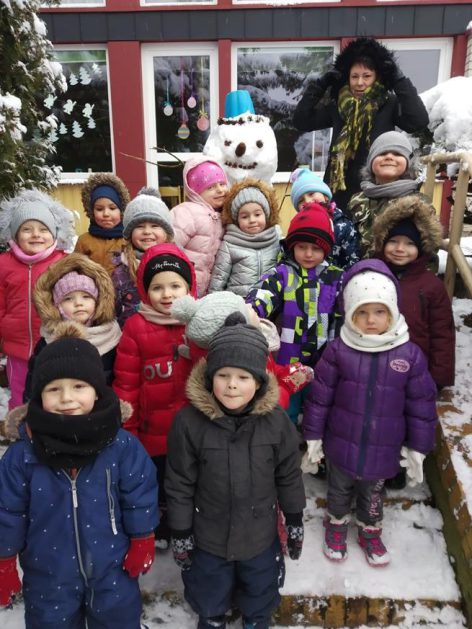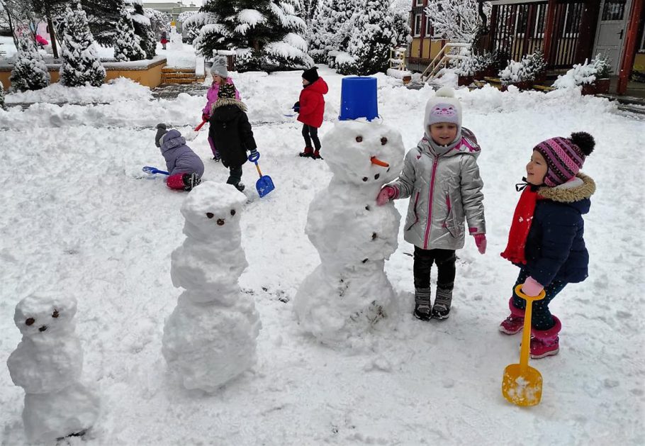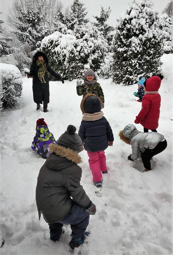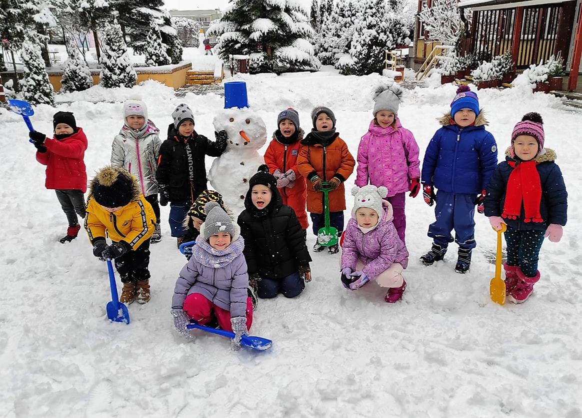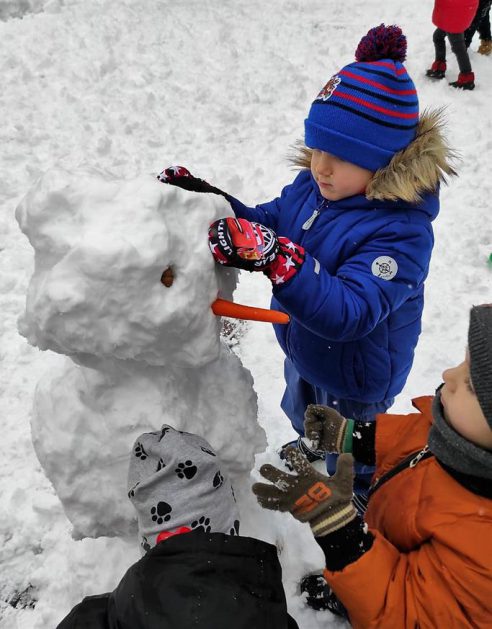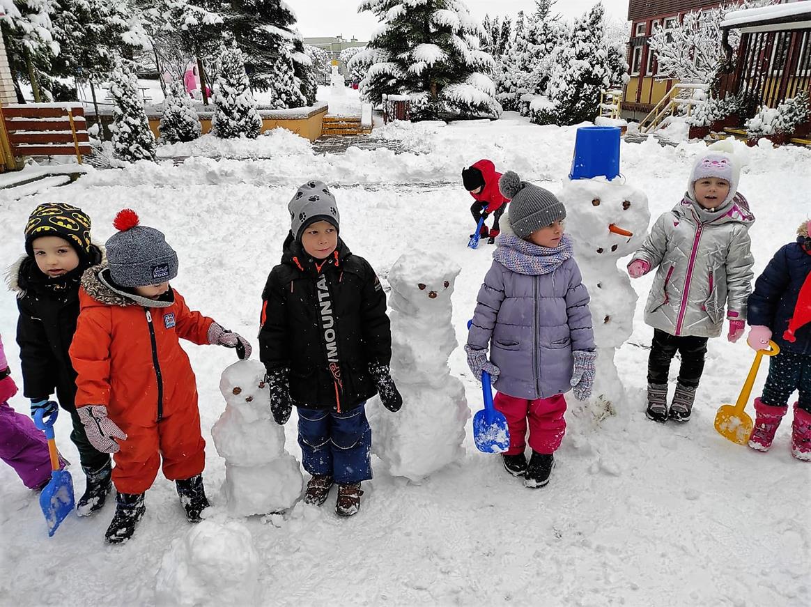 Kiedy ogród przedszkolny przykrył śnieżny puch, maluszki i 4 latki „H” były gotowe i ochoczo zabrały się do lepienia bałwanka. Jeden to za mało, całą rodzinkę by się chciało. No i jest… mama, tata, dzieci a gdzieś w innym zakątku naszego ogrodu jest ciocia i wujek…