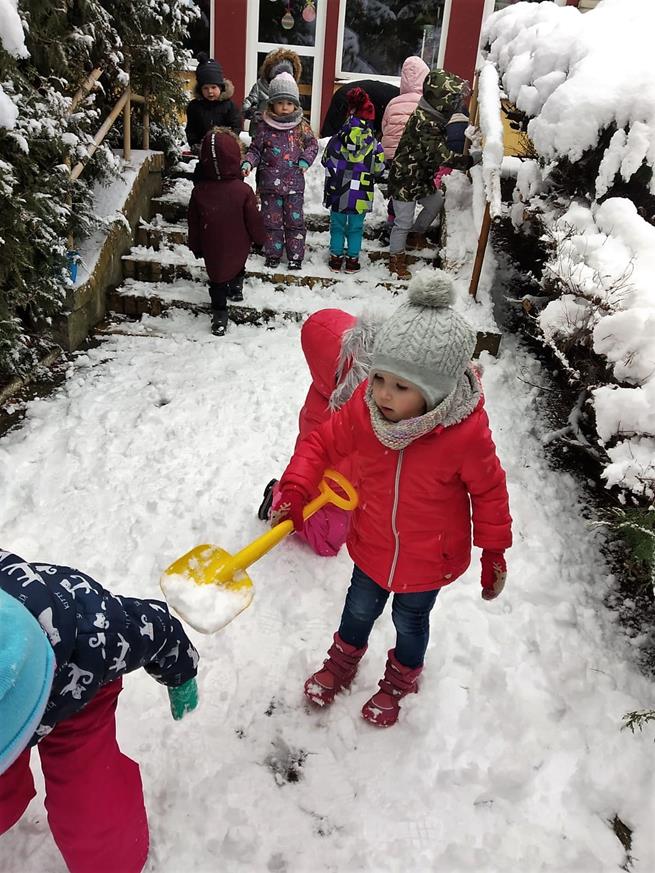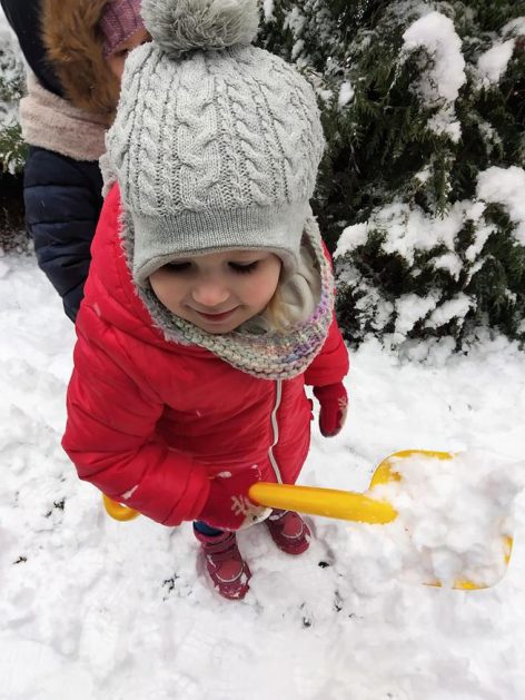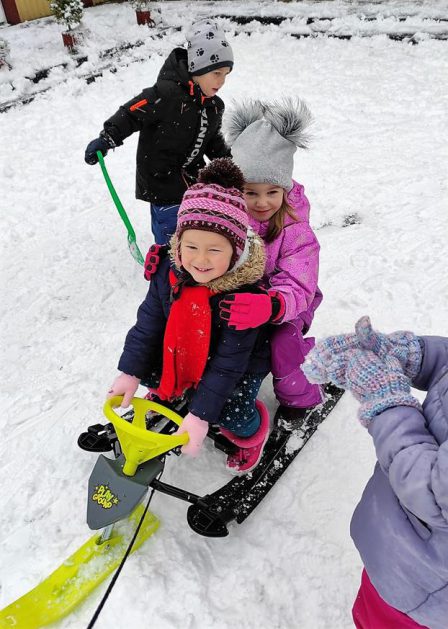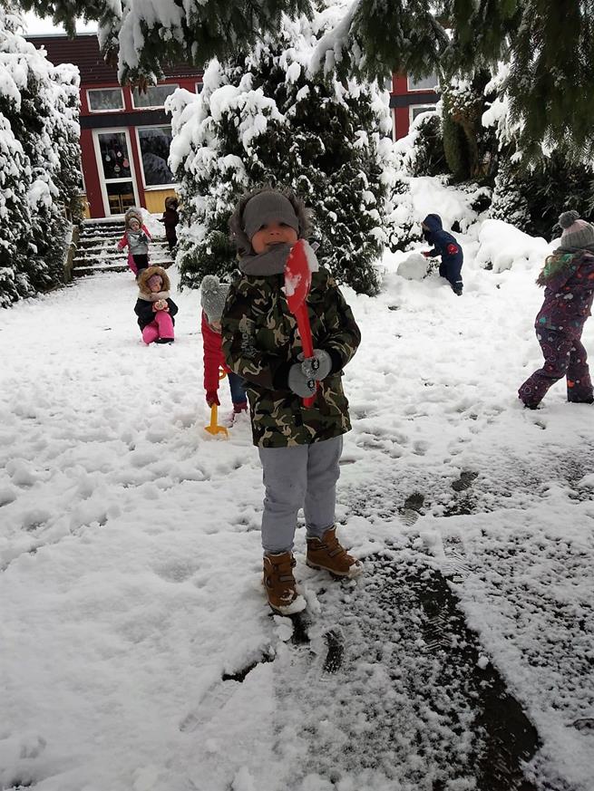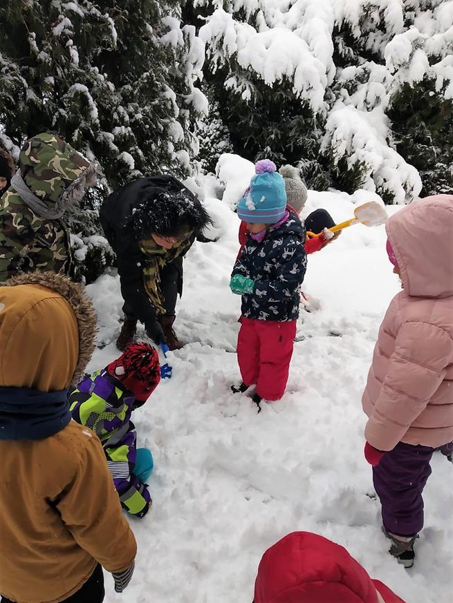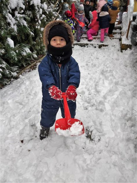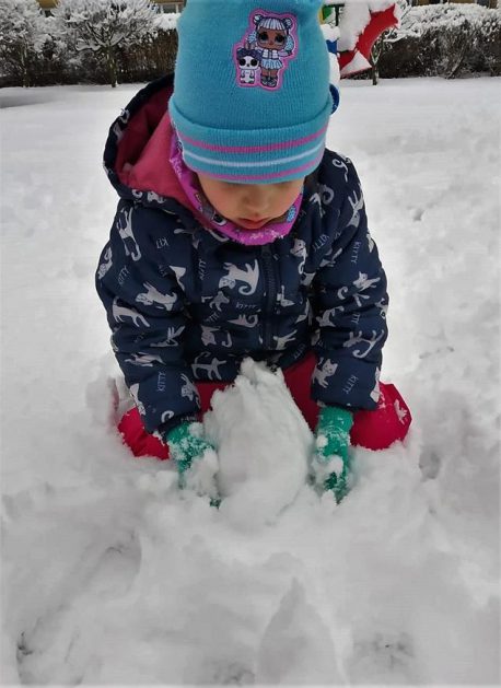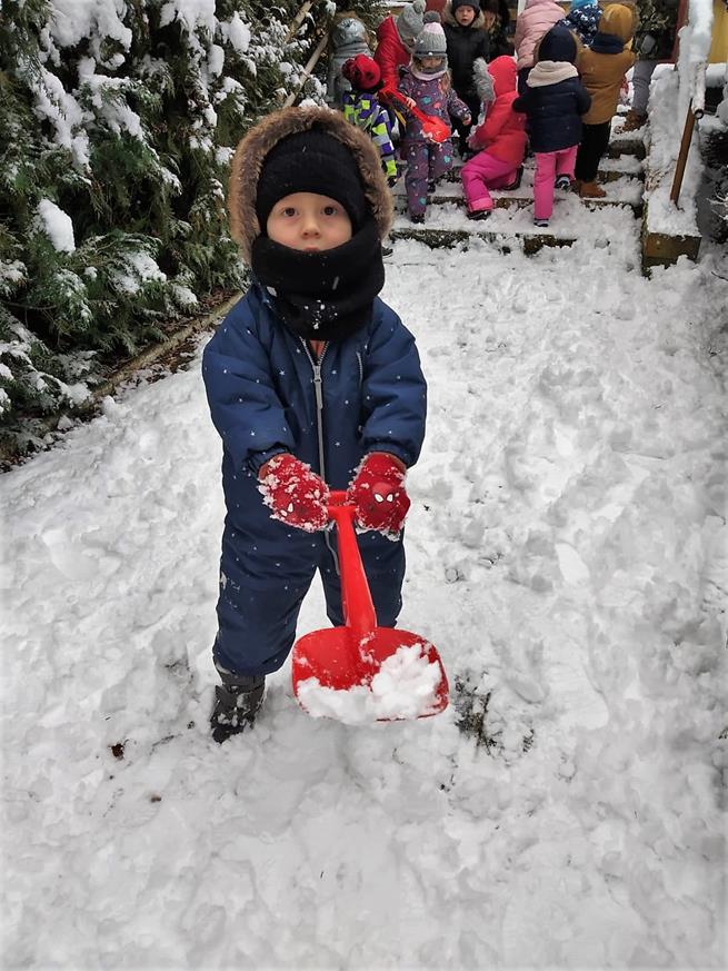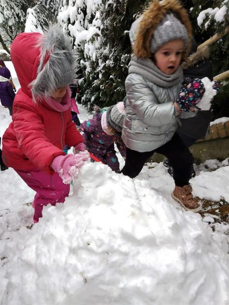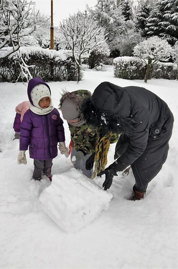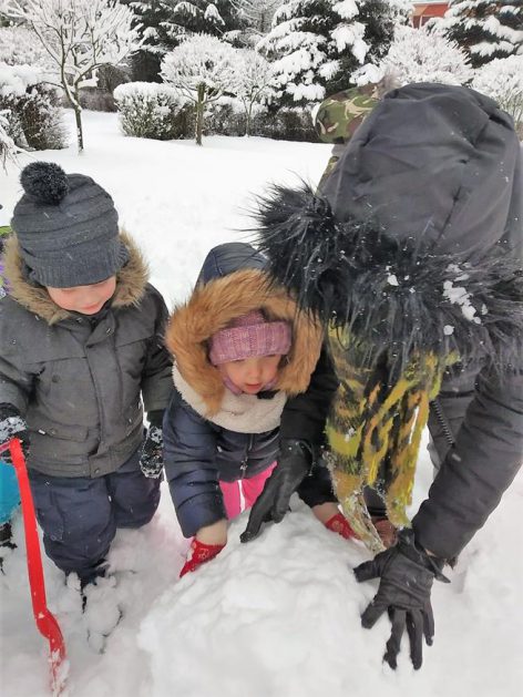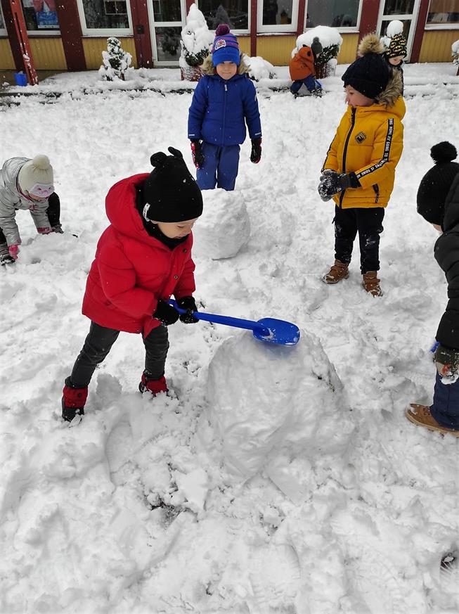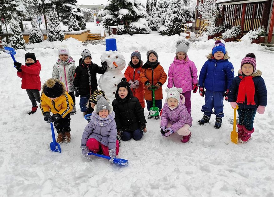 Kiedy ogród przedszkolny przykrył śnieżny puch, maluszki i 4 latki „H” były gotowe i ochoczo zabrały się do lepienia bałwanka. Jeden to za mało, całą rodzinkę by się chciało. No i jest… mama, tata, dzieci a gdzieś w innym zakątku naszego ogrodu jest ciocia i wujek…