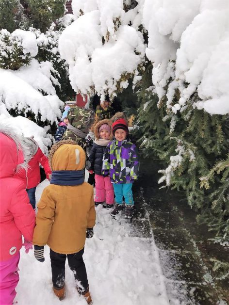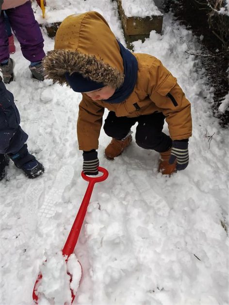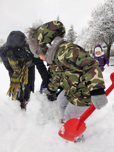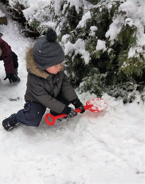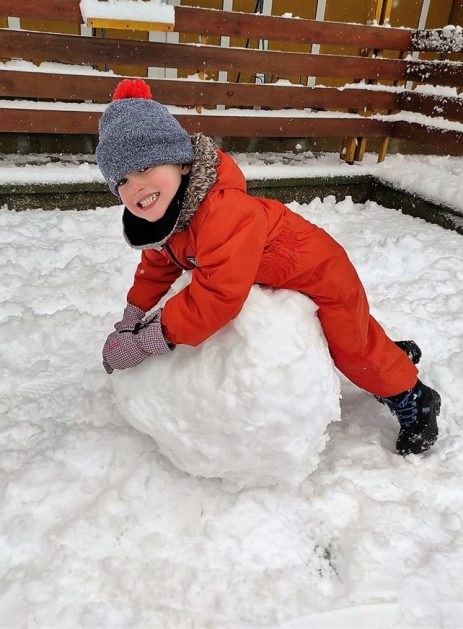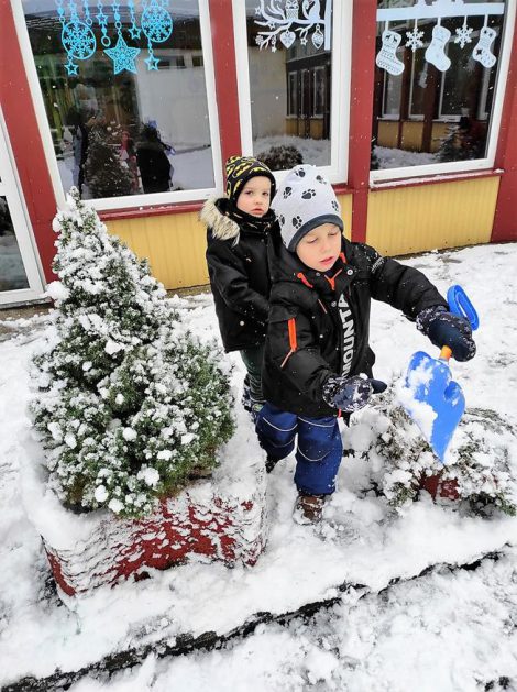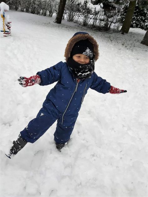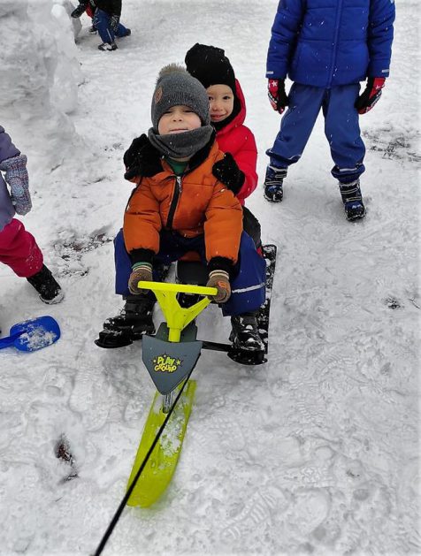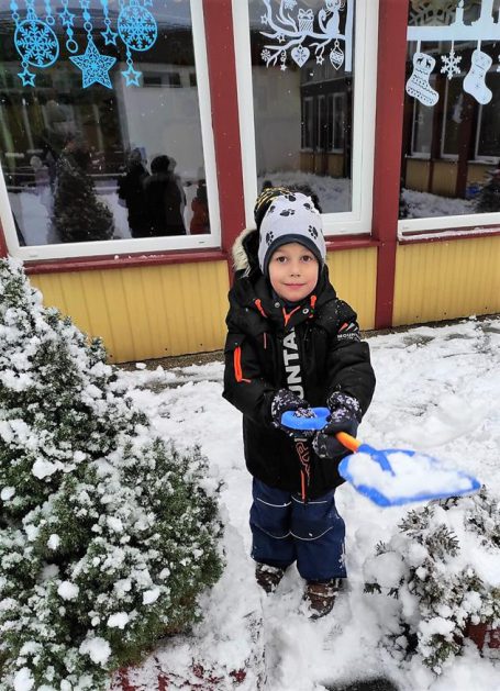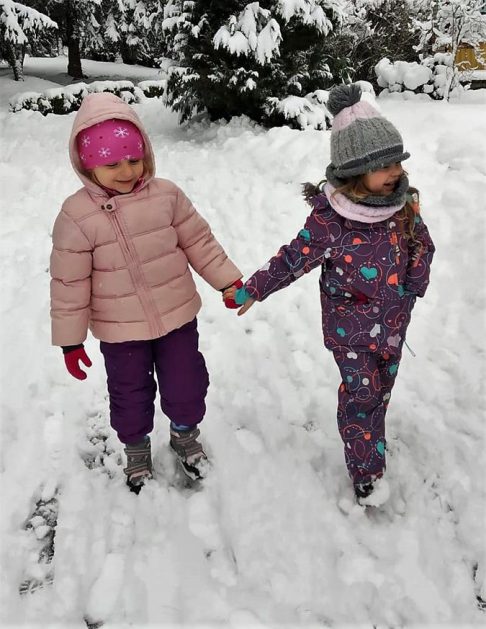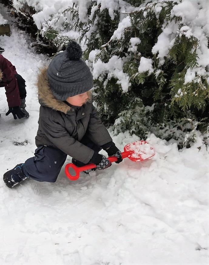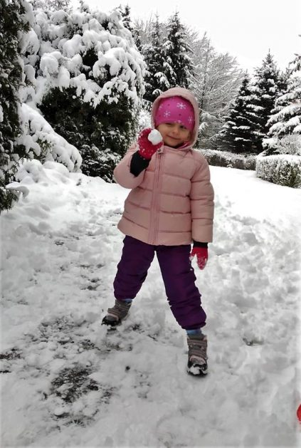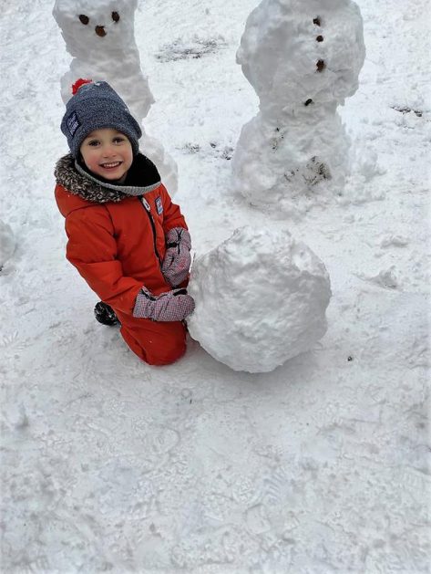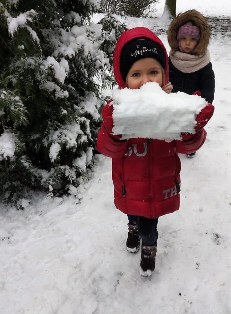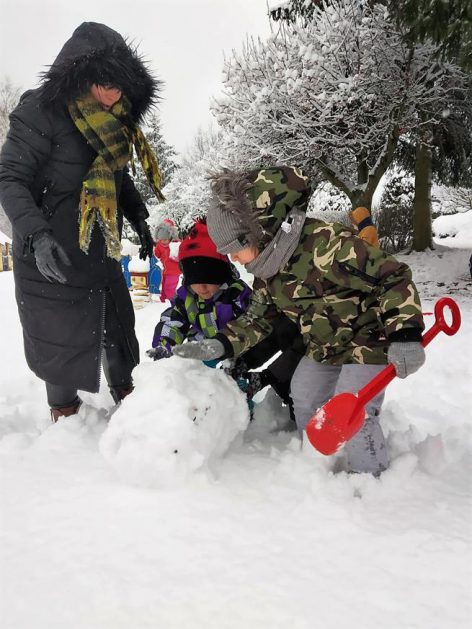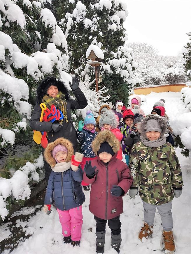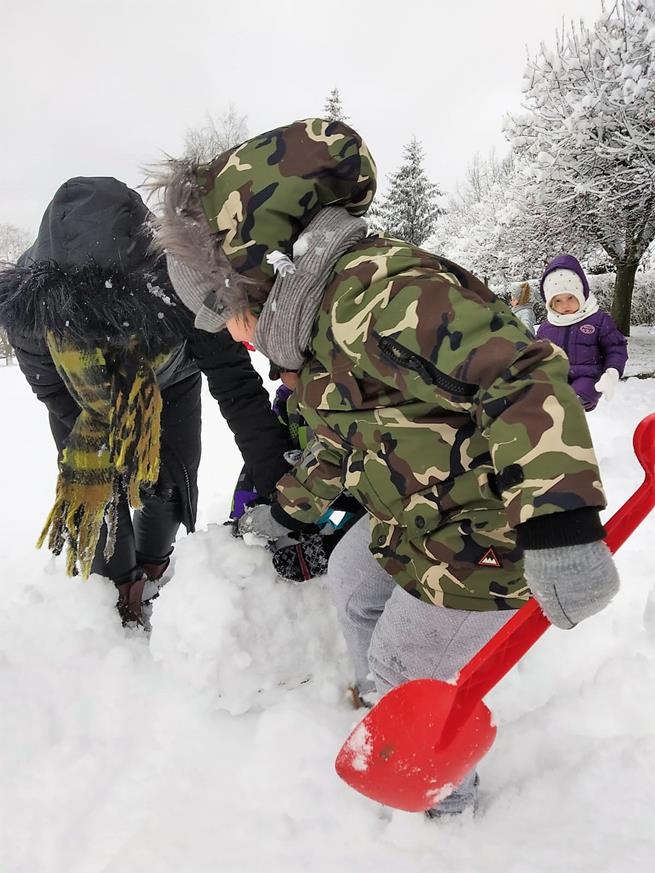 Kiedy ogród przedszkolny przykrył śnieżny puch, maluszki i 4 latki „H” były gotowe i ochoczo zabrały się do lepienia bałwanka. Jeden to za mało, całą rodzinkę by się chciało. No i jest… mama, tata, dzieci a gdzieś w innym zakątku naszego ogrodu jest ciocia i wujek…