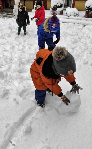 Śnieg lepił się wyśmienicie, dlatego radość i uśmiech na twarzach dzieci był znakiem, że przedszkolakom podobają się zimowe zabawy.