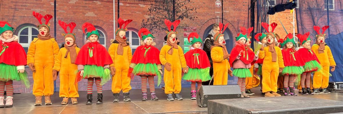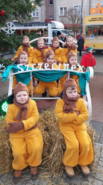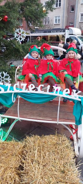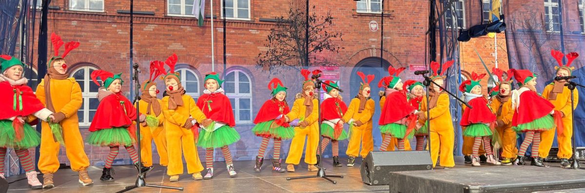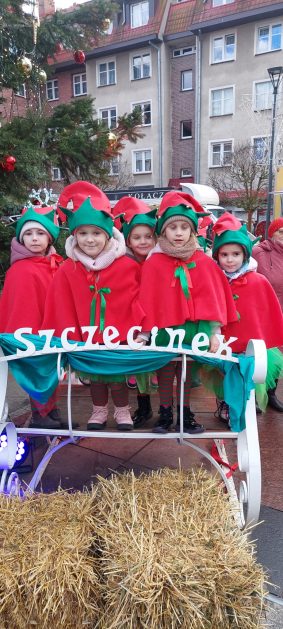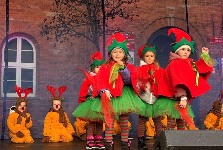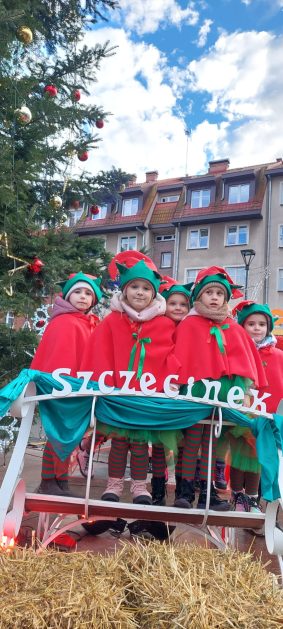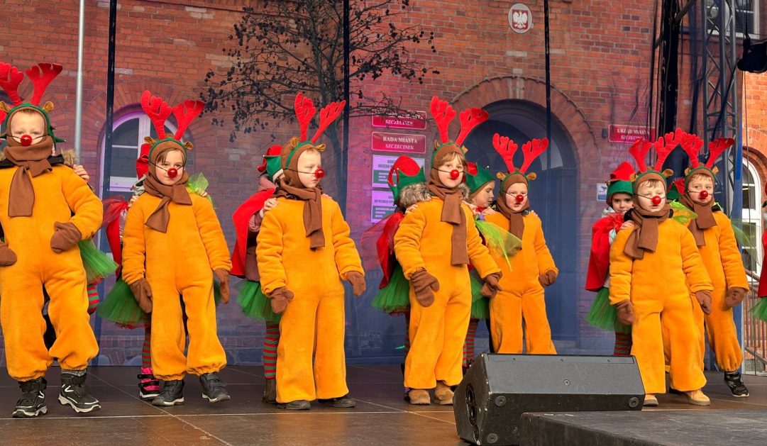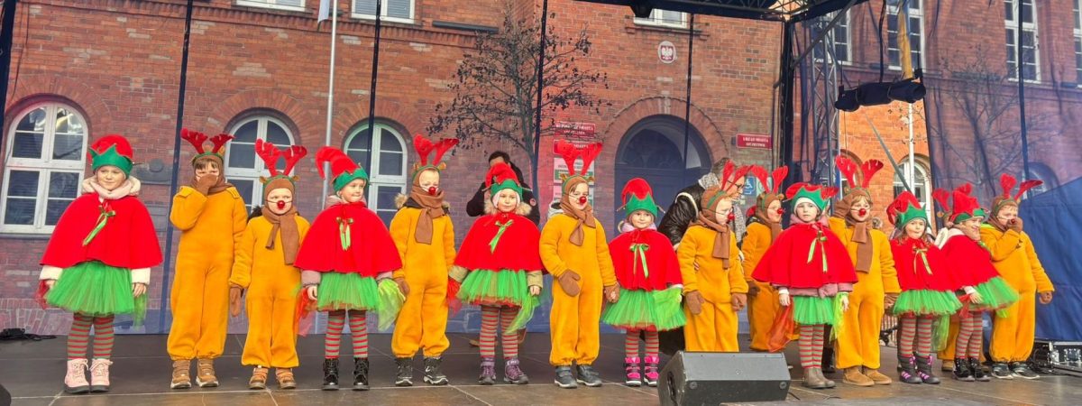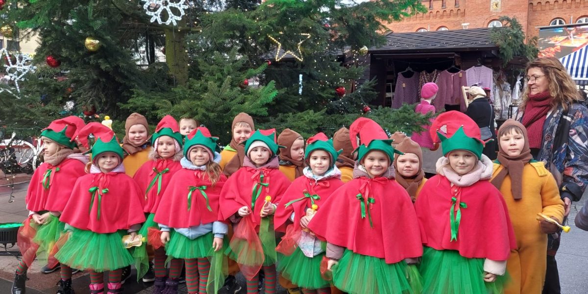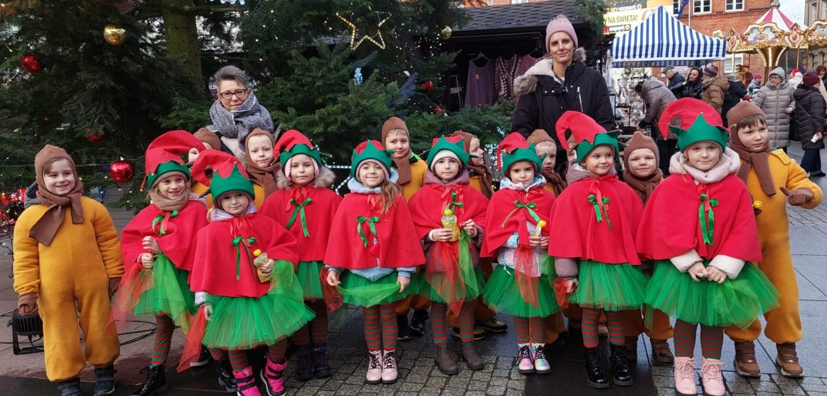 19 grudnia, w piątkowy poranek w centrum Szczecinka rozpoczął się kolejny Jarmark Świąteczny, który wprowadził wszystkich mieszkańców naszego miasta w magiczną atmosferę. To okazja do oderwania się od codzienności i poczucia prawdziwego świątecznego klimatu, to nie tylko zakupy ale przede wszystkim emocje te pozytywne, relacje, bliskość drugiego człowieka, gesty, uśmiechy. Nasze 6 latki właśnie takimi uśmiechami obdarowały szczecineckich mieszkańców, podczas występów w strojach Reniferów i Elfinek zatrzymały na chwilę pędzących przechodniów a zebrana publiczność nagrodziła występy dzieci gromkimi brawami.