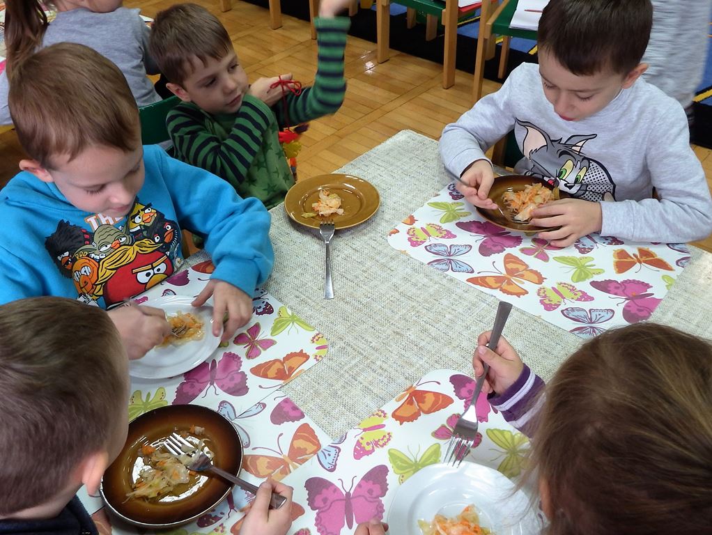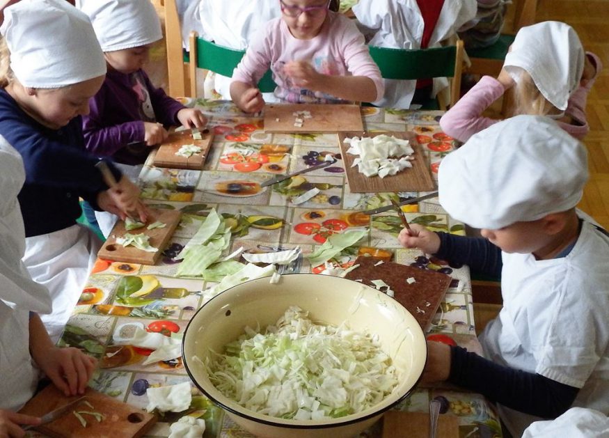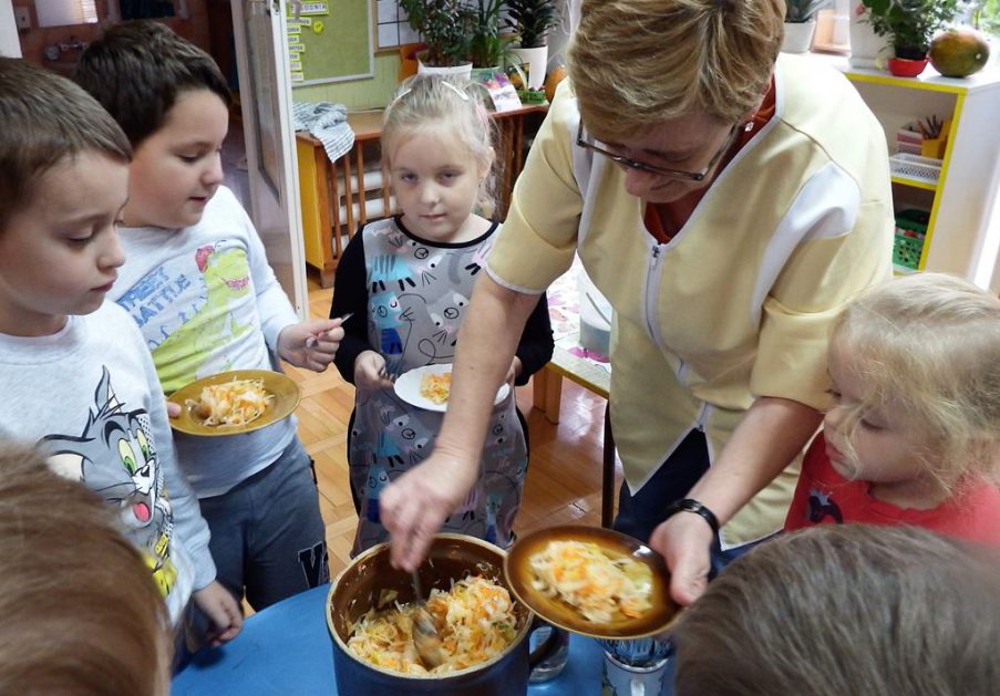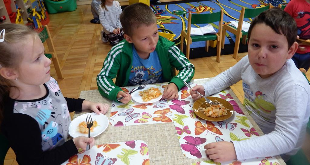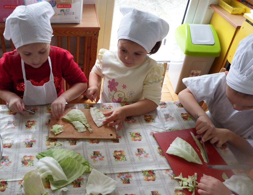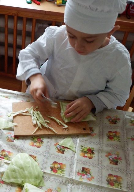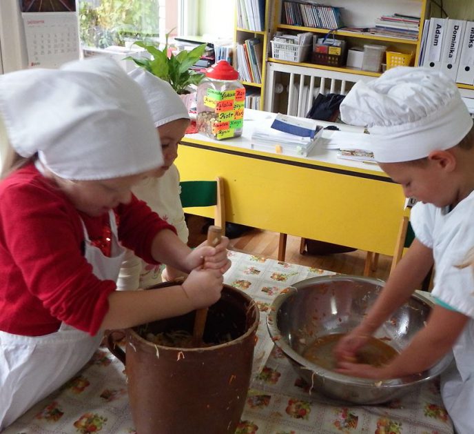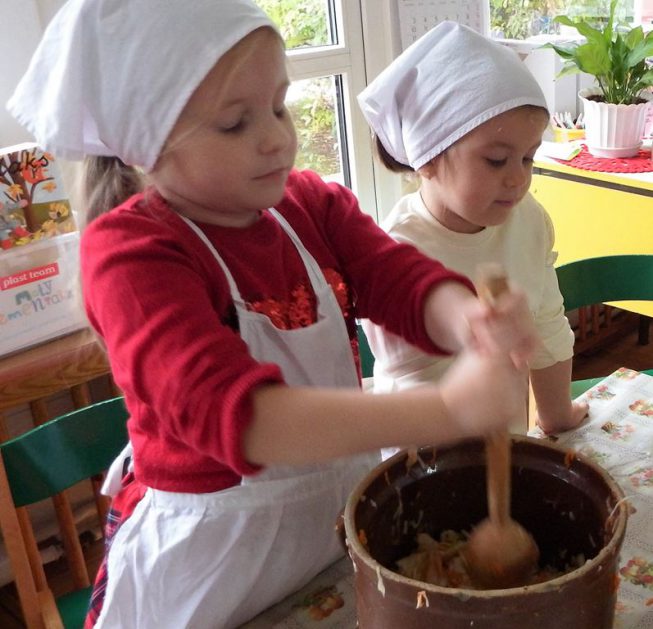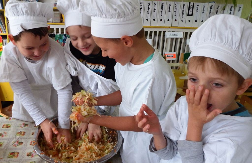 5-6 latki Pani Uli też rach, ciach kapustę szatkowały, bo jak to robić się dowiedziały. Poznały tradycje ludową – związaną z procesem przygotowania i kiszenia kapusty. Z zachowaniem bezpieczeństwa kroiły kapustę, obierały i tarkowały marchewkę, dodawały sól, ubijały wałkiem w glinianym garnku. Poprzez bezpośrednie doświadczanie, dzieci pogłębiają wiedzę o konieczności spożywania , warzyw i ich przetworów niezbędnych dla zdrowia.