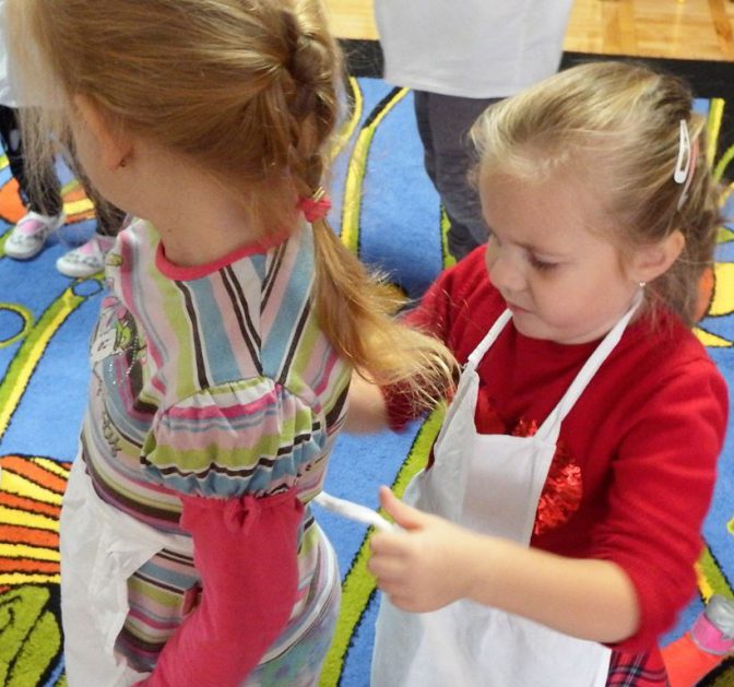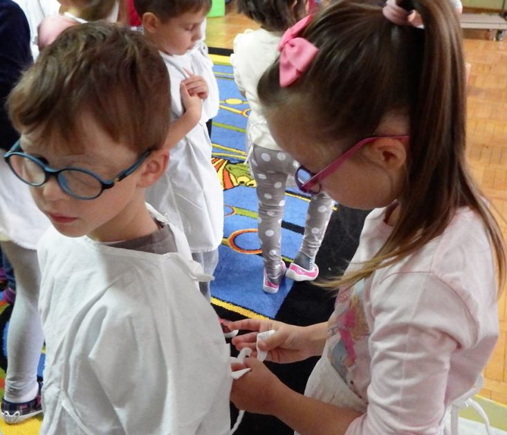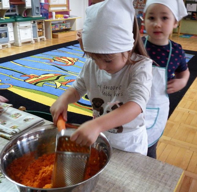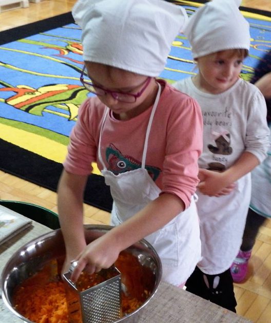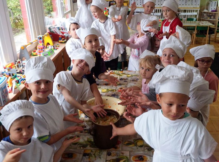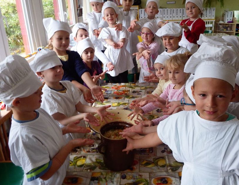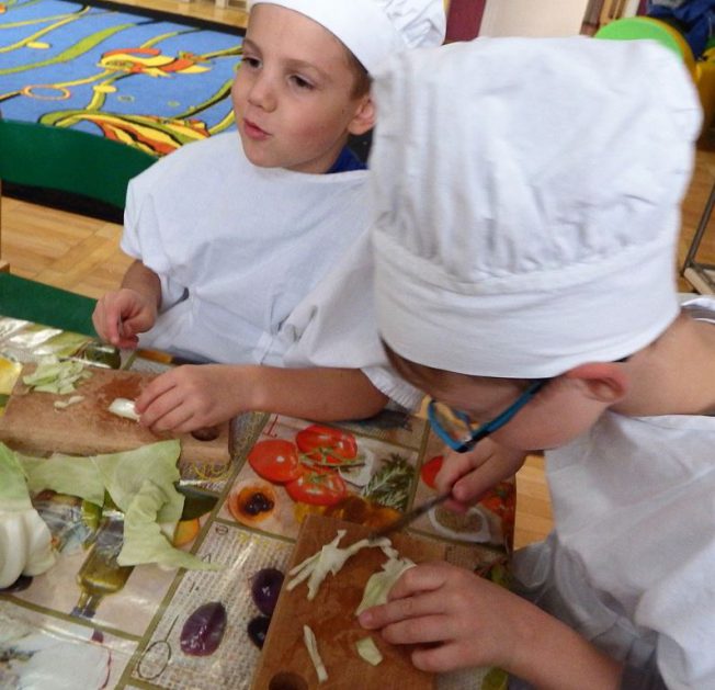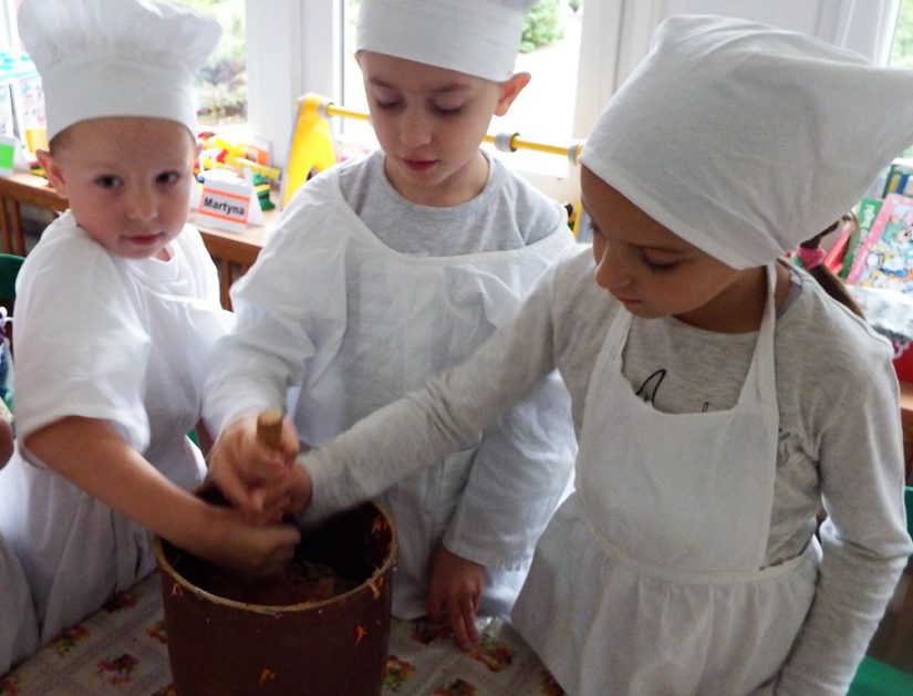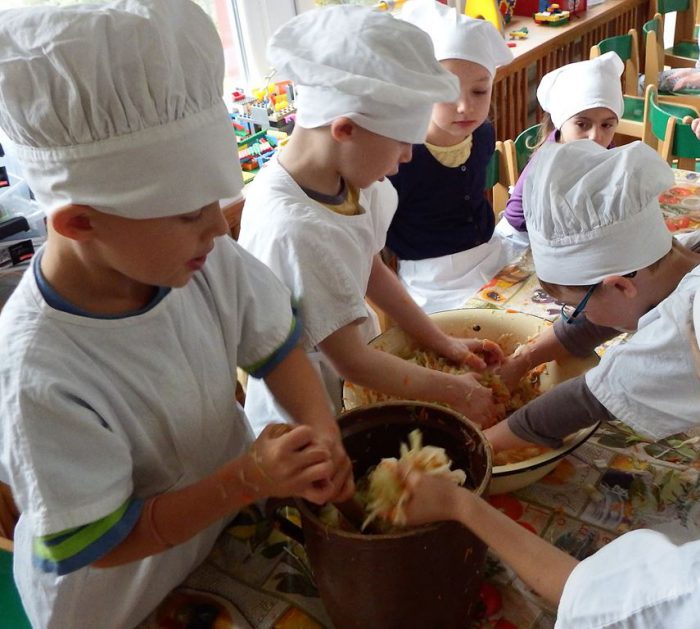 5-6 latki Pani Uli też rach, ciach kapustę szatkowały, bo jak to robić się dowiedziały. Poznały tradycje ludową – związaną z procesem przygotowania i kiszenia kapusty. Z zachowaniem bezpieczeństwa kroiły kapustę, obierały i tarkowały marchewkę, dodawały sól, ubijały wałkiem w glinianym garnku. Poprzez bezpośrednie doświadczanie, dzieci pogłębiają wiedzę o konieczności spożywania , warzyw i ich przetworów niezbędnych dla zdrowia.