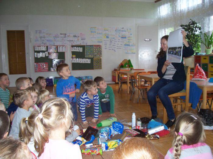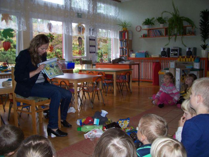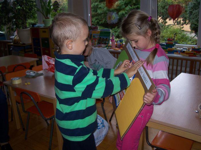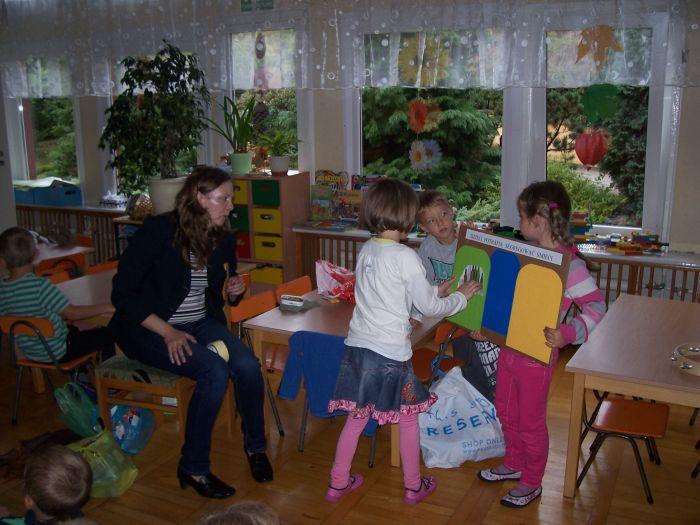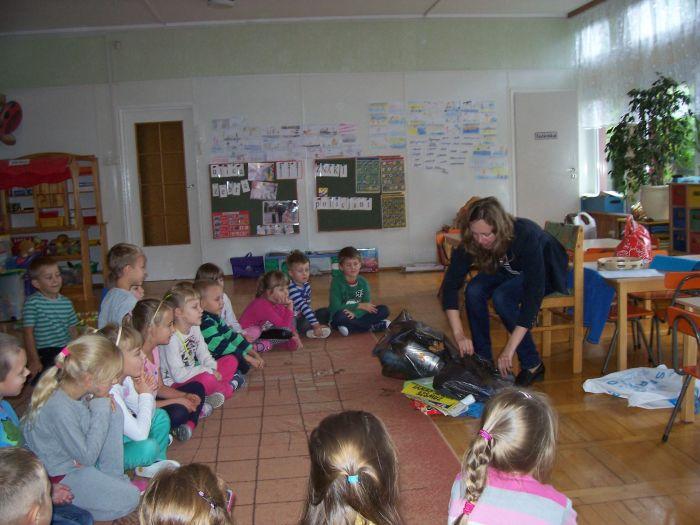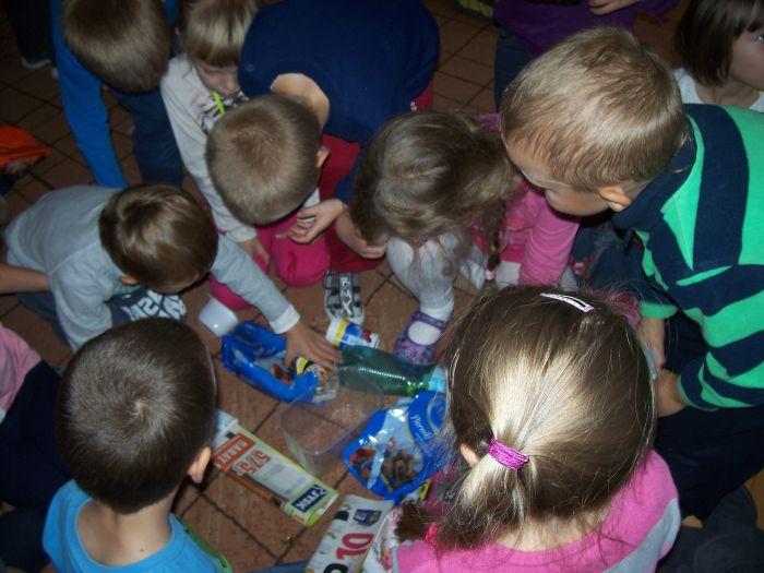 6 latki spotkały się z mamą Adasia, która na co dzień zajmuje się zagadnieniem ochrony środowiska. Przybliżyła dzieciom na czym polega segregacja śmieci, opowiedziała o kolorowych pojemnikach i wyjaśniła pojęcie recyklingu. Dzieci włączyły się do segregacji zgromadzonych różnorodnych opakowań.