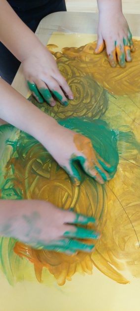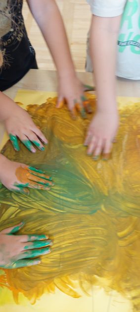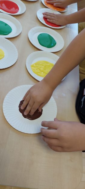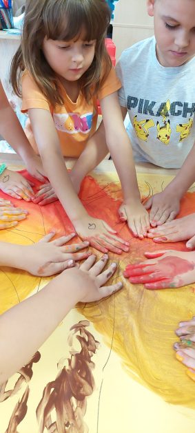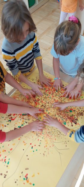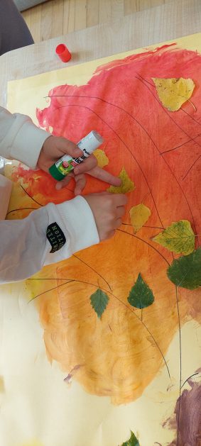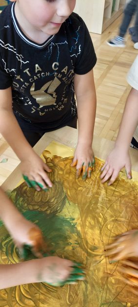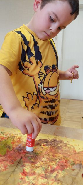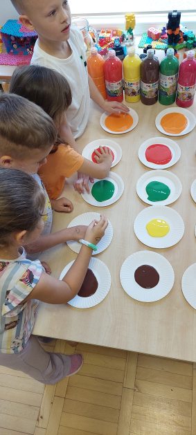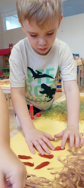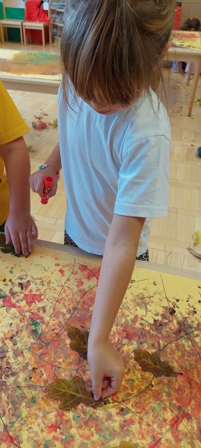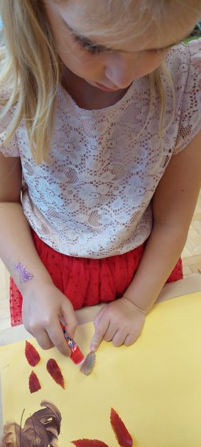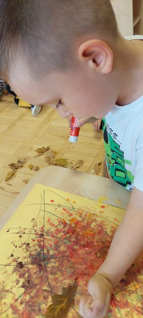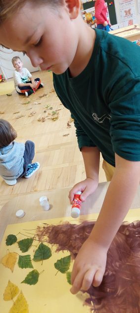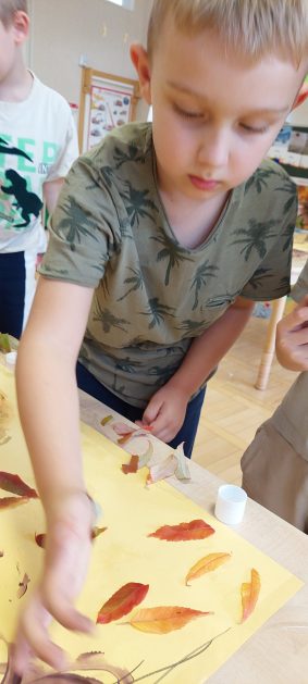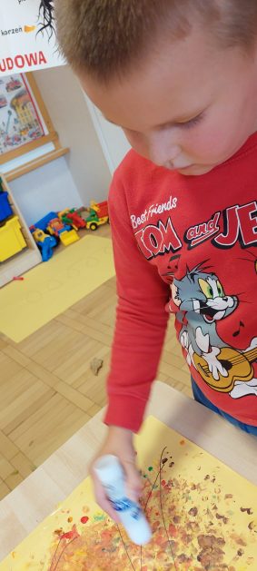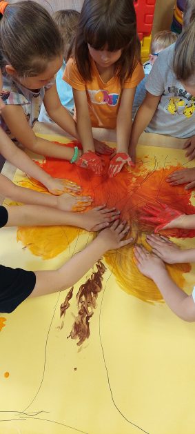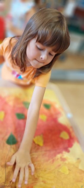 2 października w grupie 6 latków A odbyły się zajęcia metodą D. Dziamskiej „Edukacja przez Ruch”.  Celem tej metody jest wykorzystywanie naturalnego, spontanicznego ruchu organizmu w procesie jego rozwoju. Ćwiczeniom towarzyszyła muzyka, która nadawała tempo i rytm, a ruchy naprzemienne usprawniały pracę obu półkul mózgowych. Podczas malowania, wykorzystane były również elementy Terapii Ręki mające na celu rozwój prawidłowych funkcji kończyn górnych, dłoni i palców, skoncentrowanych na precyzyjnych ruchach, koordynacji wzrokowo-ruchowej oraz sile mięśniowej. Tematem naszej pracy plastycznej była „Jesień w parku”. Przed rozpoczęciem zajęć dzieci wybrały się do naszego ogrodu, w poszukiwaniu różnych gatunków drzew liściastych i zebraniu liści o różnych kształtach. Przy okazji obserwowały różnorodność jesiennej flory: krzewów, kwiatów mieniących się pięknymi kolorami.