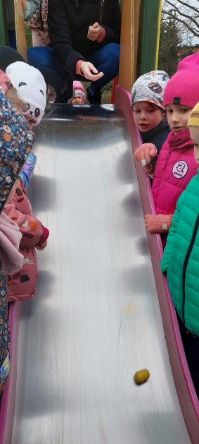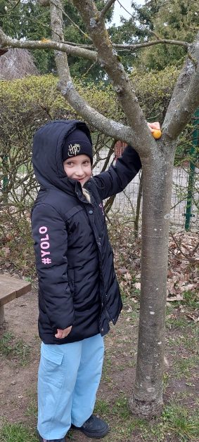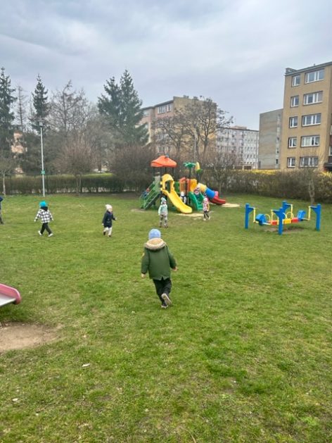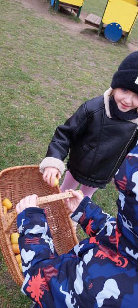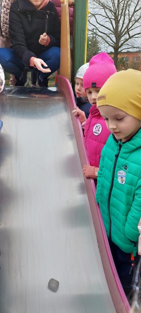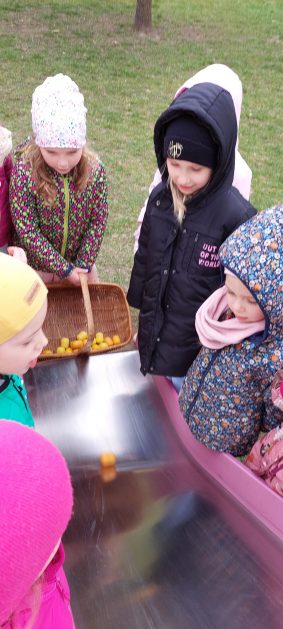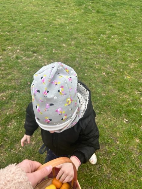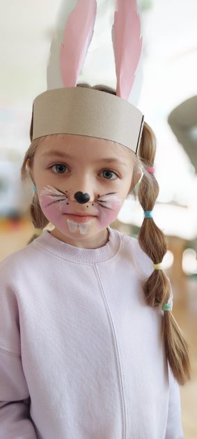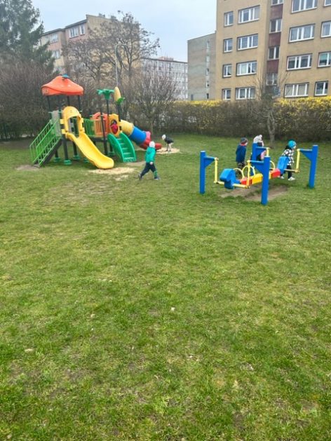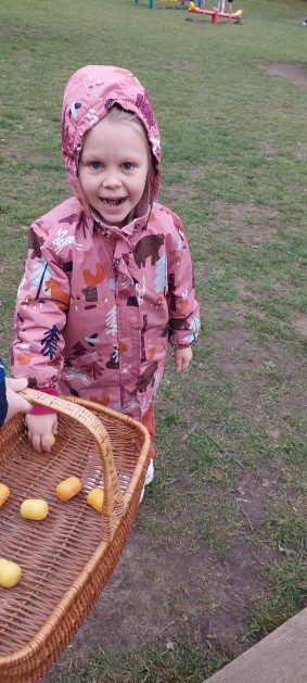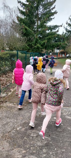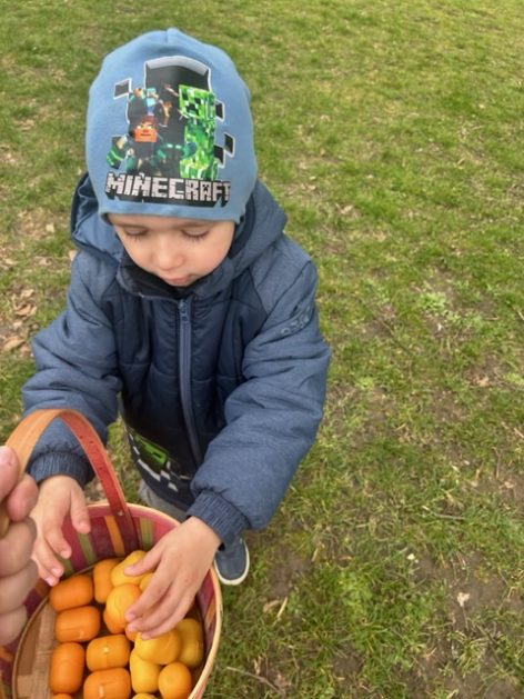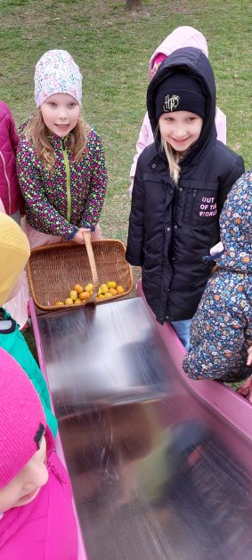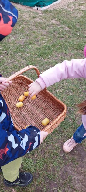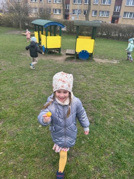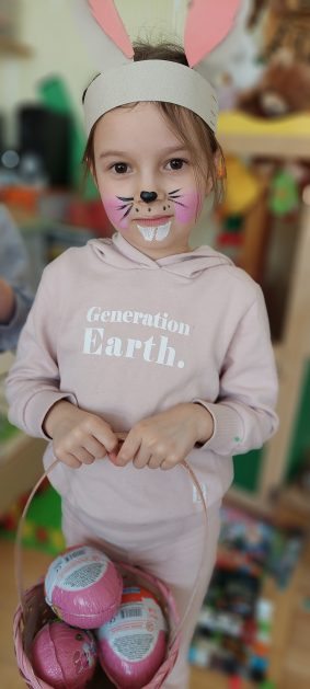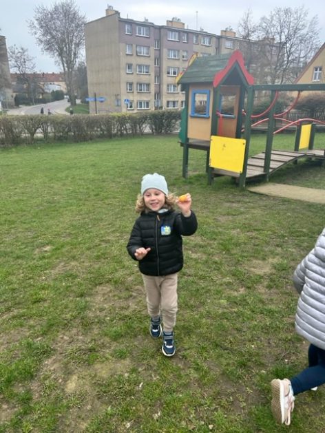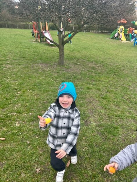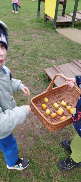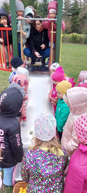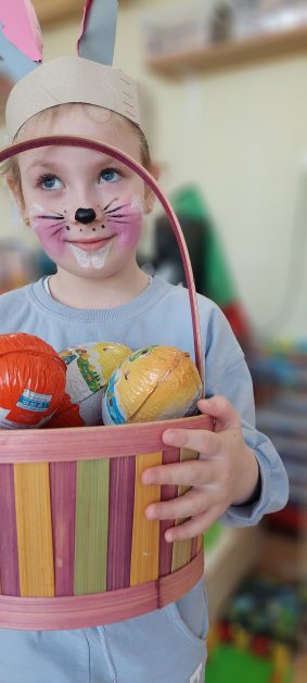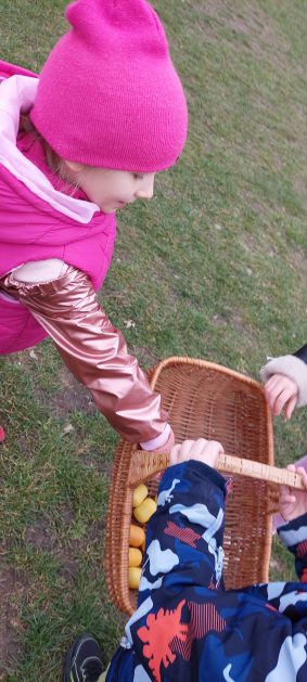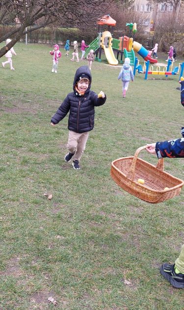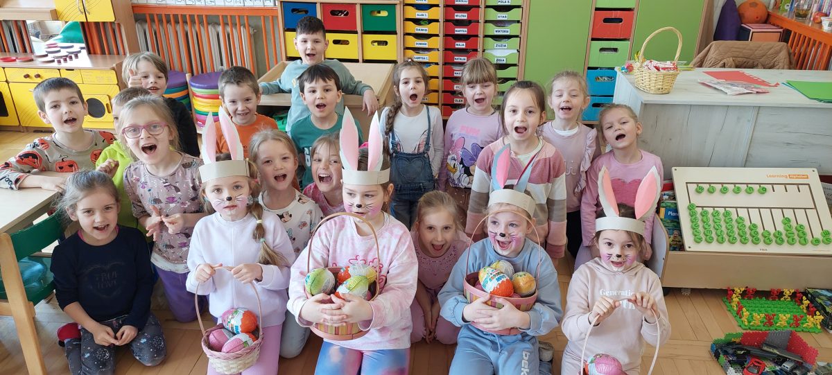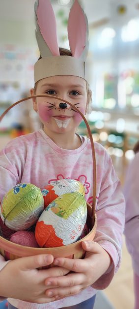 Święta, święta biją dzwony, więc zajączek ucieszony dużo pracy ma! Tak szybko biegł przy naszym przedszkolu, że pogubił mnóstwo czekoladowych jajeczek. Dzieci wiedziały co mają zrobić! Wyruszyły do ogrodu przedszkolnego, rozbiegły się i zaglądały w każdy kąt, pod każdy krzaczek. Ale zabawa! Liczysz ty, liczę ja, kto więcej jajeczek ma…Małe jajeczka zebrane i skonsumowane, a w przedszkolu „najstarsze zajączki” rozdawały jeszcze prezenty wraz z Panią dyrektor.