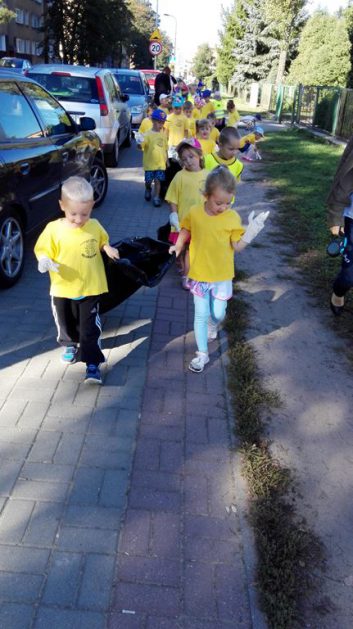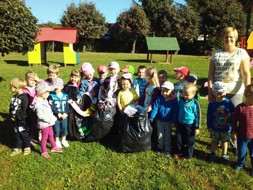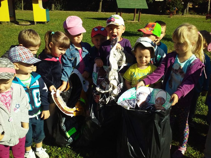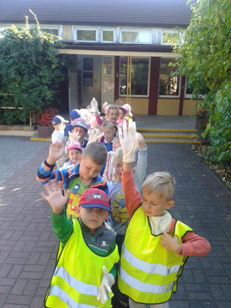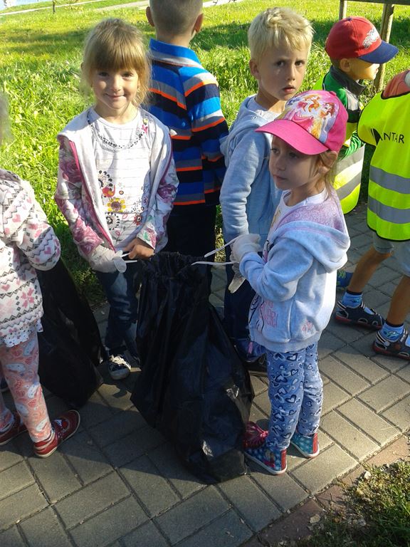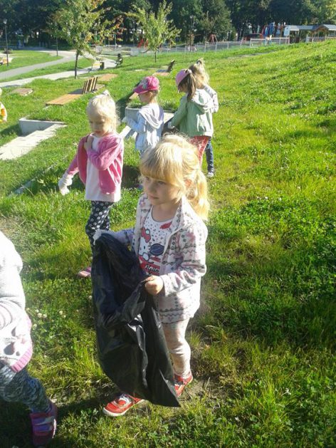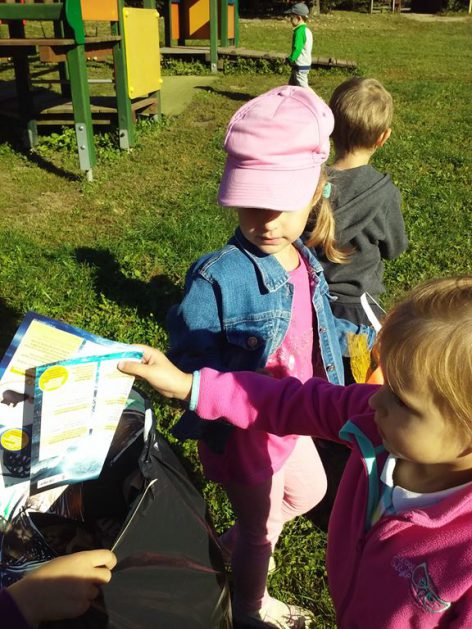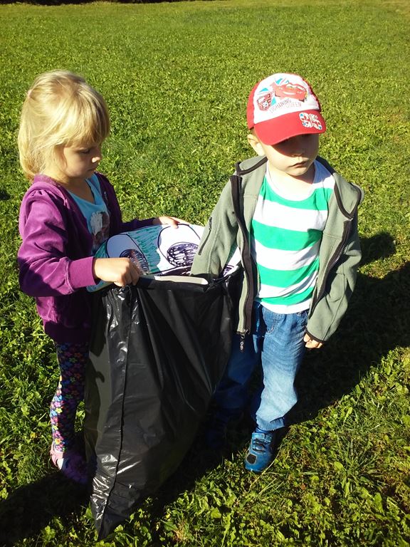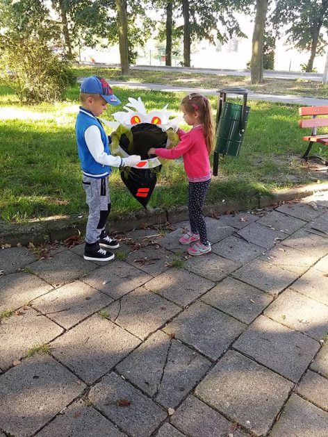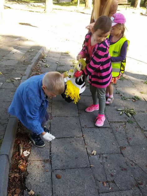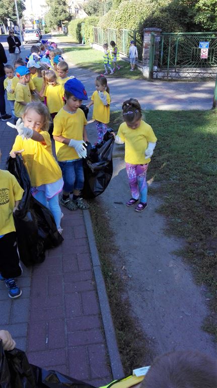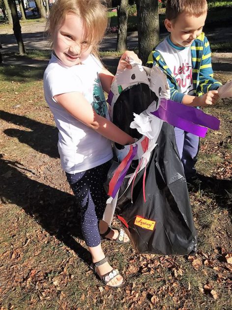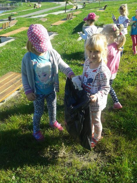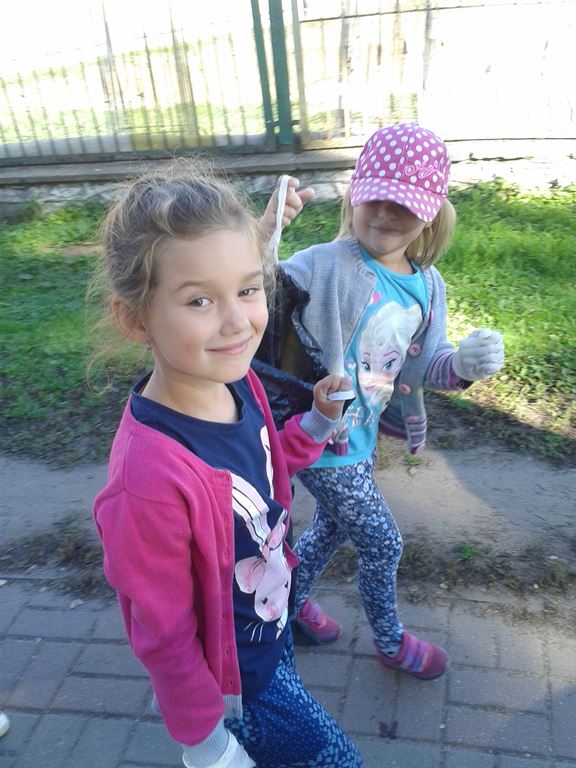 Przyroda woła o pomoc – 5 i 6 latki są gotowe, gdyż oficjalnie 16 września wstąpiły do Ligii Ochrony Przyrody. Nasze przedszkolaki zaopatrzone w rękawice, worki – „śmieciojady” ruszyły sprzątać najbliższe otoczenie.