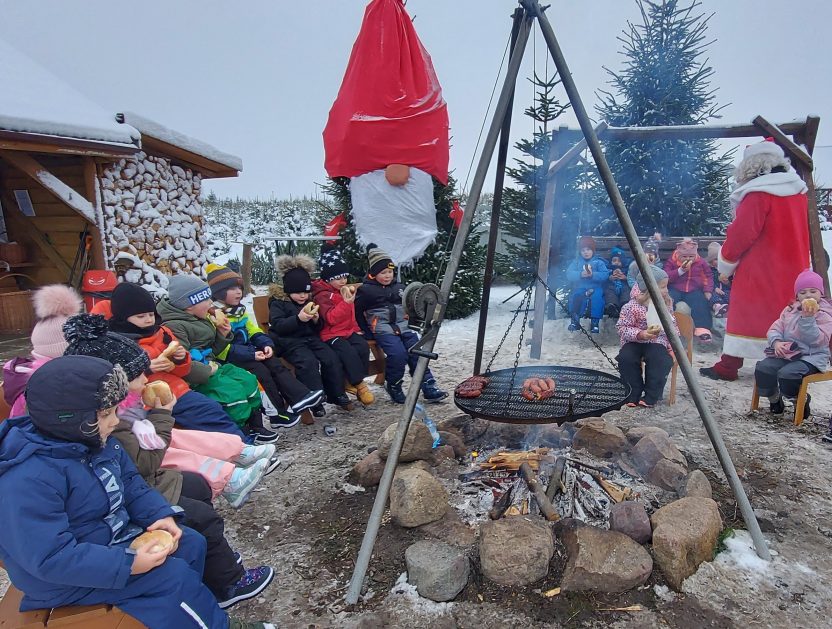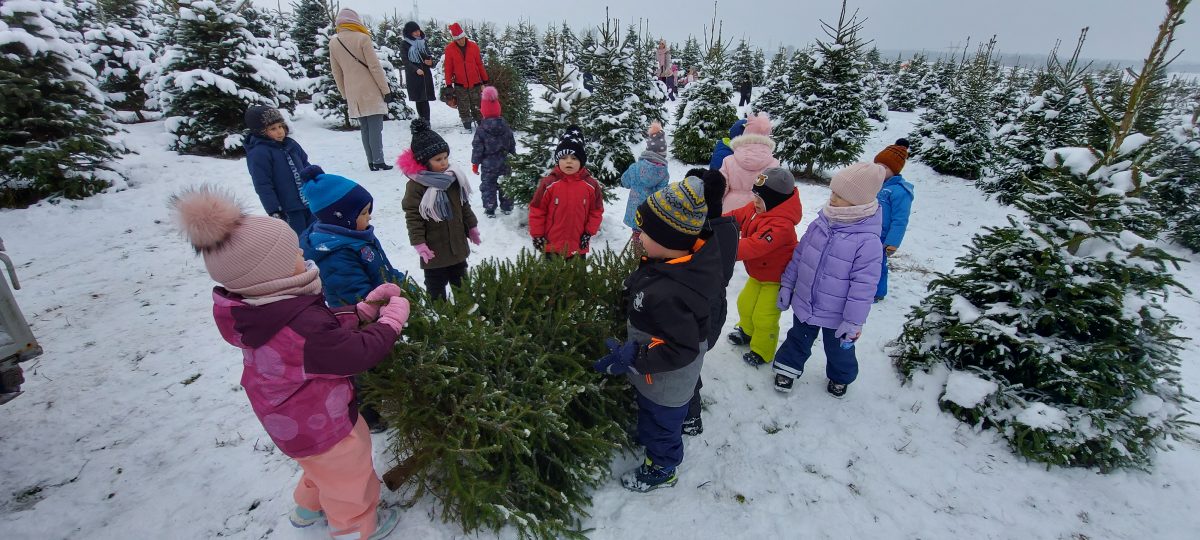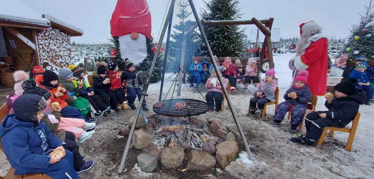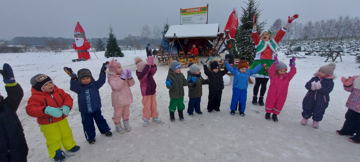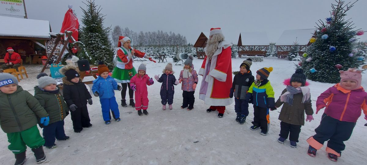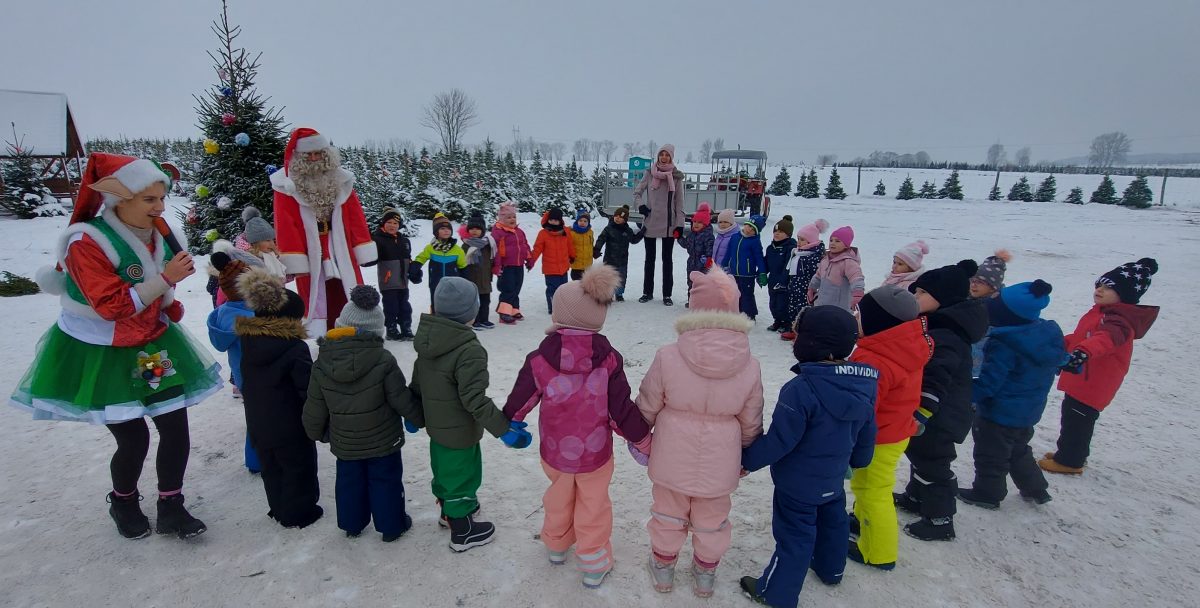 W tym tygodniu 4 latki „K” i „P” skorzystały z zaproszenia Państwa Fil i odwiedziły plantację choinek „Danko” w Wielisławicach, ok. 10km od Szczecinka. Przedszkolaki miały okazję poznać niektóre gatunki rosnących tam drzew iglastych i przejechać się zabytkowym ciągnikiem. Największą atrakcją było jednak szukanie tej najpiękniejszej, wyjątkowej choinki, która ma być ozdobą sali i wraz z dziećmi oczekiwać na Święta Bożego Narodzenia. Choinka wybrana, dzieci zadowolone, zmęczone i głodne…wszystkie z apetytem zjadły kiełbaski z ogniska! Pobyt na plantacji umilił dzieciom Mikołaj i jego Elf.