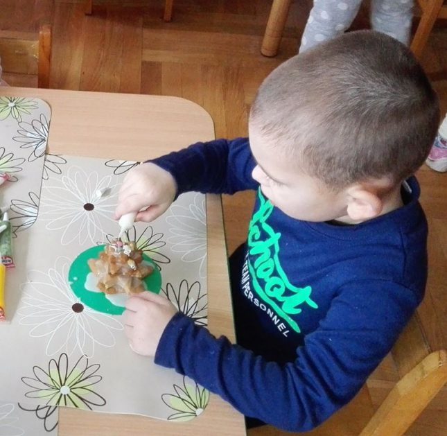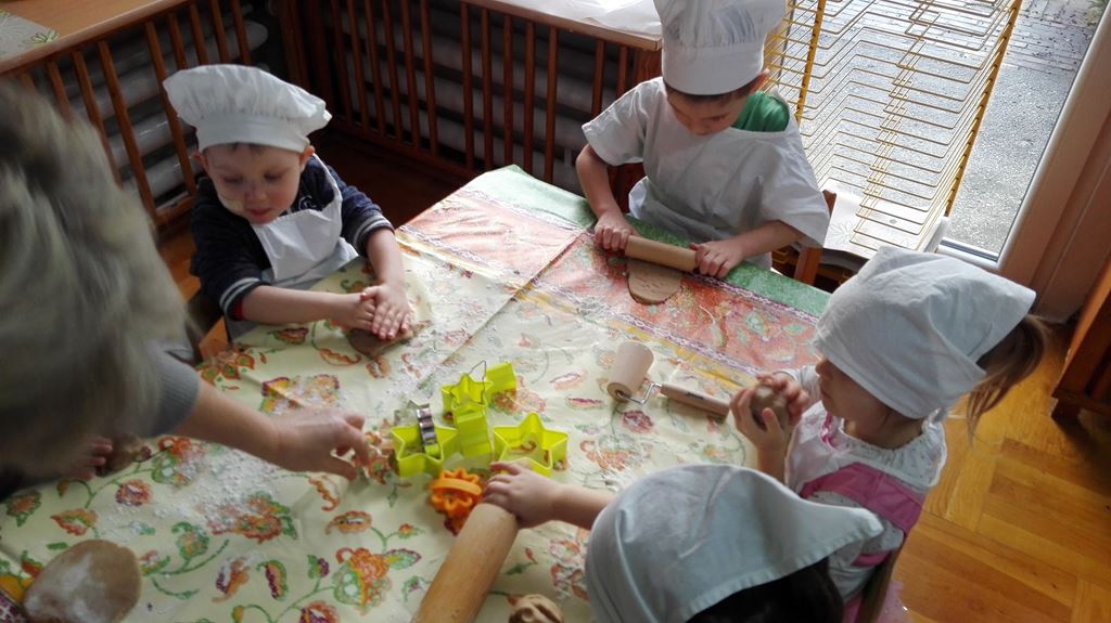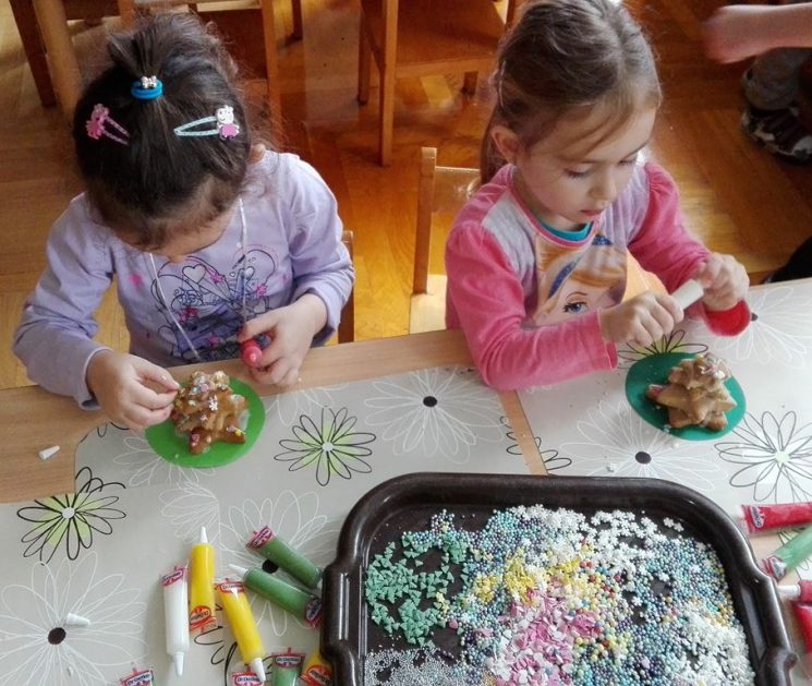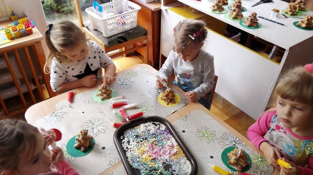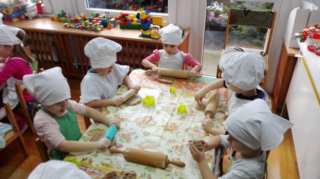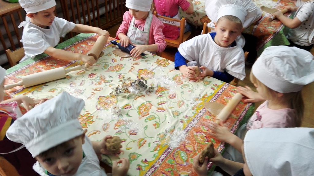 …ponieważ w grupie 4 latków P. Justynki dzieci przygotowywały się do pieczenia pierniczków na Święta Bożego Narodzenia. Dzieci najpierw zadbały o czyste rączki, później nałożyły fartuszki. Razem z P. Justynką poznały wszystkie składniki, które będą potrzebne do zrobienia pierniczków. Z wielkim zapałem i zaangażowaniem zabrały się do wałkowania ciasta i wykrawania świątecznych wzorów z foremek o różnych kształtach. Efektem pracy były blaszki pełne pierników, które piekły się pod czujnym okiem naszych pań kucharek. Końcowy efekt to dekoracja – i tu dzieci uruchomiły swoją wyobraźnię, powstały kolorowe cudeńka.