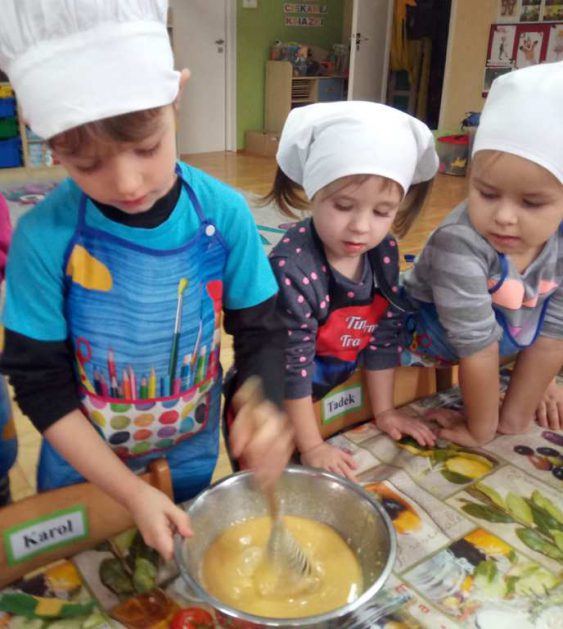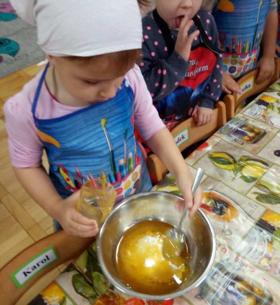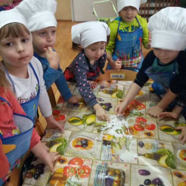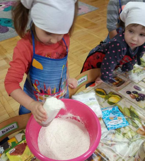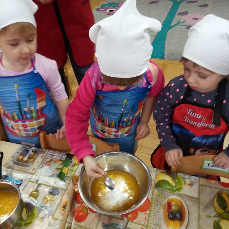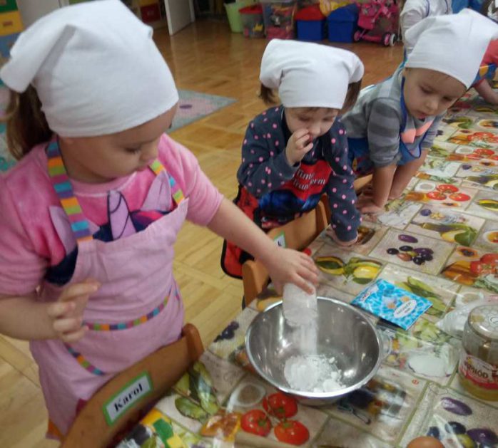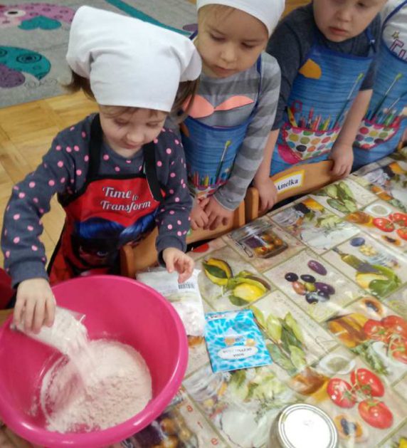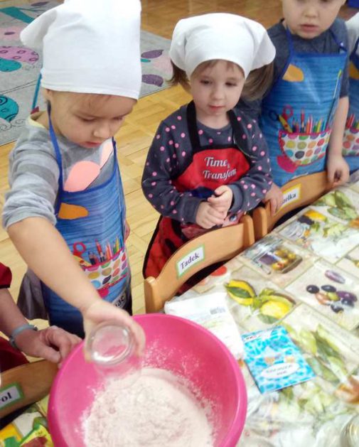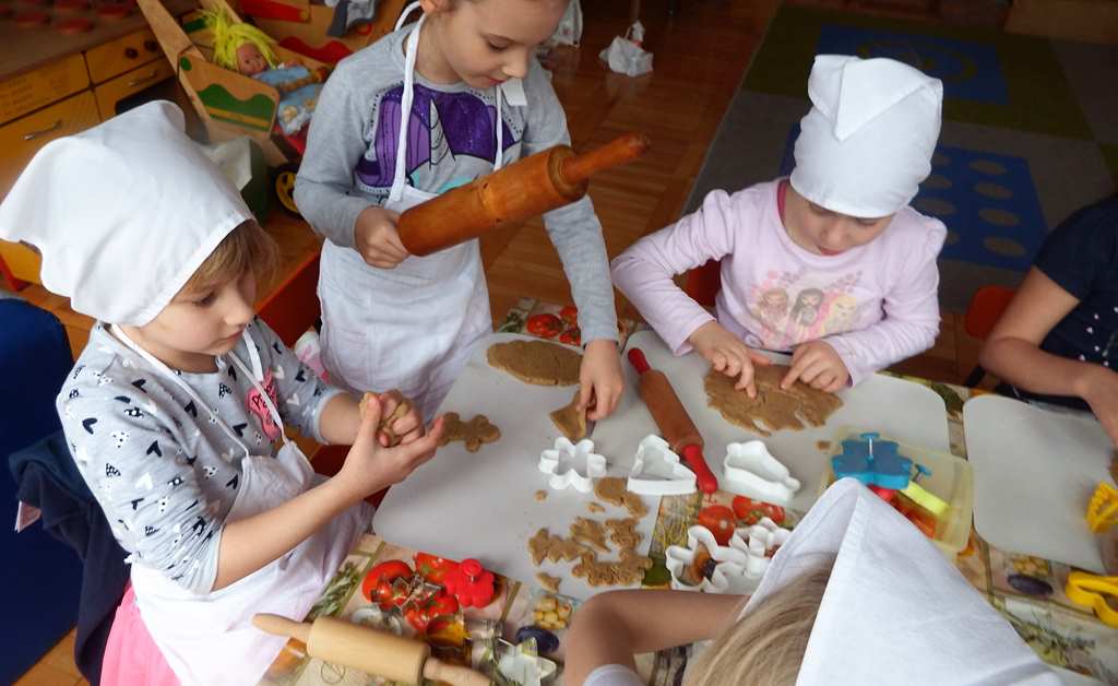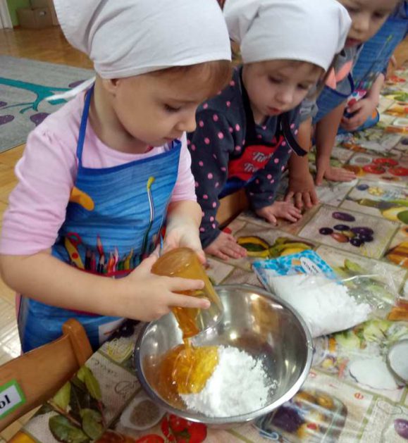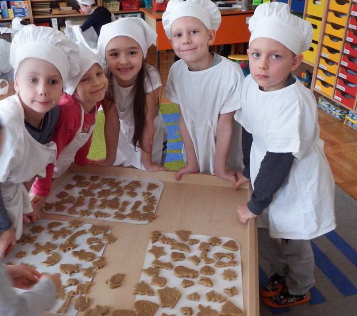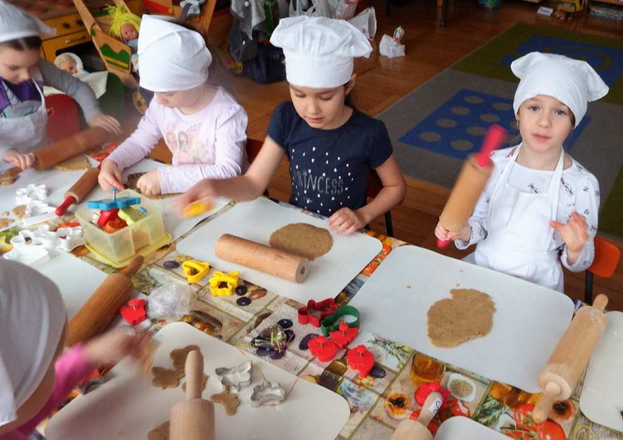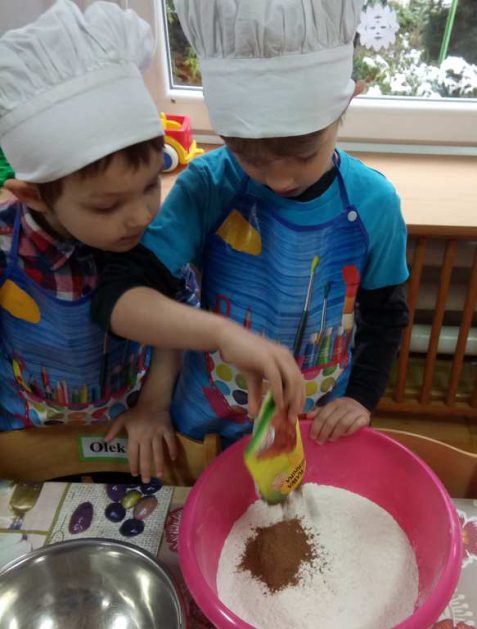 … a wraz z nimi czas na świąteczne wypieki. 4 – latki i starszaki próbowały swoich sił kulinarnych podczas pieczenia ciasteczek piernikowych. Poznały podstawowe składniki, sposoby odmierzania produktów i zapachy, które zawsze będą kojarzyły się ze świętami… przyprawa do pierników: cynamon, goździki, imbir, gałka muszkatołowa, kardamon.
