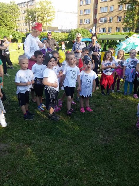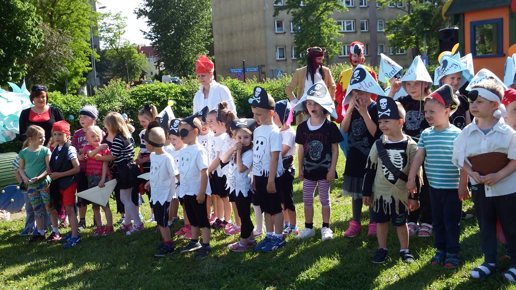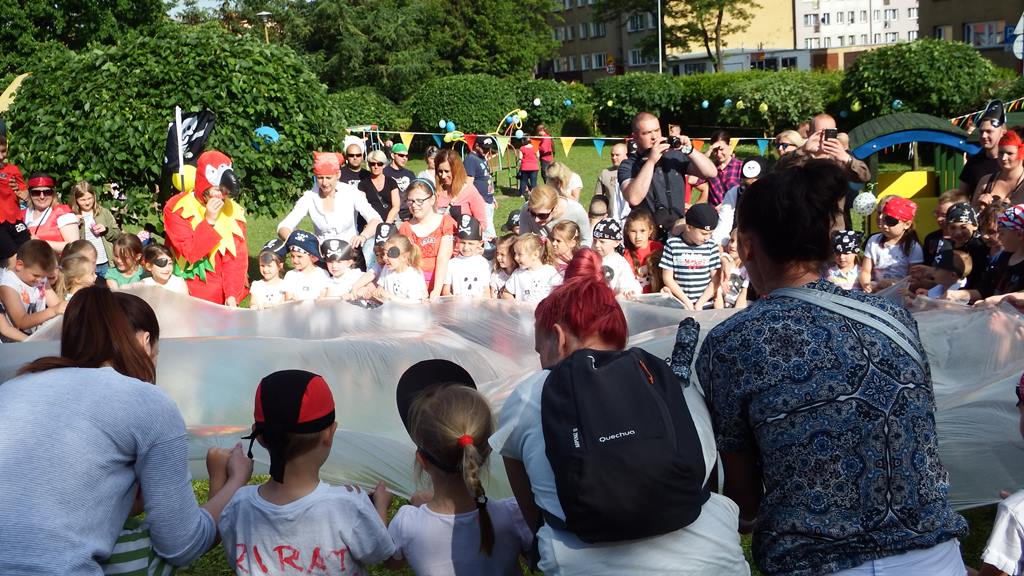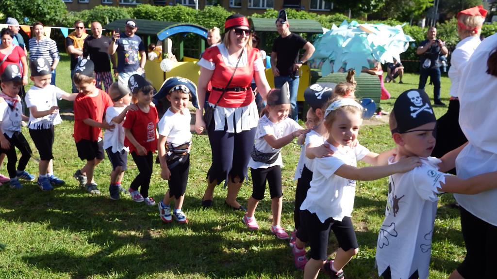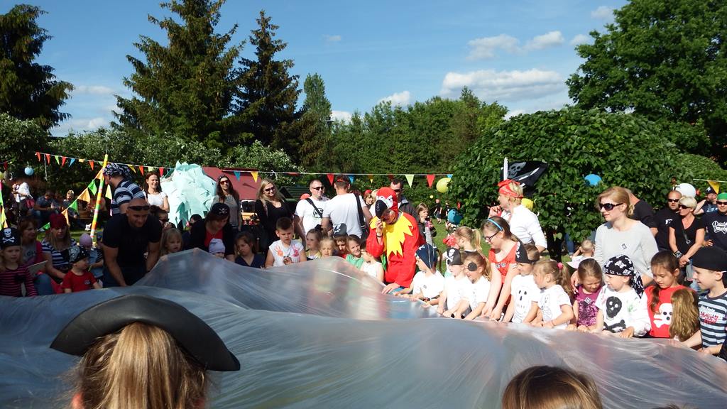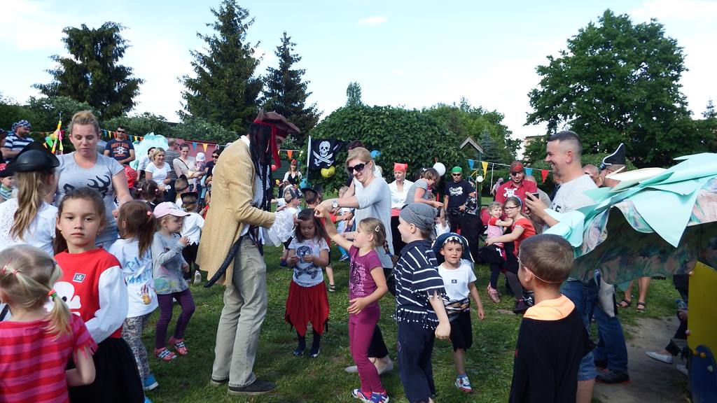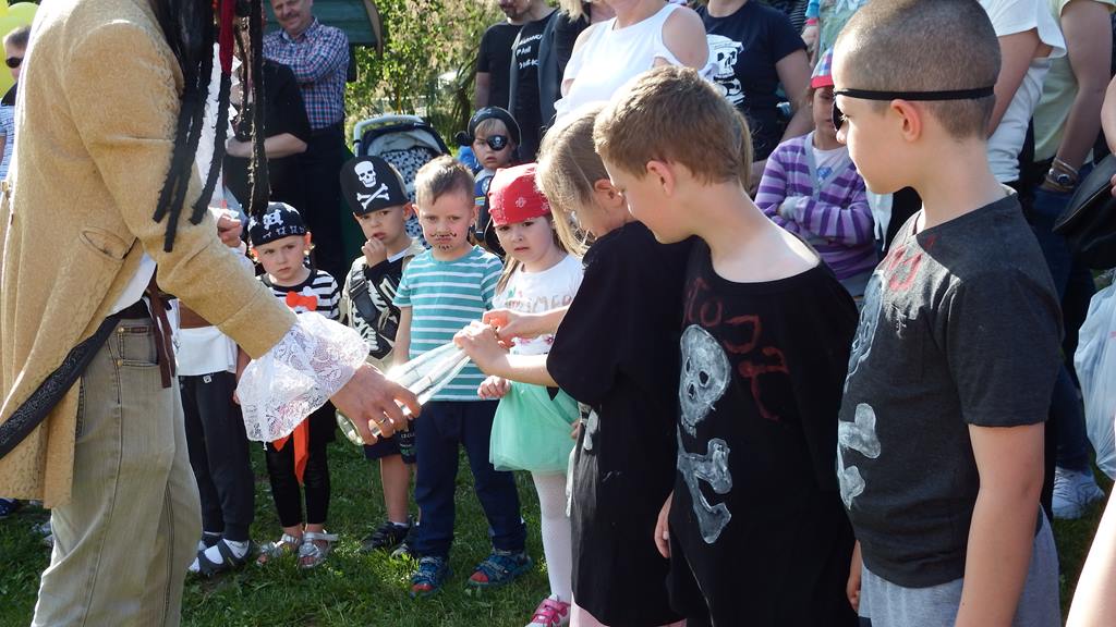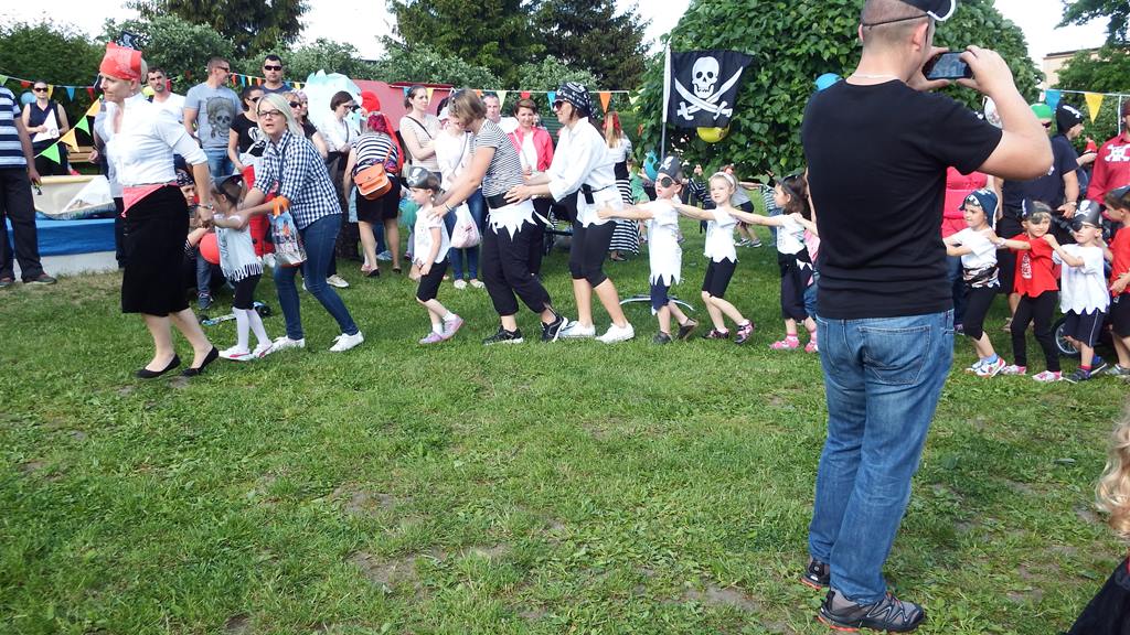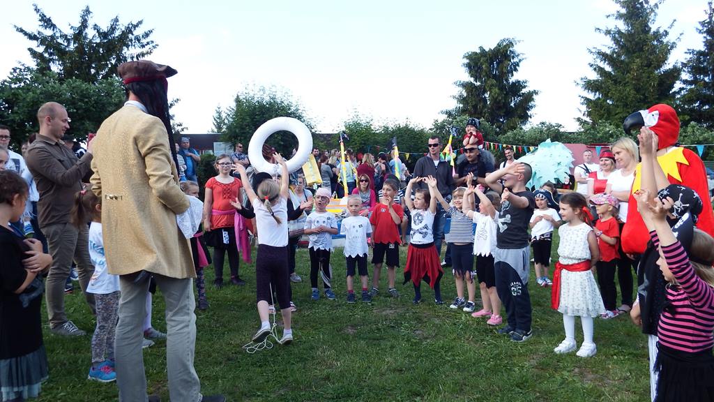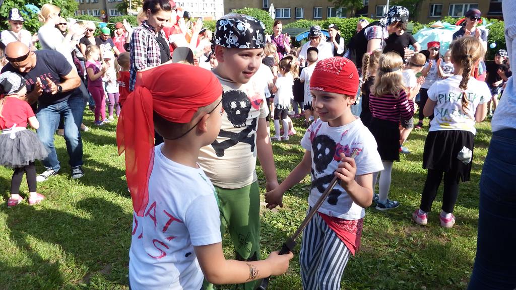 5 czerwca odbył się w naszym przedszkolu piknik rodzinny pod hasłem „Mamo, tato bądź piratem”. Rodzice wraz ze swoimi pociechami przygotowali sobie przebrania, aby wspólnie wyruszyć na wyprawę pod okiem kapitana Haka i Papużki Ary – animatorów z Koszalina. Na początku milusińscy pochwalili się swoimi umiejętnościami artystycznymi, zaśpiewali i złożyli swoim kochanym rodzicom życzenia. Później była zumba i wiele innych atrakcji dla rodziców i dzieci. Kulminacyjnym momentem było ogłoszenie przez Panią dyrektor wyników konkursu czytelniczego w grupach, w ramach akcji Cała Polska Czyta Dzieciom. Gratulacje dla najbardziej zaangażowanych rodziców otrzymali rodzice z grupy pani Hani i Pani Justyny – I miejsce, dla Pani Uli – II miejsce, dla Pani Kasi – III miejsce i IV miejsce – dla Pani Asi.